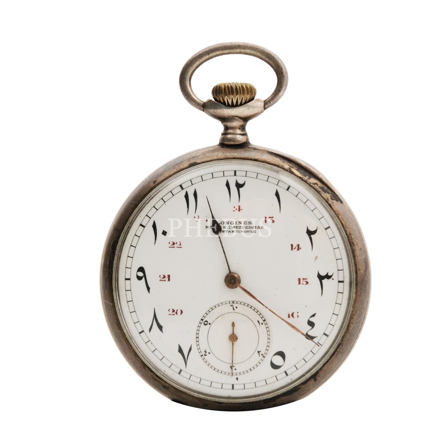 Arka kapağı K.A insiyalli, Osmanlı Pazarı´nda Longines firmasının o dönemdeki distribütörü "Nacib K. Djezvedjian- Constantinople" yazılı Osmanlıca kadrana sahip gümüş kasalı cep saati, Mekanizma seri numarası: 4275651