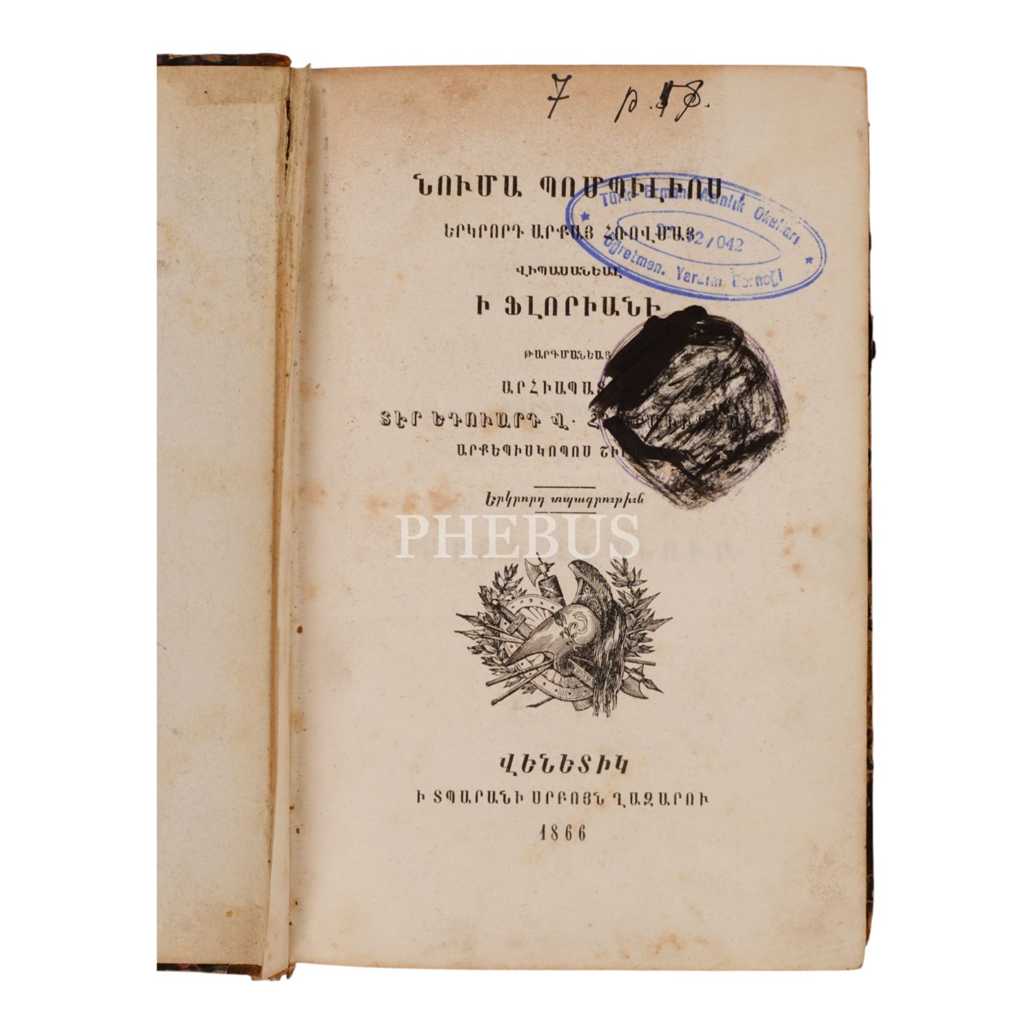 NUMA BOMBİLİOS, Rahip Yetvart Hürmüz, 1866, Venedik: Surp Ğazar Matbaası, sayfa 372, 13x19.5cm…