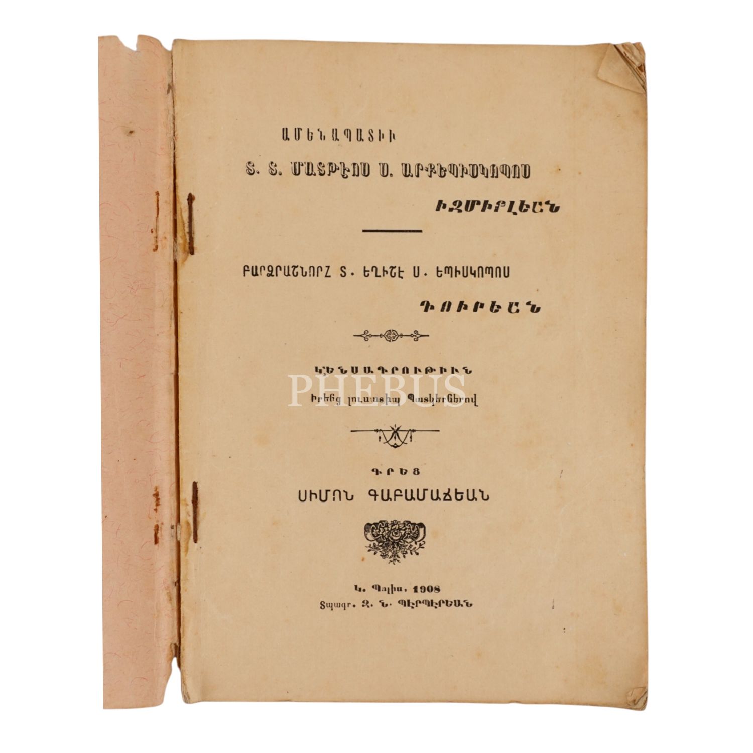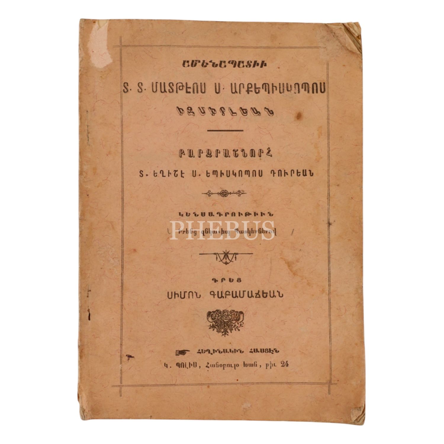 AMENABADİV D. D. MADTEOS S. ARKYEBİSGOBOS İZMİRLİYAN,1908, Simon Kapamacıyan, İstanbul: Berberyan Matbaası, sayfa 40, 14x19cm..