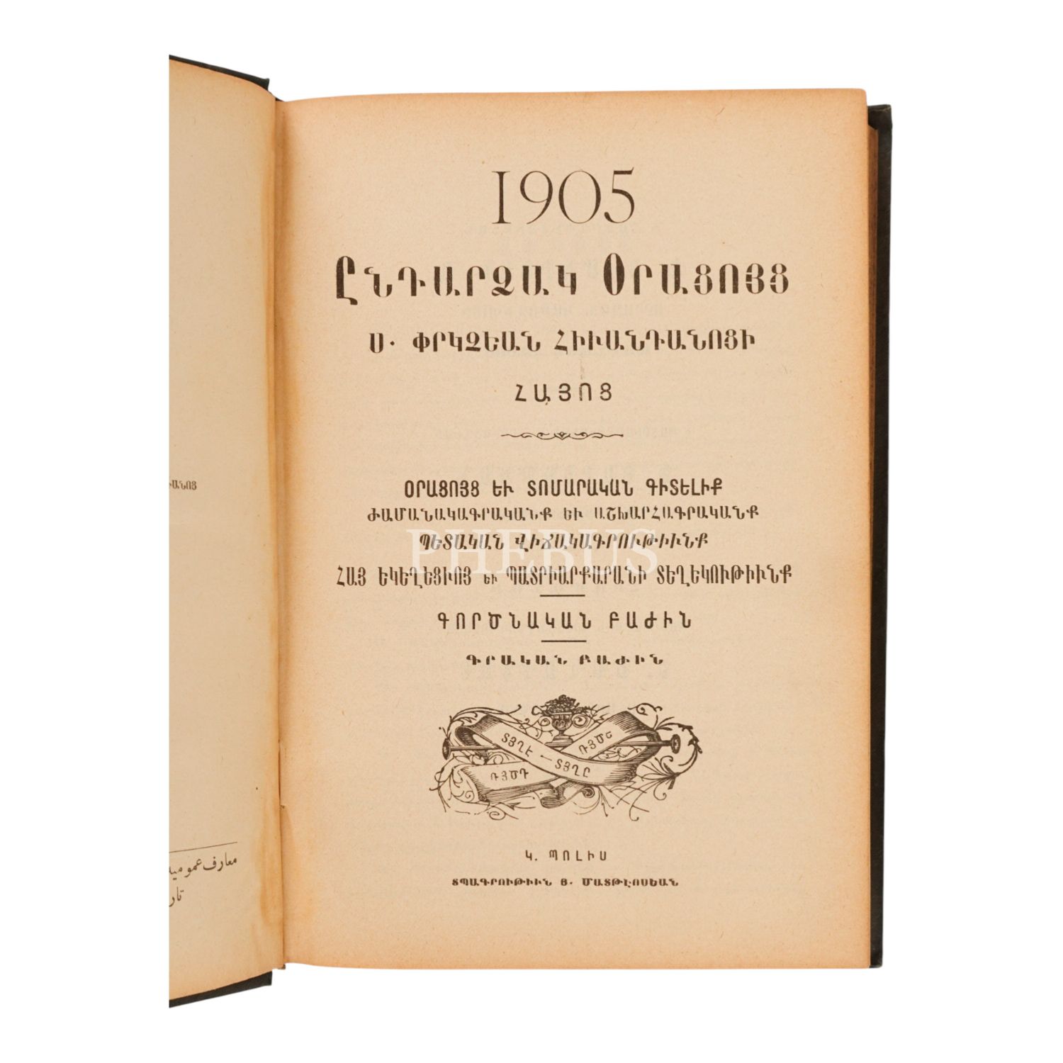1905 INTARTSAG ORATSUYTS SURP PIRGİÇYAN HİVANTANOTSİ HAYOTS (1905 SURP PIRGİÇ ERMENİ HASTANESİ GENEL SALNAMESİ), 1905, İstanbul: Madteosyan Matbaası, sayfa 512, 12x18cm…