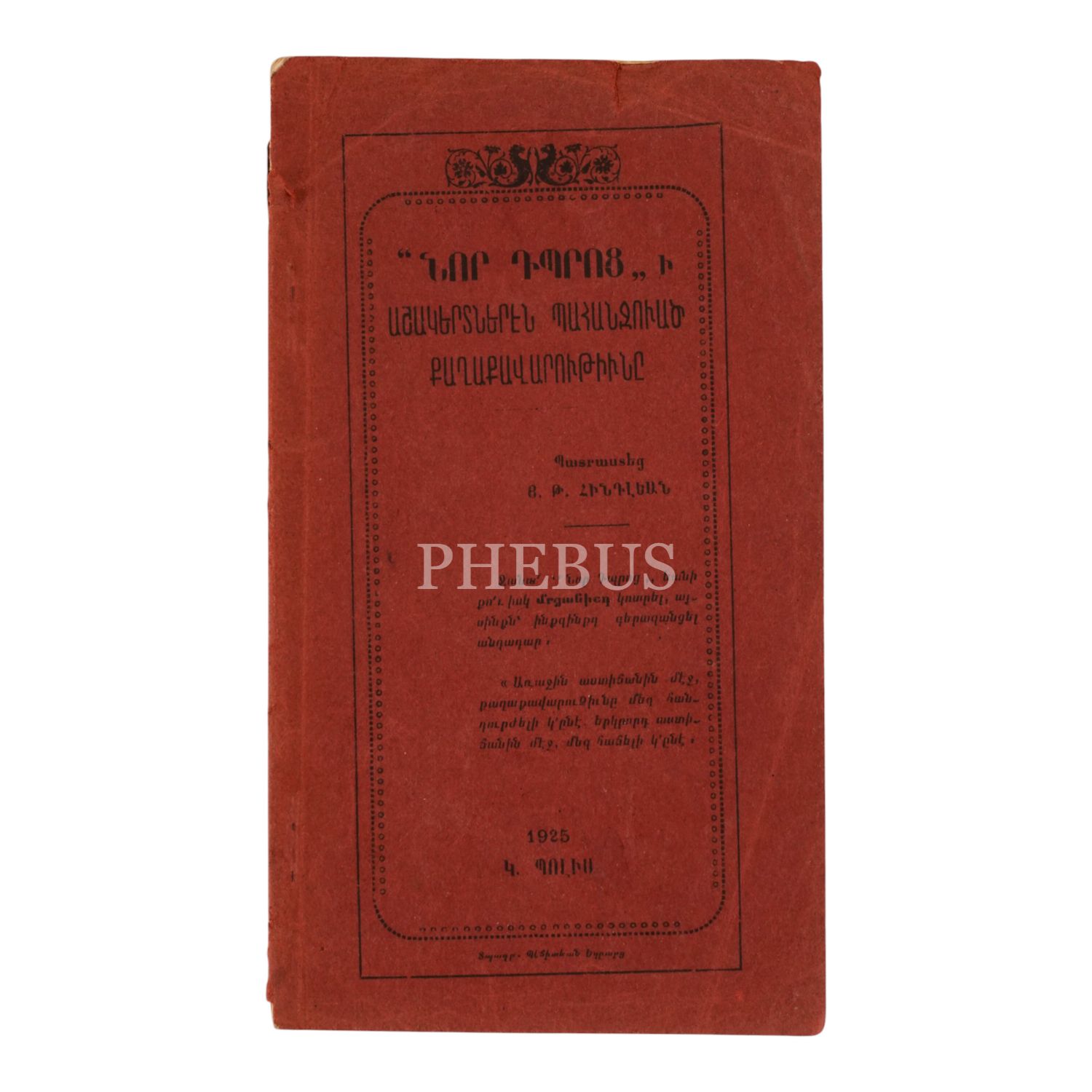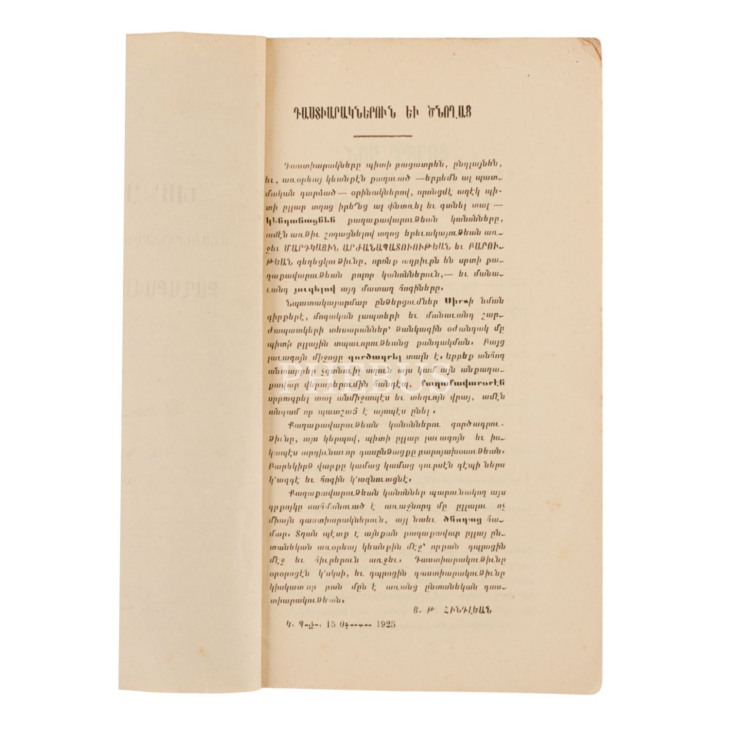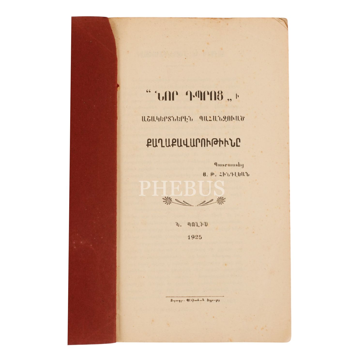 NOR TBROTSİ AŞAGERDNEREN BAHANÇIVADZ KAĞAKAVARUTYUNI (NOR TBROTS ÖĞRENCİLERİNDEN TALEP EDİLEN GÖRGÜ), H. T. Hintliyan, 1925, İstanbul: Becidyan Matbaası, sayfa 30, 11.5x20cm…