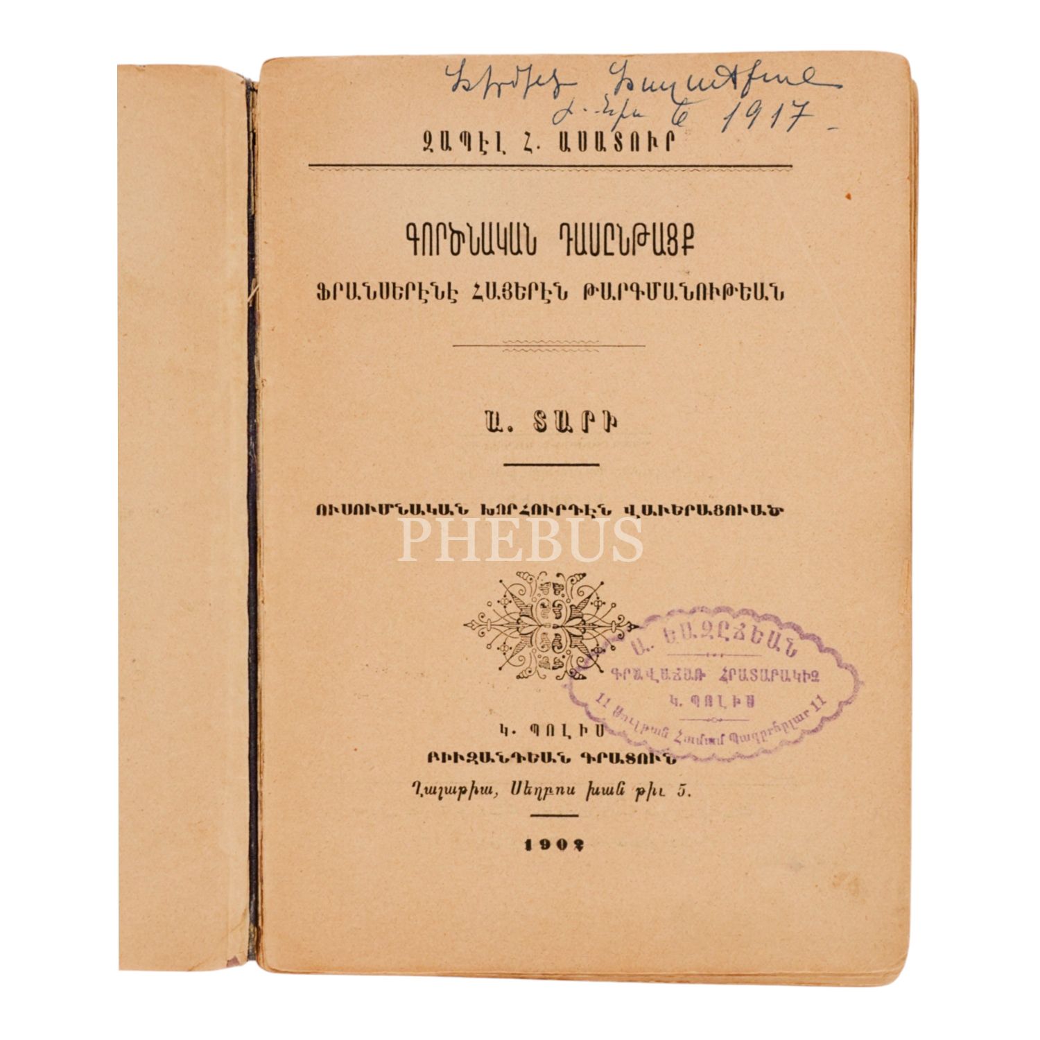 KORDZNAGAN TASINTATSK FRANSERENE HAYEREN TARKMANUTYAN (FRANSIZCADAN ERMENİCEYE ÇEVİRİDE KULLANIŞLI EL KİTABI), 1. Cilt, Zabel Asadur, 1902, İstanbul: Püzantiyon Basımevi, sayfa 87, 12x17cm…