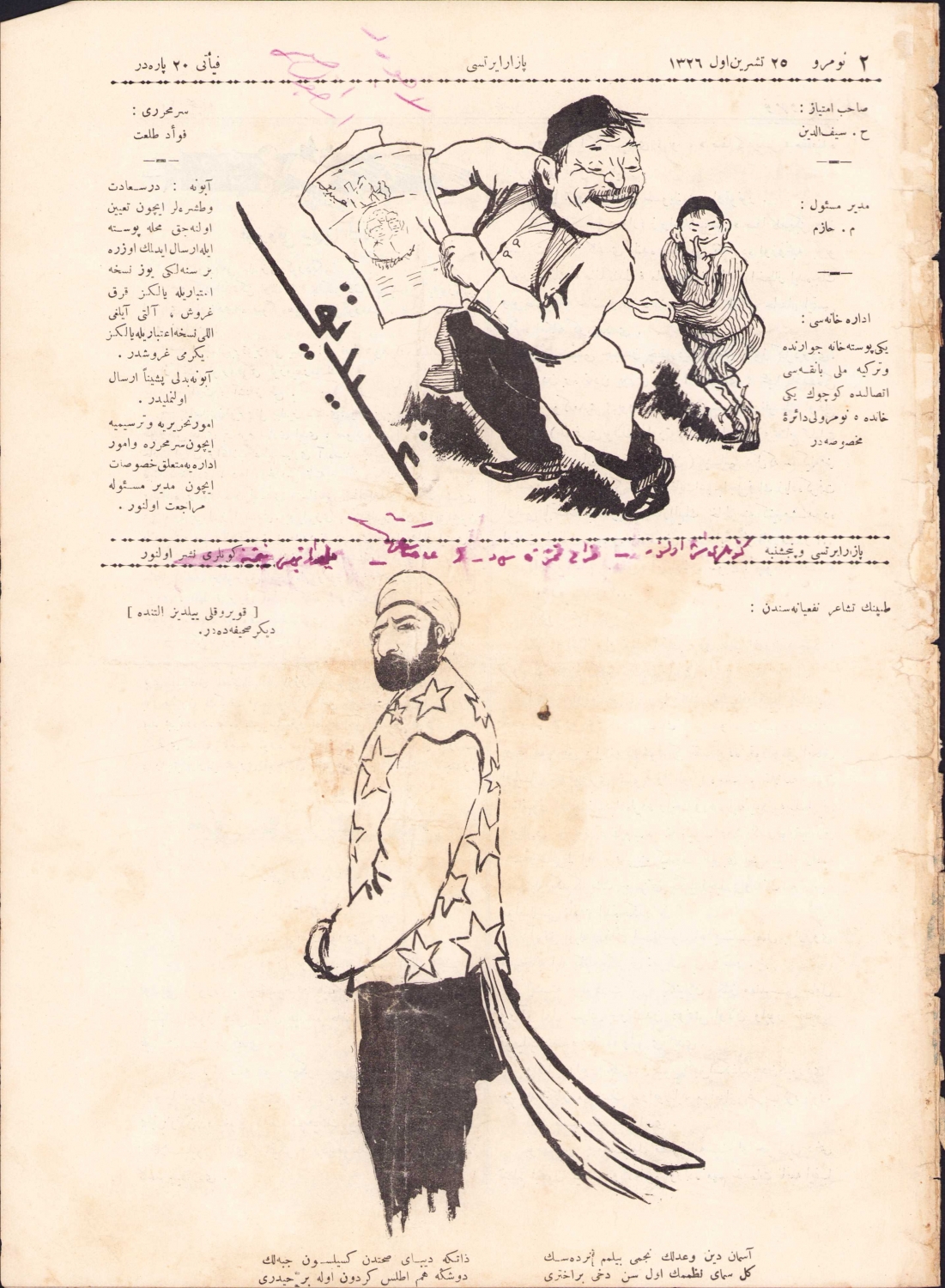 Osmanlıca Gıdık mizah gazetesi, kapak, Kuyruklu Yıldız altında ! Tanin Matbaasından Fazıl Ahmet'in Divançe-i Fâzıl Der-Vasf-ı Efazıl son dört mısrası yazmakta;