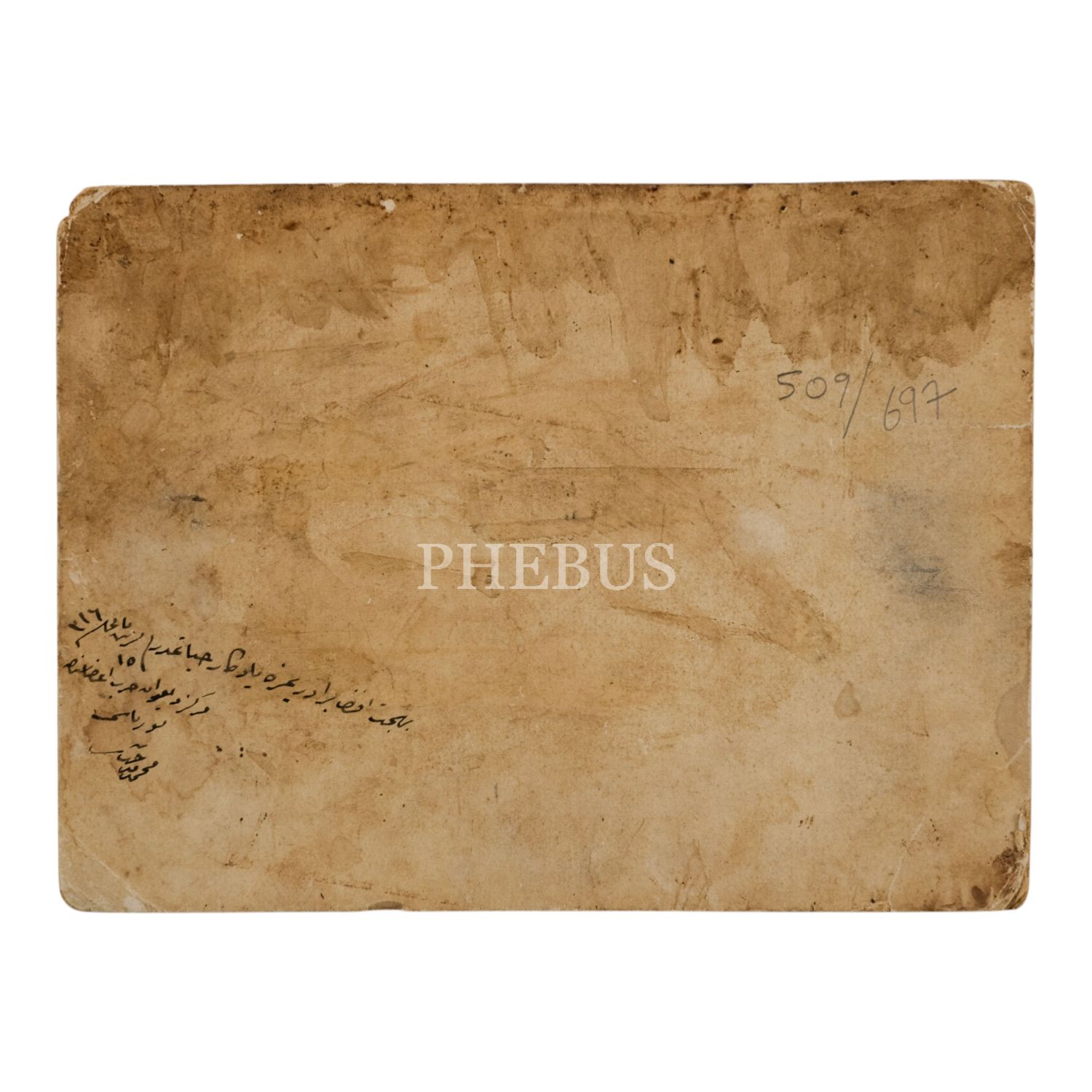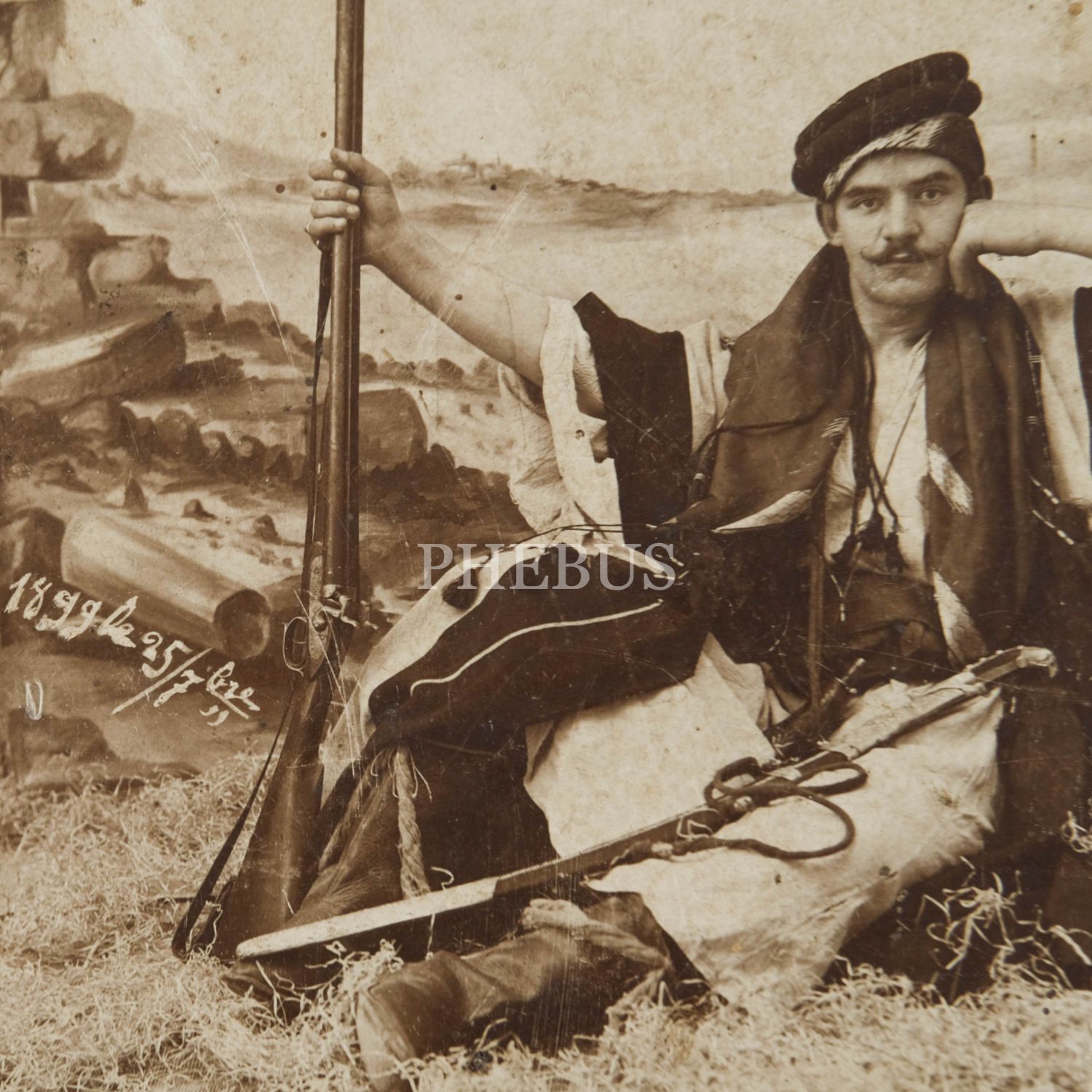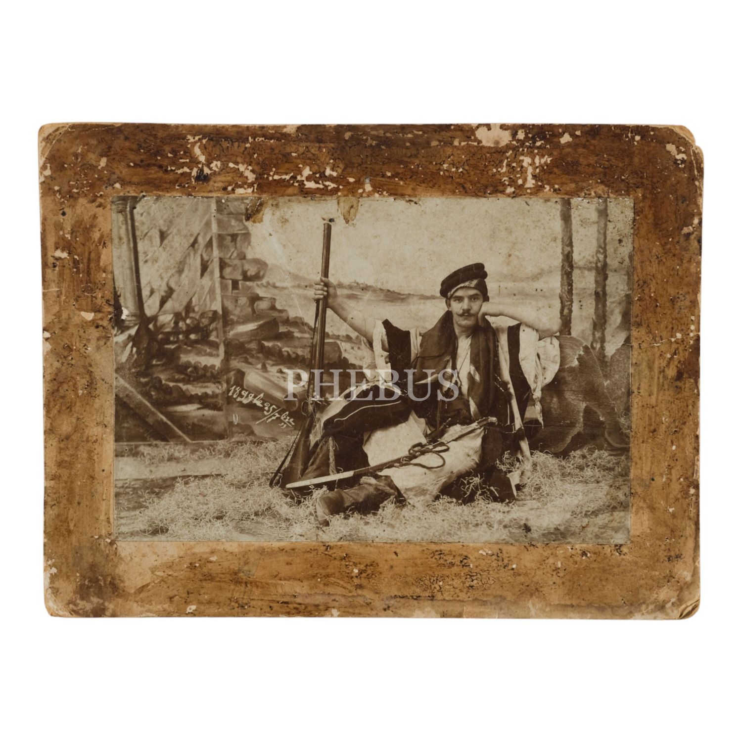Arap coğrafyasında görev yapan bir Osmanlı subayının üniforması ve silahlarıyla birlikte kamera karşısına geçerek çektirdiği hatıra fotoğrafı, 22x17 cm...