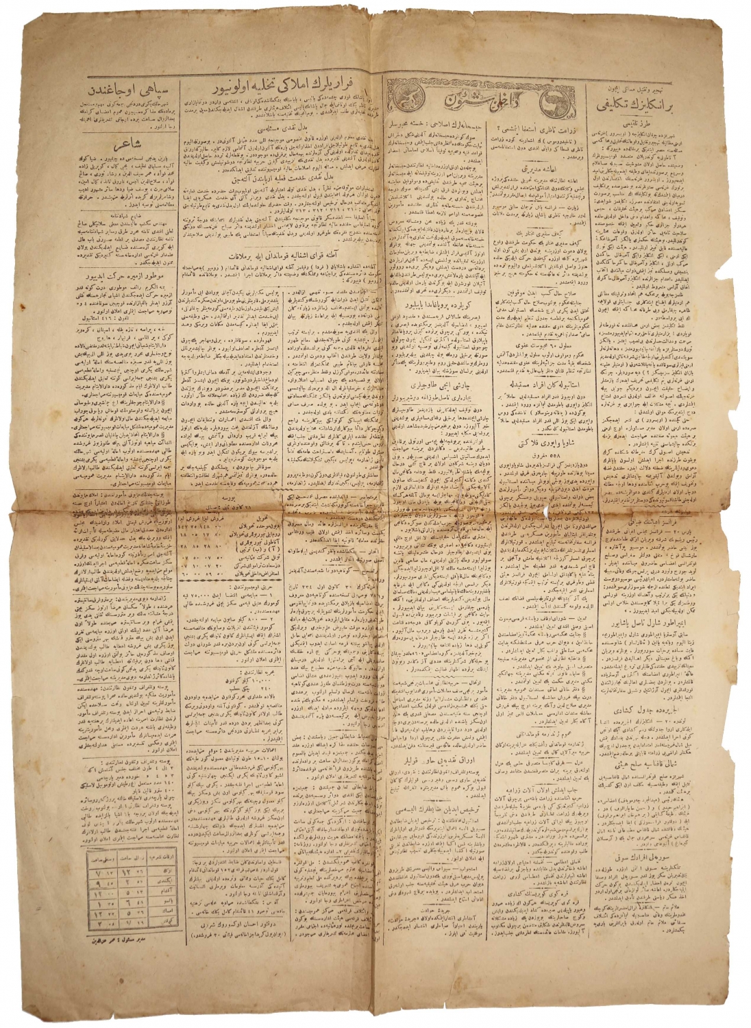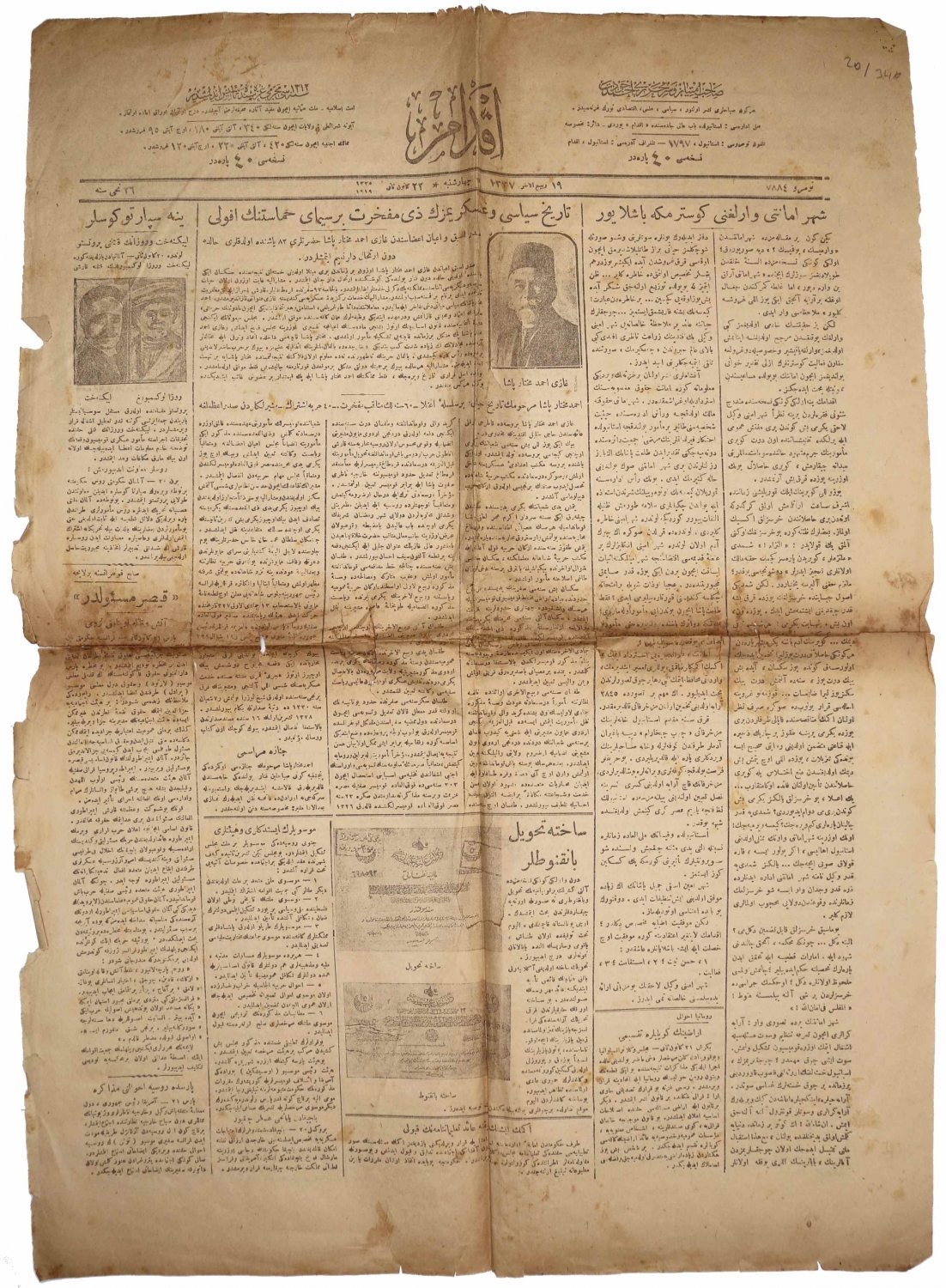 Osmanlıca İkdam gazetesi, 1335, manşetler: "Şehremaneti Varlığını Göstermeye Başlıyor", "Yeni Spartaküsler", haliyle, tek sayfa, 48x68 cm