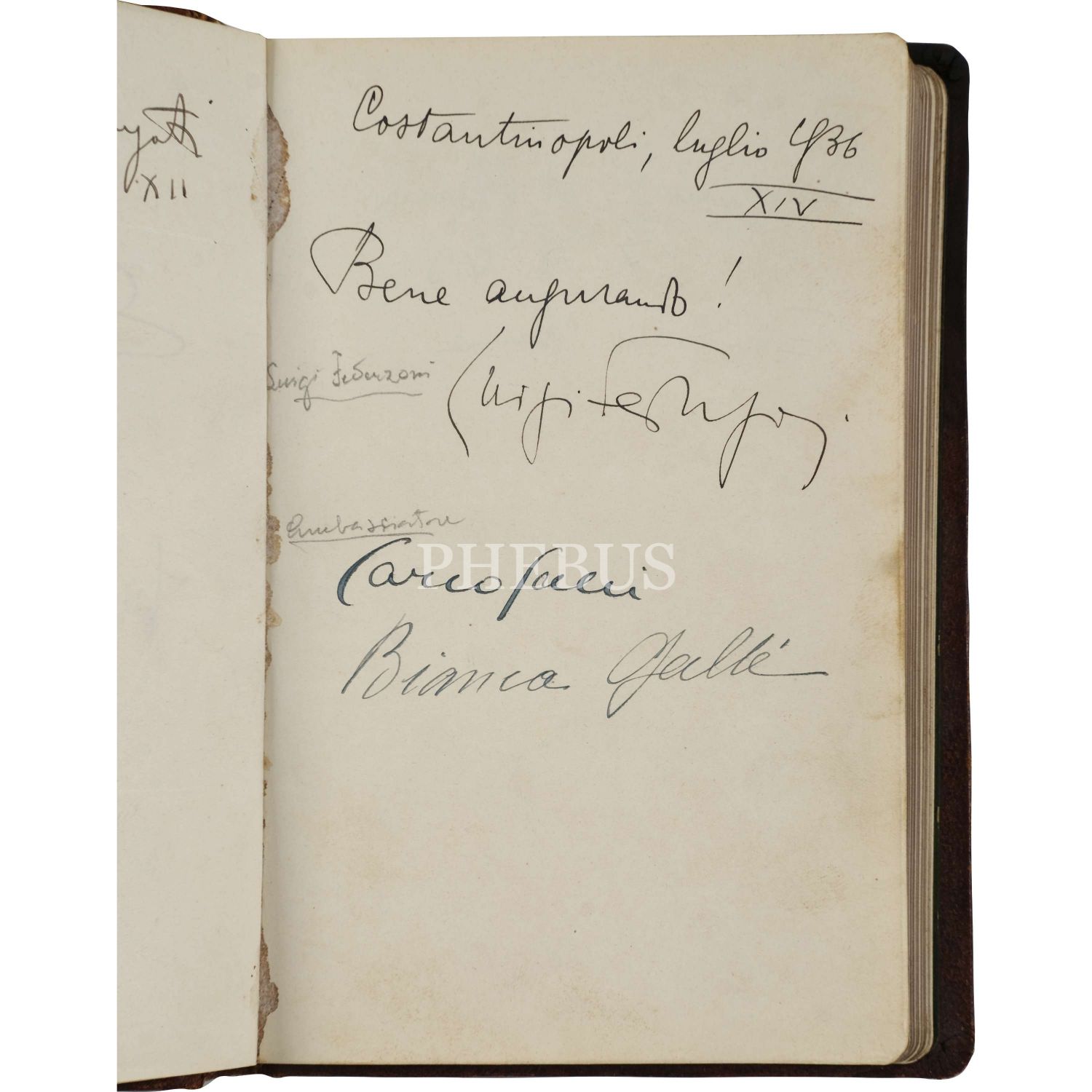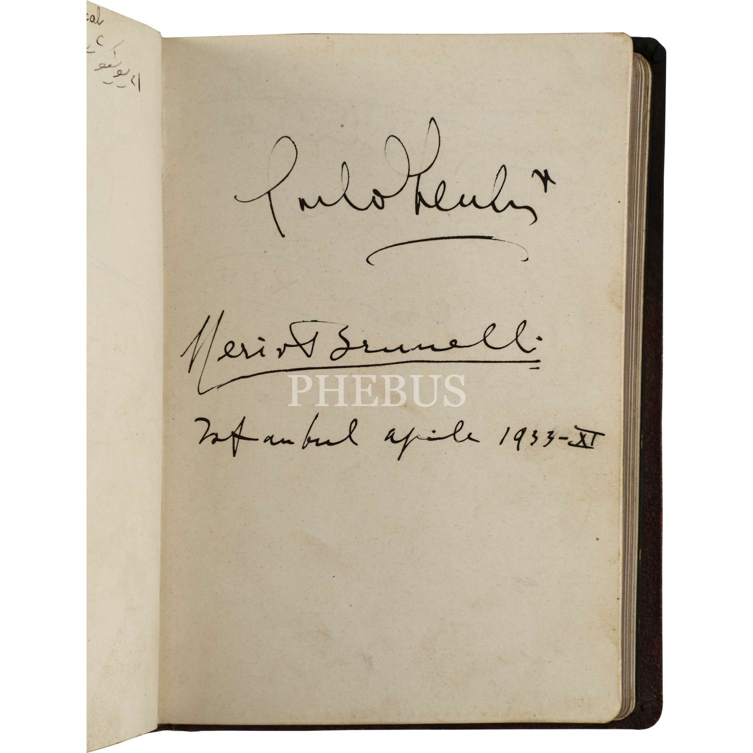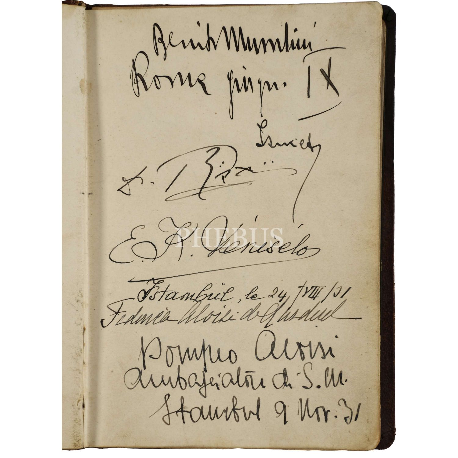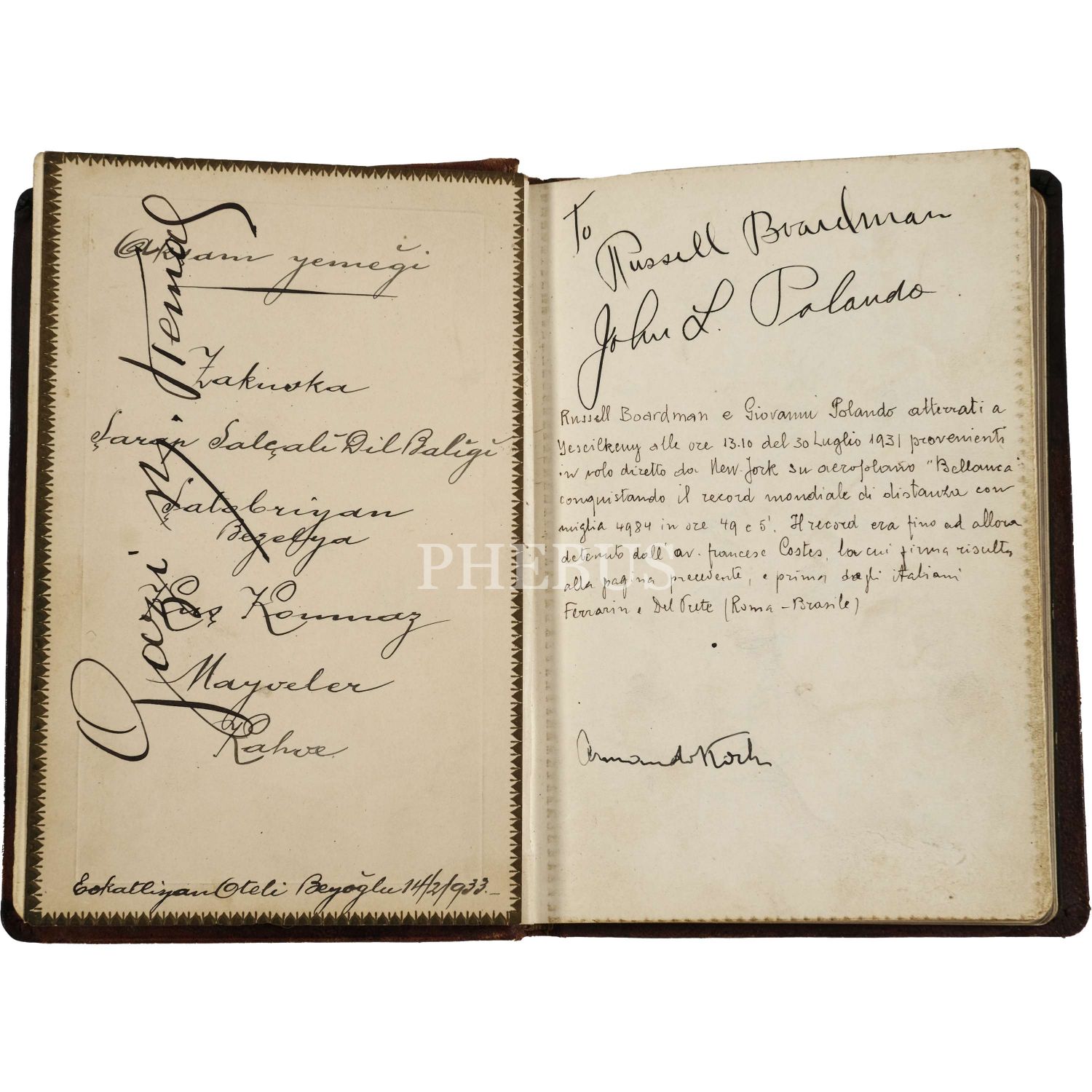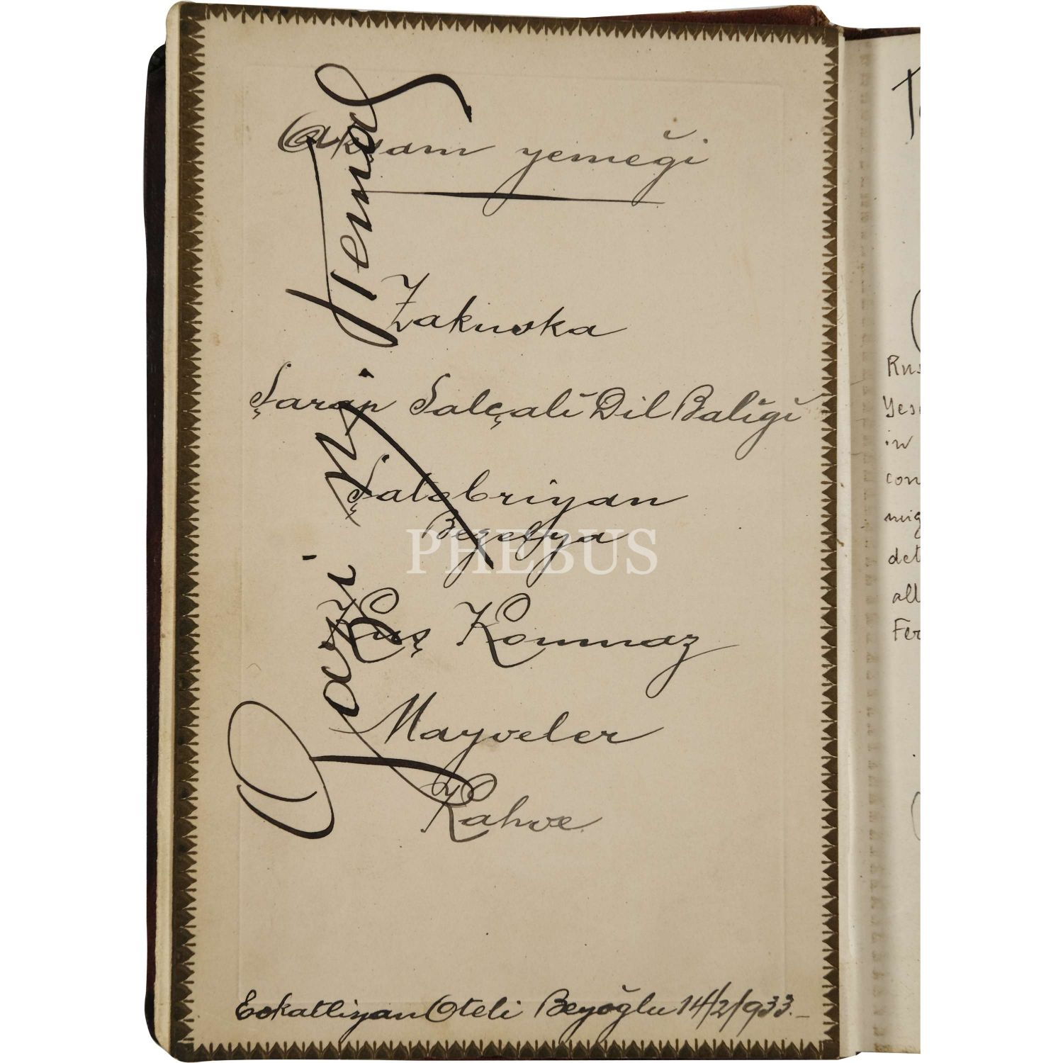 İçinde "Gazi Mustafa Kemal" imzalı menünün de yer aldığı; Eleftherios Venizelos, Amanullah Han, Kral Faysal gibi diplomatik şahsiyetlerin, Fütürizm akımının kurucusu İtalyan şair F. Marinetti'nin ve çok sayıda yazar ve şairin imzaladığı defter, 1931-1954, 22 sayfası dolu, 13x18 cm...