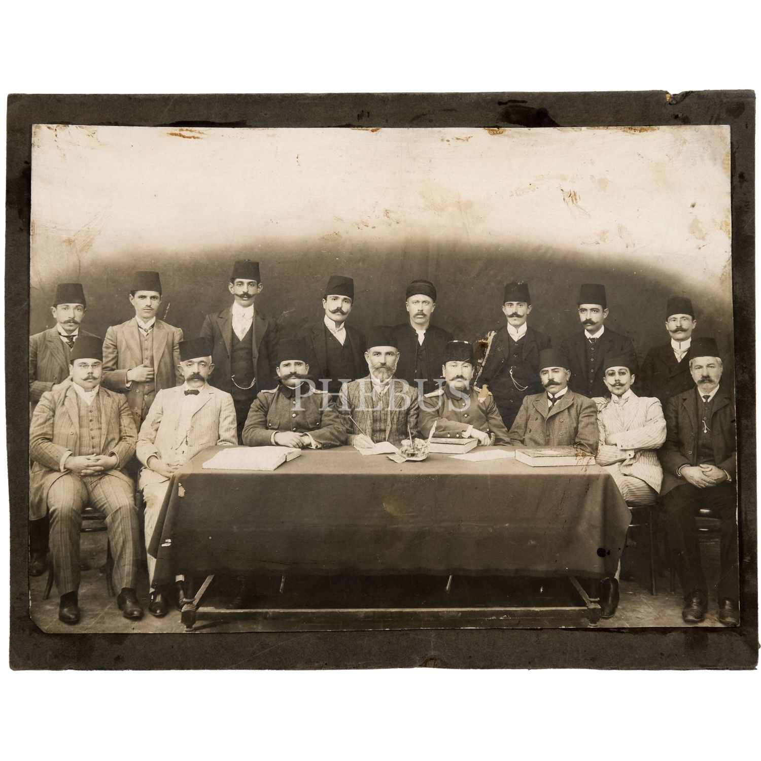 "Hürriyet Kahramanı" namıyla bilinen Resneli Niyazi´nin de aralarında bulunduğu asker ve devlet görevlilerinin hatıra fotoğrafı, 25x18 cm...