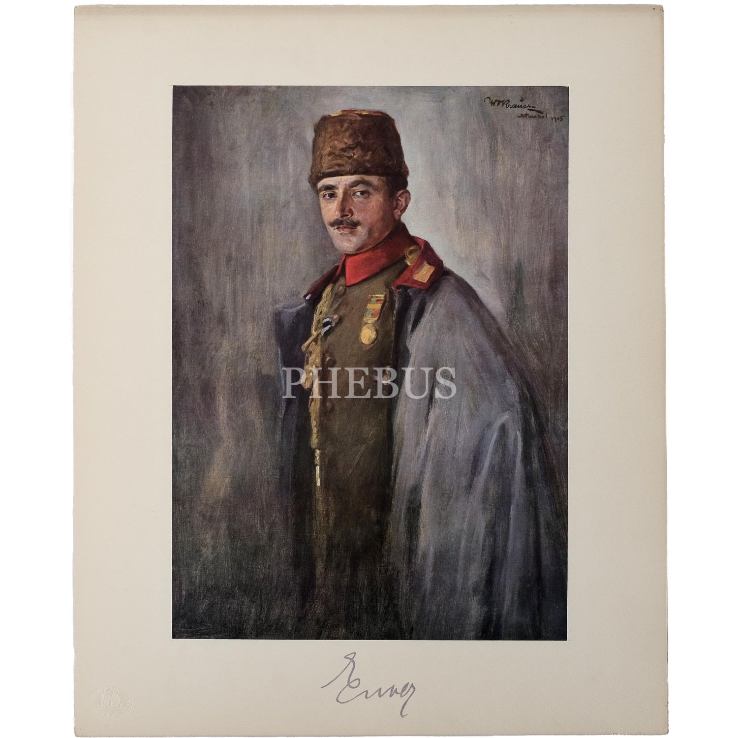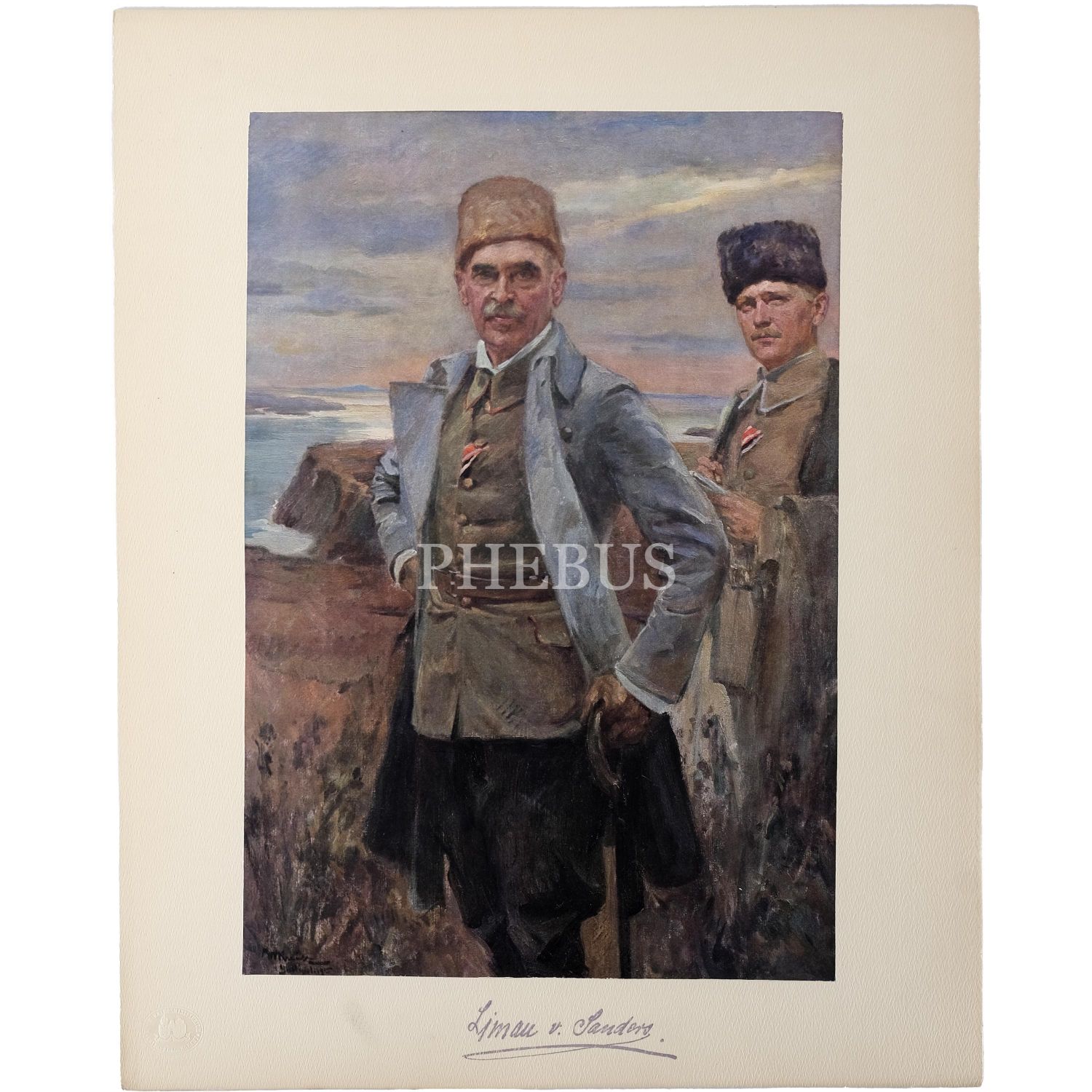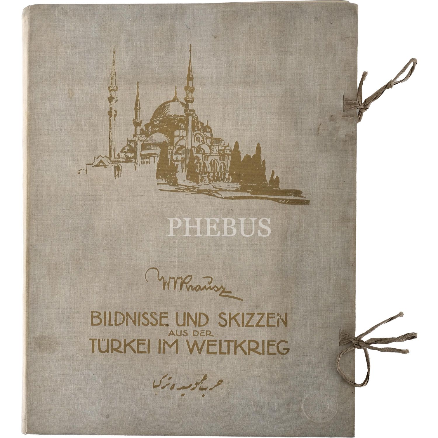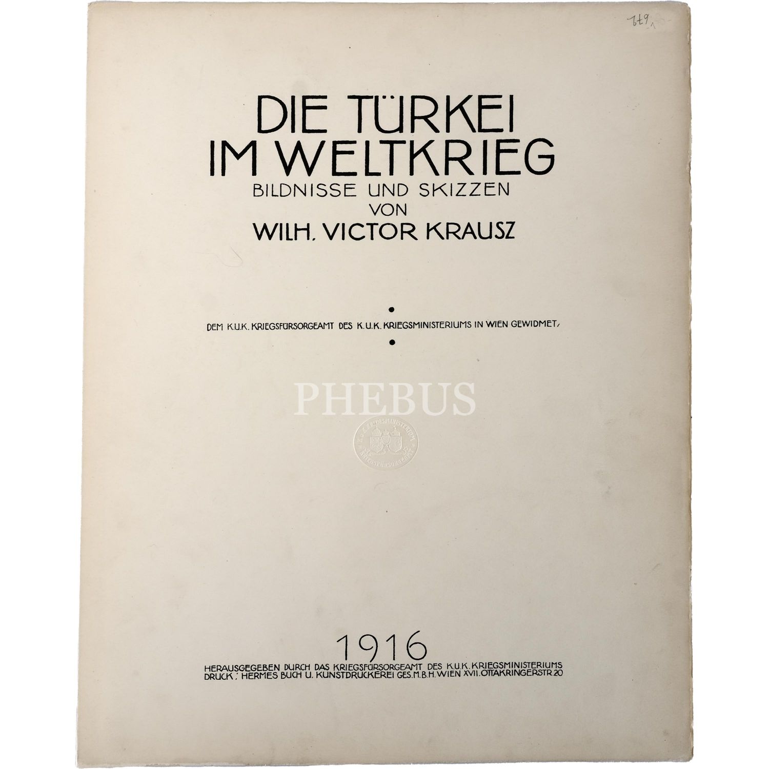 34 levhada 47 renkli resim, resimler levhalara yapıştırılmış ve paspartu içine alınmıştır. Tüm sayfa ve levhalar yayıncının soğuk damgasını taşımaktadır. Avusturyalı ressam Wilhelm Victor Krausz (1878-1959) başta dönemin padişahı Sultan V. Mehmed Reşat olmak üzere, birçok Türk büyüğünün portresinin yanı sıra, Çanakkale muharebelerinde de bizzat bulunarak savaş kroki ve desenlerinden oluşan çalışmalarını Avusturya Savaş Bakanlığı tarafından yayınlanan bu nadir eserde toplanmıştır. “I. Dünya Savaşı’nda Türkiye” başlığını taşıyan eserde yer alan çalışmalardan bazıları: Süleymaniye Camii, V. Sultan Gazi Mehmed, Sadrazam Prens Sait Halim, Şeyhulislâm Hayri Efendi, Dahiliye Nazırı Talat Bey, Hariciye Nazırı Halil Bey, Enver Paşa, Esad Paşa, Cevat Paşa, Cemal Paşa, İsmail Hakkı Paşa, Kazım Bey, Mustafa Kemal Bey, L. von Sanders, Goltz Paşa, Gelibolu’da bir asker çadırında, Haliç’te Harp Gemileri, Gelibolu’da Bir Çeşme Başında Erat, Tophane’de Yangın, İzmir’den Görünüş, Anadolu’da Bir Avusturya-Macaristan Bataryası... Albümde Mustafa Kemal, henüz Anafartalar’da genç bir komutanken resmedilmiştir. Yayıncısının orijinal desenli bez cildinde...