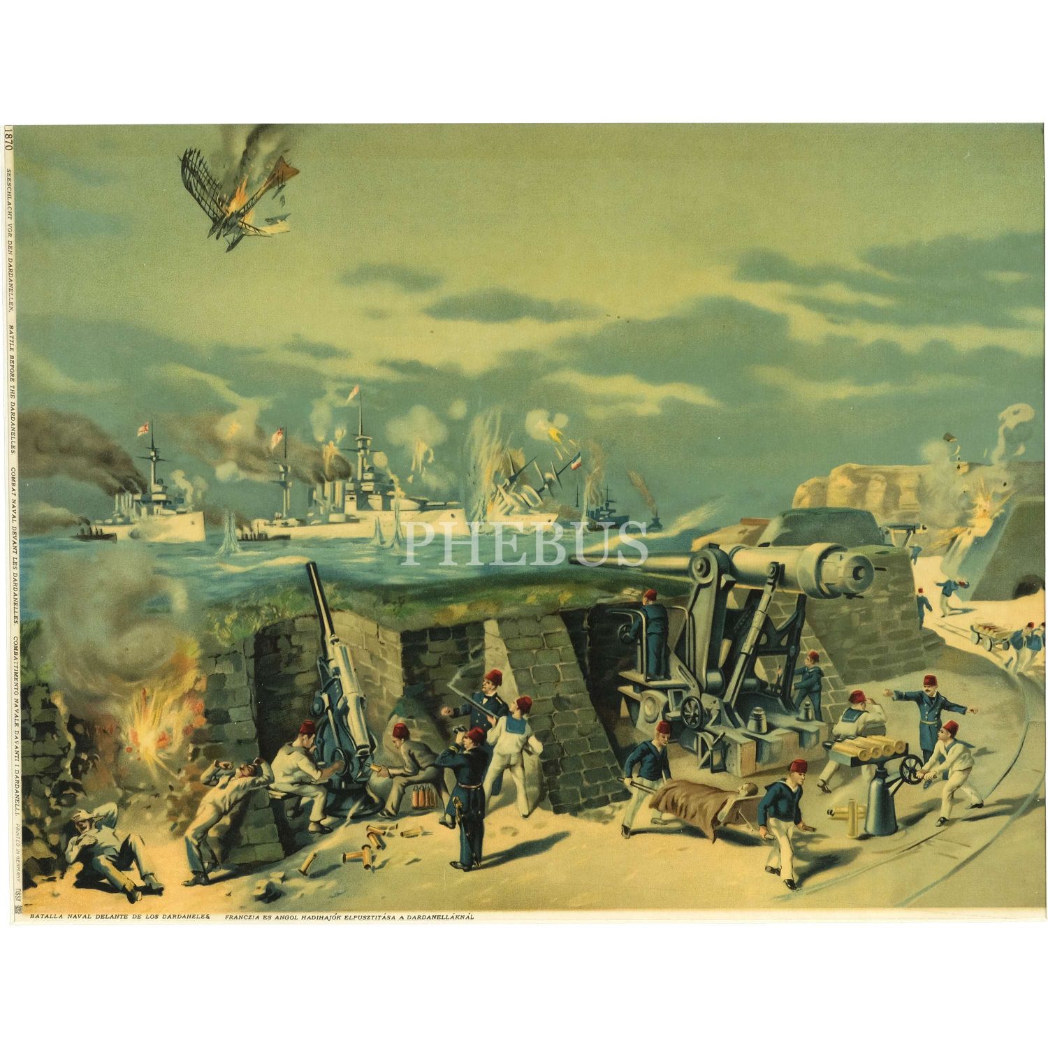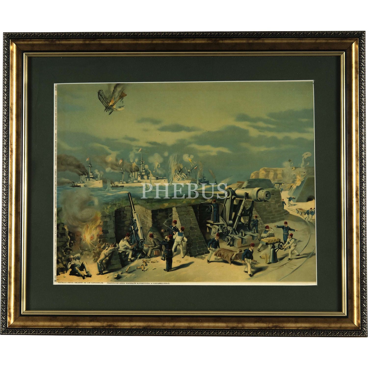 I. Dünya Savaşı sırasında Çanakkale Muharebeleri´nde, Türk topçu bataryaları tarafından dövülen İtilaf Kuvvetleri donanmasının resmedildiği afiş, 58x48 cm...