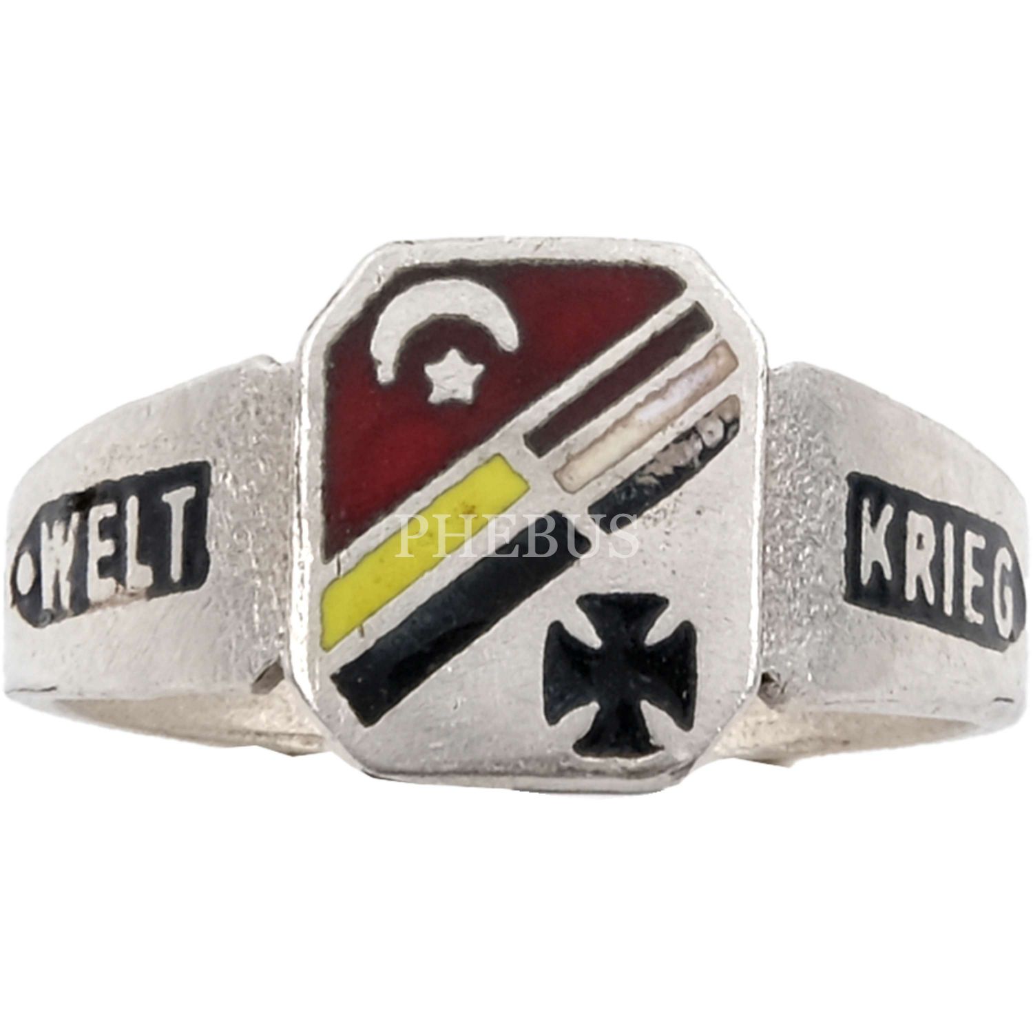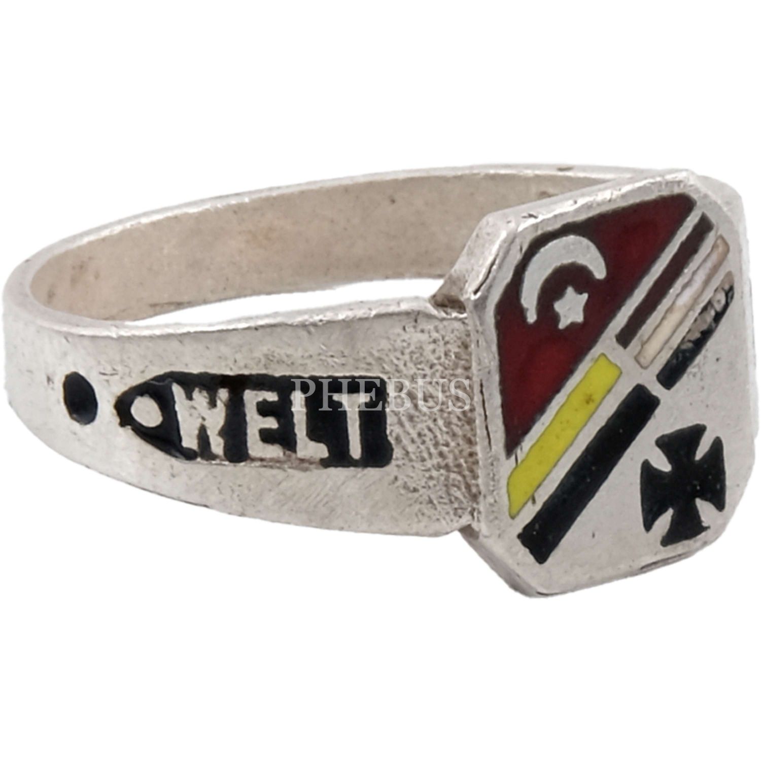 Osmanlı İmparatorluğu, Almanya İmparatorluğu ve Avusturya-Macaristan İmparatorluğu´nun bayraklarının yer aldığı, "Welt Krieg" (Dünya Savaşı) yazılı, İttifak temalı gümüş yüzük, "800" ayar damgalı, 2x2 cm...