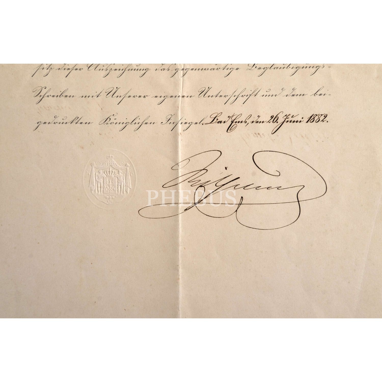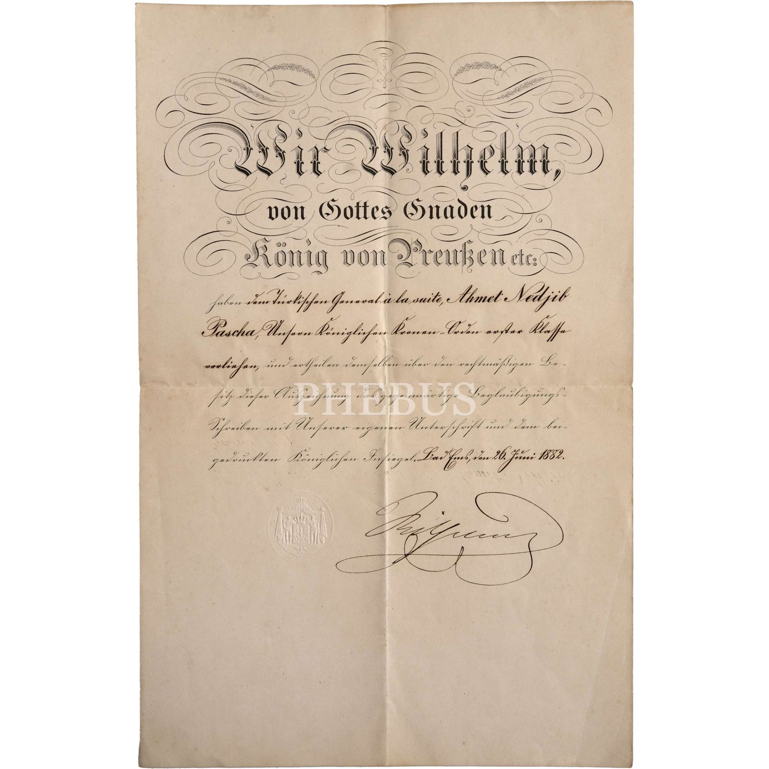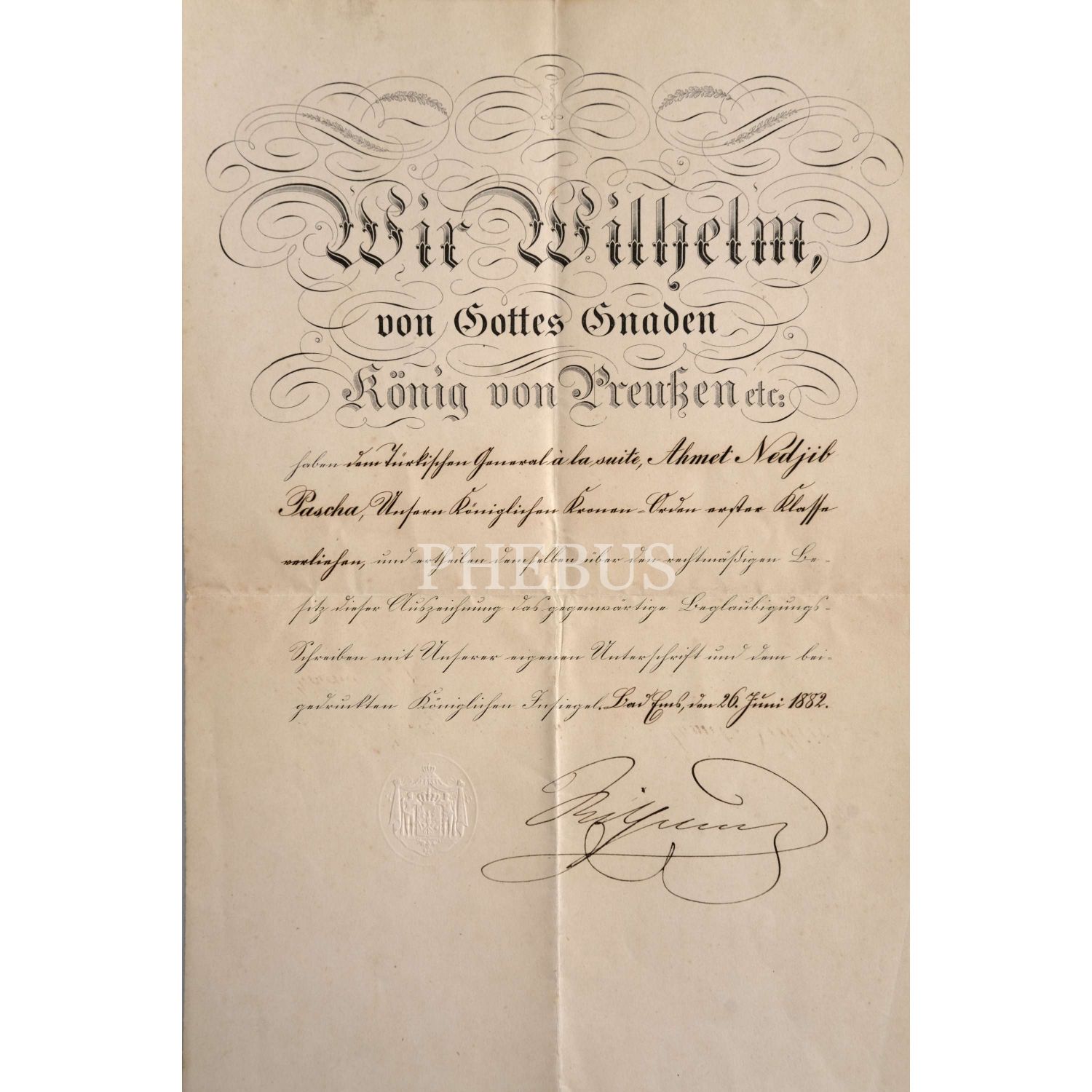 Almanya İmparatoru II. Wilhelm´in ıslak imzasını taşıyan, Ahmet Necip Paşa adına düzenlenmiş Demir Haç Madalyası beratı, 1882, 23x36 cm...