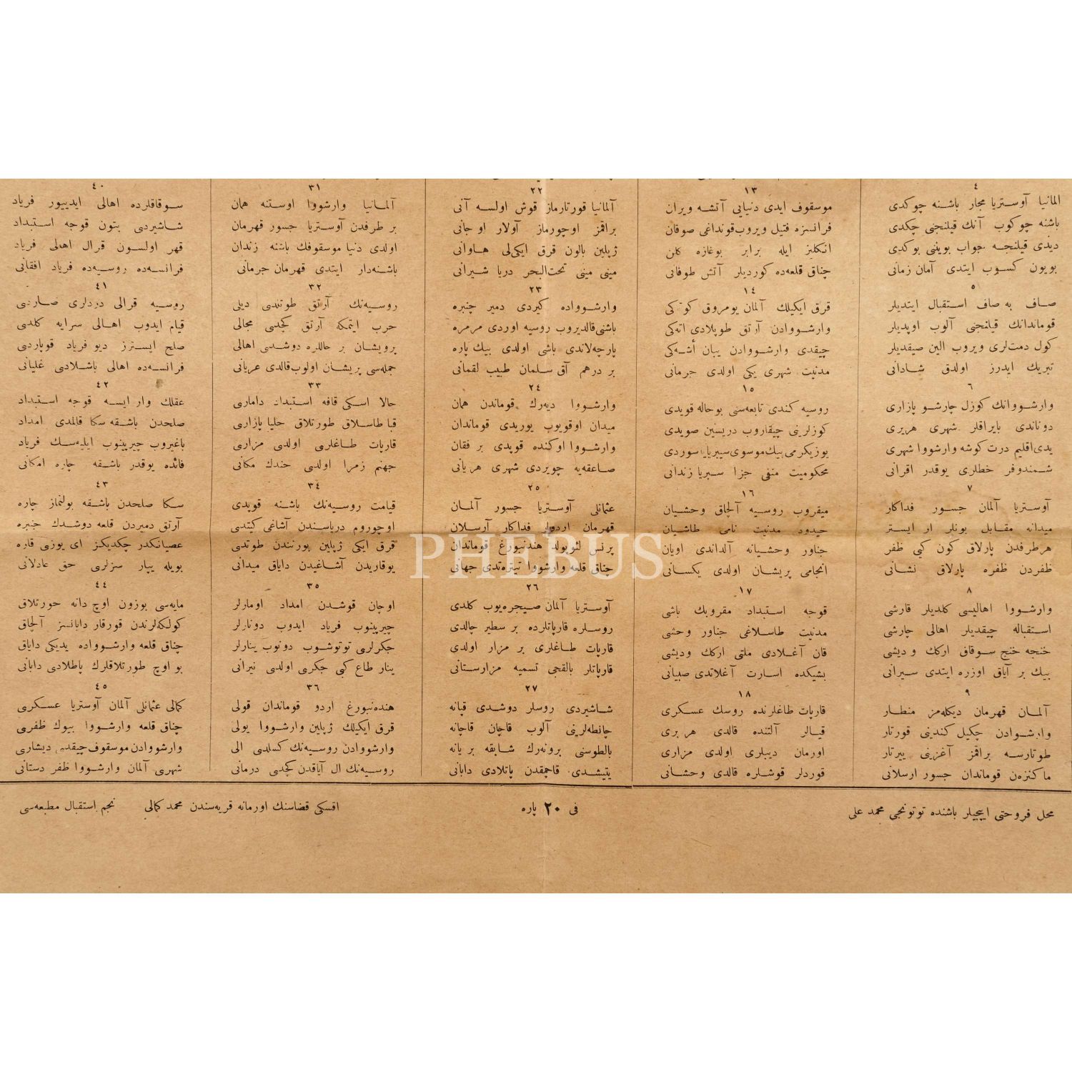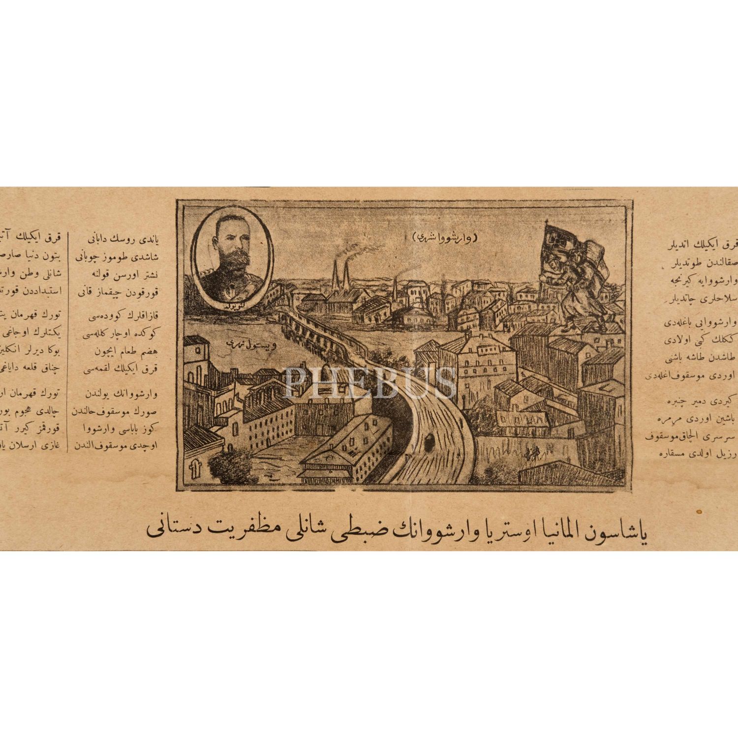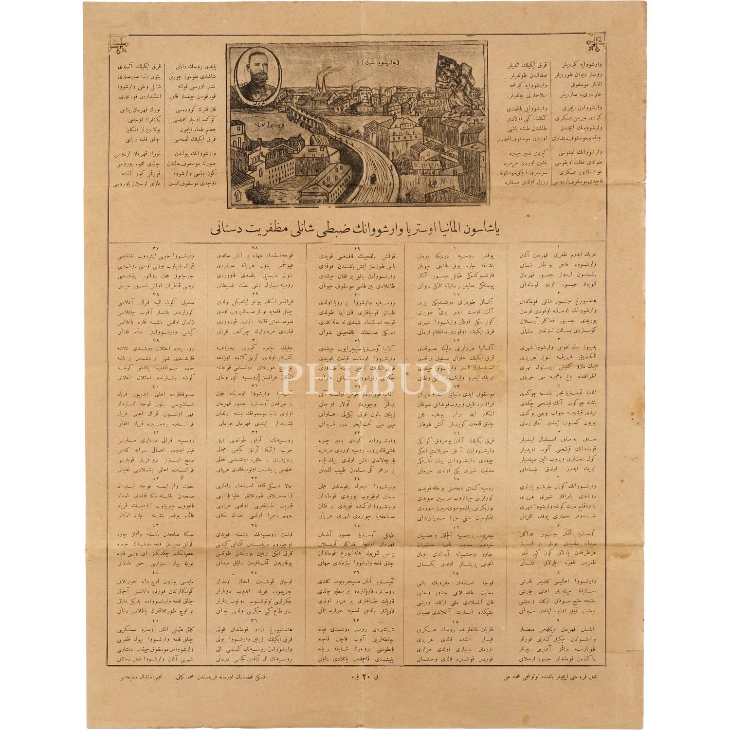 Birinci Dünya Savaşı´nda Osmanlı ile ittifak kuran Almanya ve Avusturya´nın Varşova´yı zapt etmesi üzerine kaleme alınmış, Varşova Şehri´nin ve Kumandan Lenopold´un illüstre edildiği "Yaşasın Almanya - Avusturya ve Varşova´nın Zaptı Şanlı Muzafferiyat Destanı" başlıklı destan, 38x50 cm...