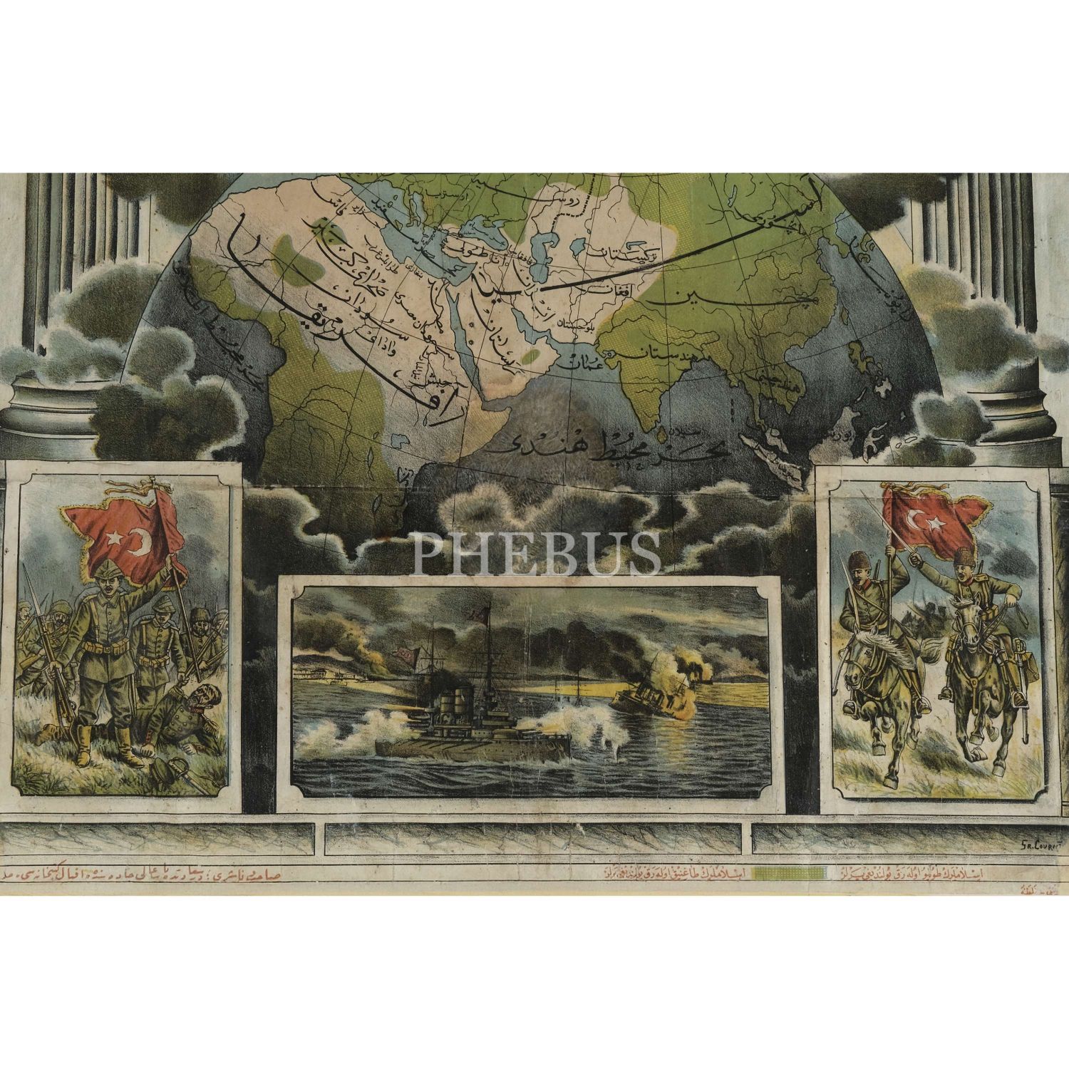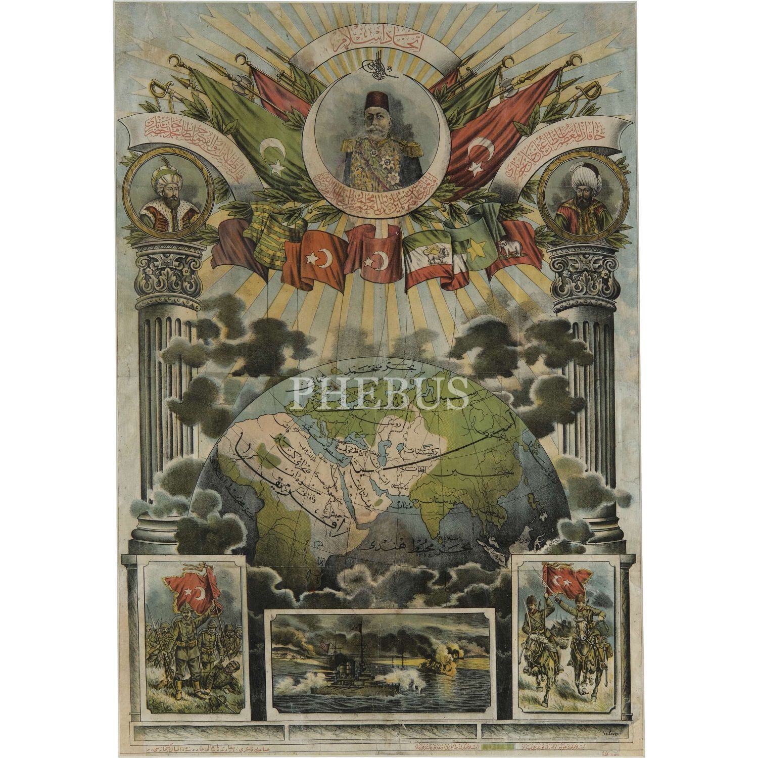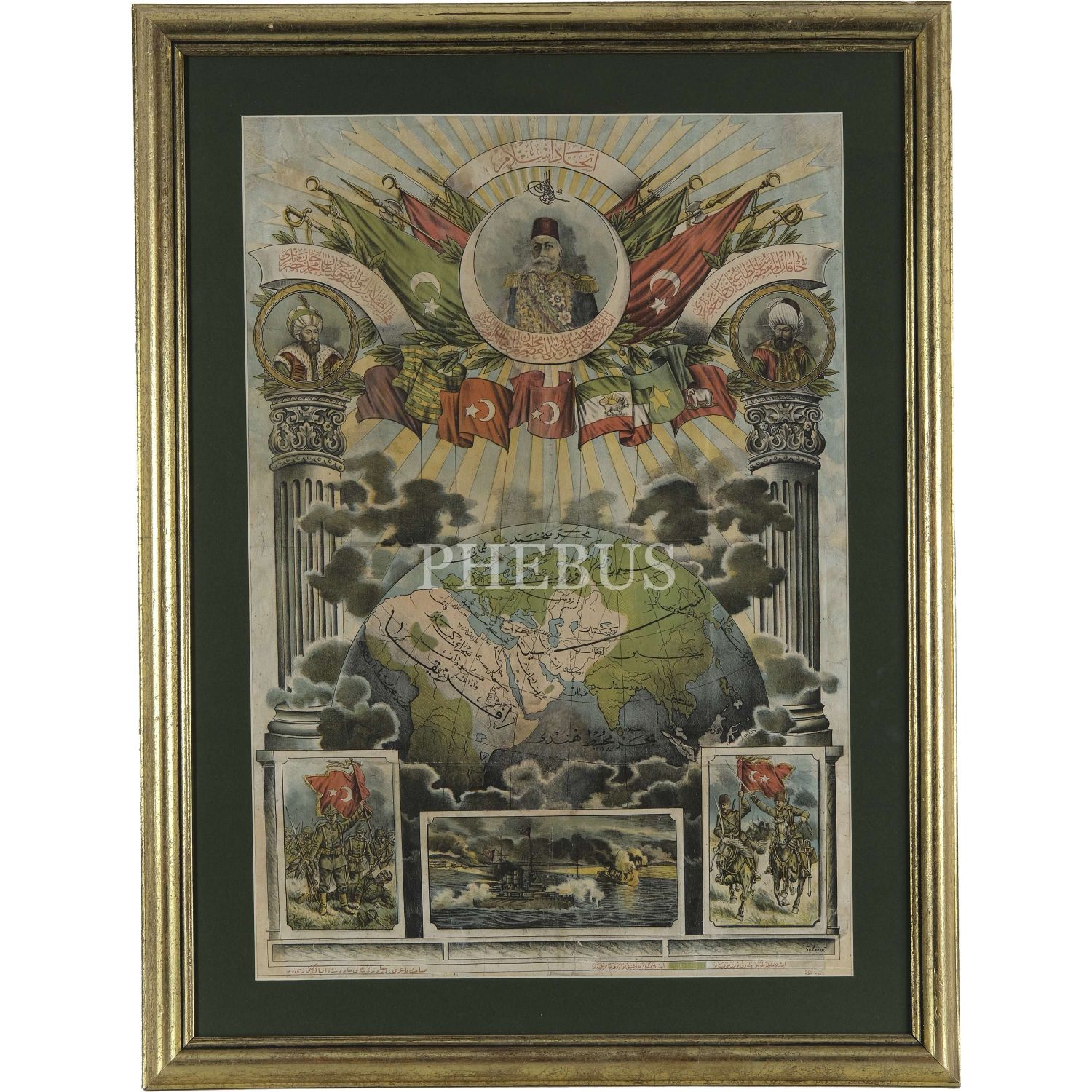 "İttihad-ı İslam" başlıklı, Sultan Mehmed Reşad, Fatih Sultan Mehmed ve Osman Gazi´nin çizim portreleri ile birlikte Osmanlı, Safevî ve Endonezya gibi İslam ülkelerinin bayraklarını gösteren ve İslam birliği haritası içeren afiş, (yayıncı: İkbal Kütüphanesi), afiş 44x63 cm, çerçeve 61x78 cm...