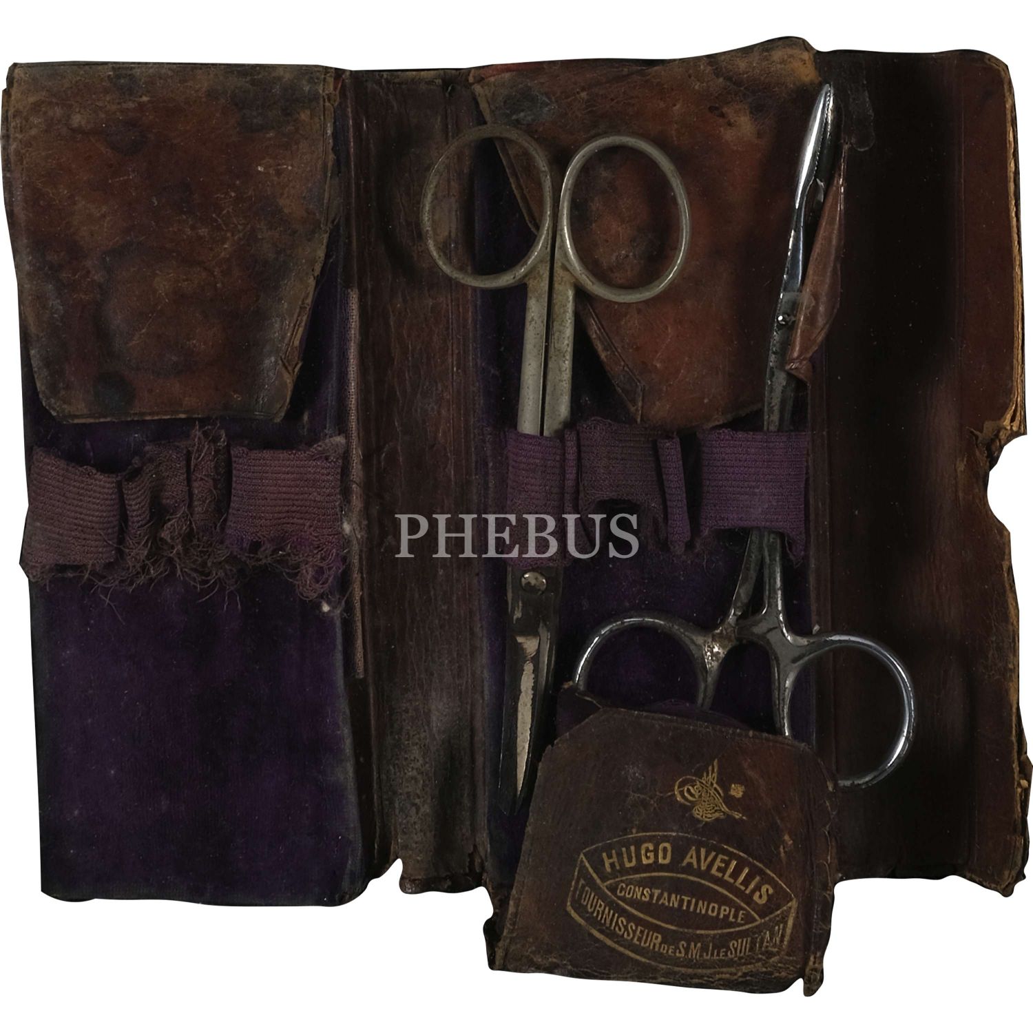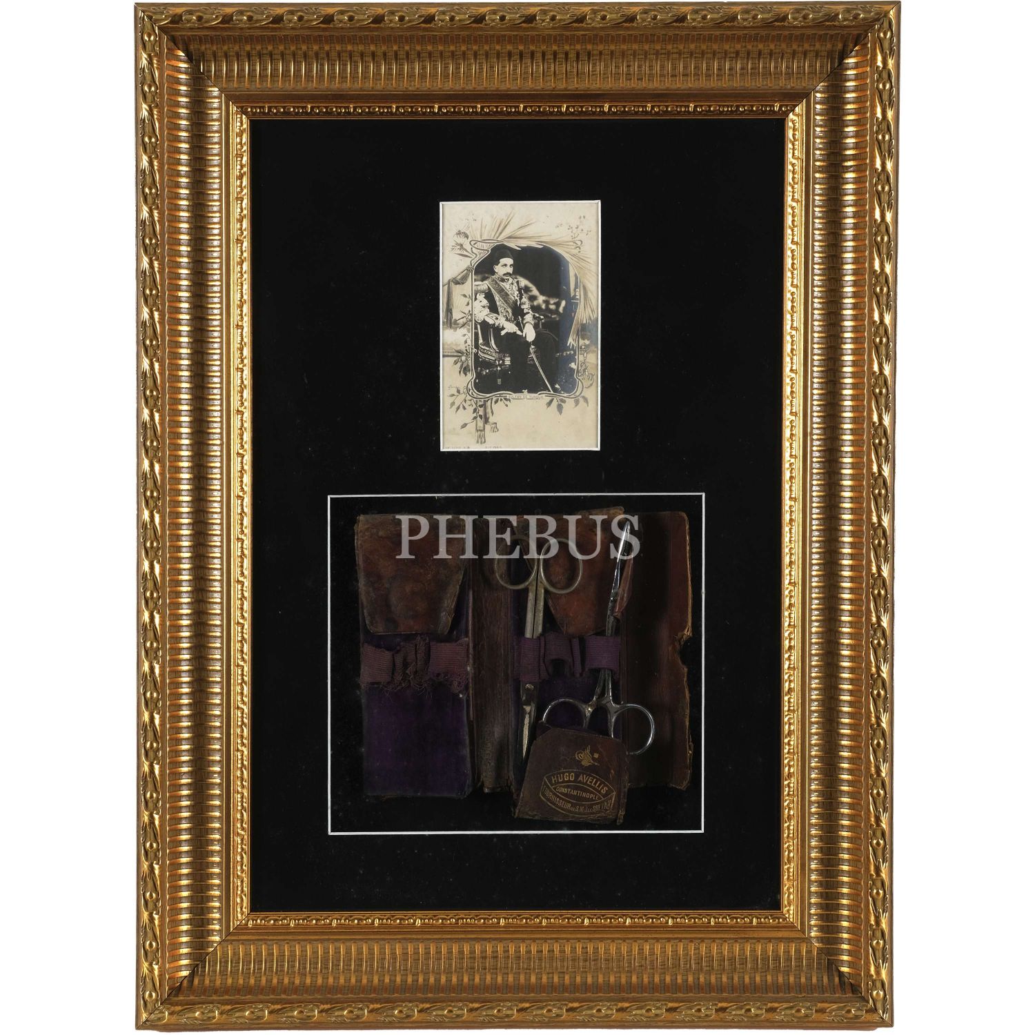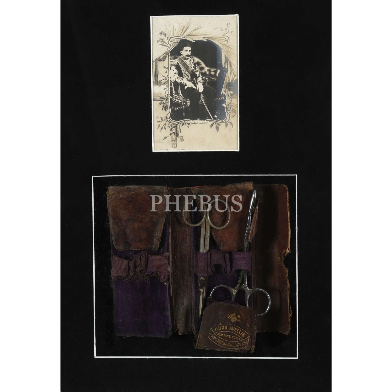 Sultan´ın ve saray mensuplarının tedarikçisi; cerrahi-tıbbi malzemeler, protezler ve medikal ürünler satıcısı Hugo Avellis´in "Hugo Avellis - Constantinople - Fournisseur de S.M.J. Le Sultan" yazılı ve "Sultan Mehmed Reşad" tuğralı orijinal deri kılıfında cerrahi makas takımı ve Sultan II. Abdülhamit´in bir fotokartı, cerrahi makas takımı 18x15 cm...