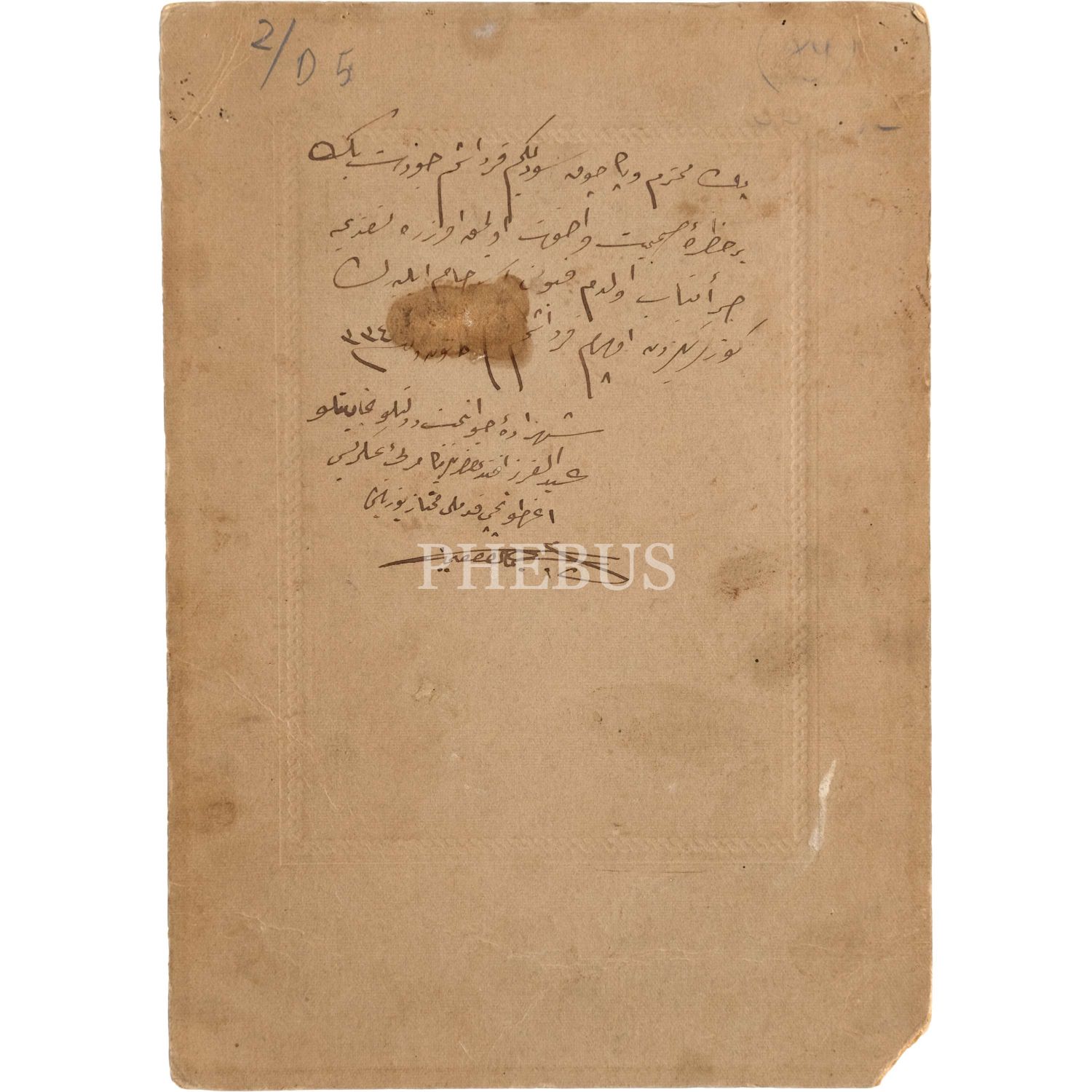"Pek muhterem ve pek çok sevdiğim Cevdet Bey´e bir hatıra-ı samimiyet ve uhuvvet olmak üzere takdime-i cüretab oldum. Fotoğrafı istirham edilerek gözlerinizden öperim kardeşim." ithafıyla Şehzade-i Civanbaht Devletlü Necabetlü Abdülaziz Efendi Hazretleri´nin ... askerisi ağır topçu kıdemli mümtaz yüzbaşı M. Cemaleddin imzasıyla imzalanmıştır.