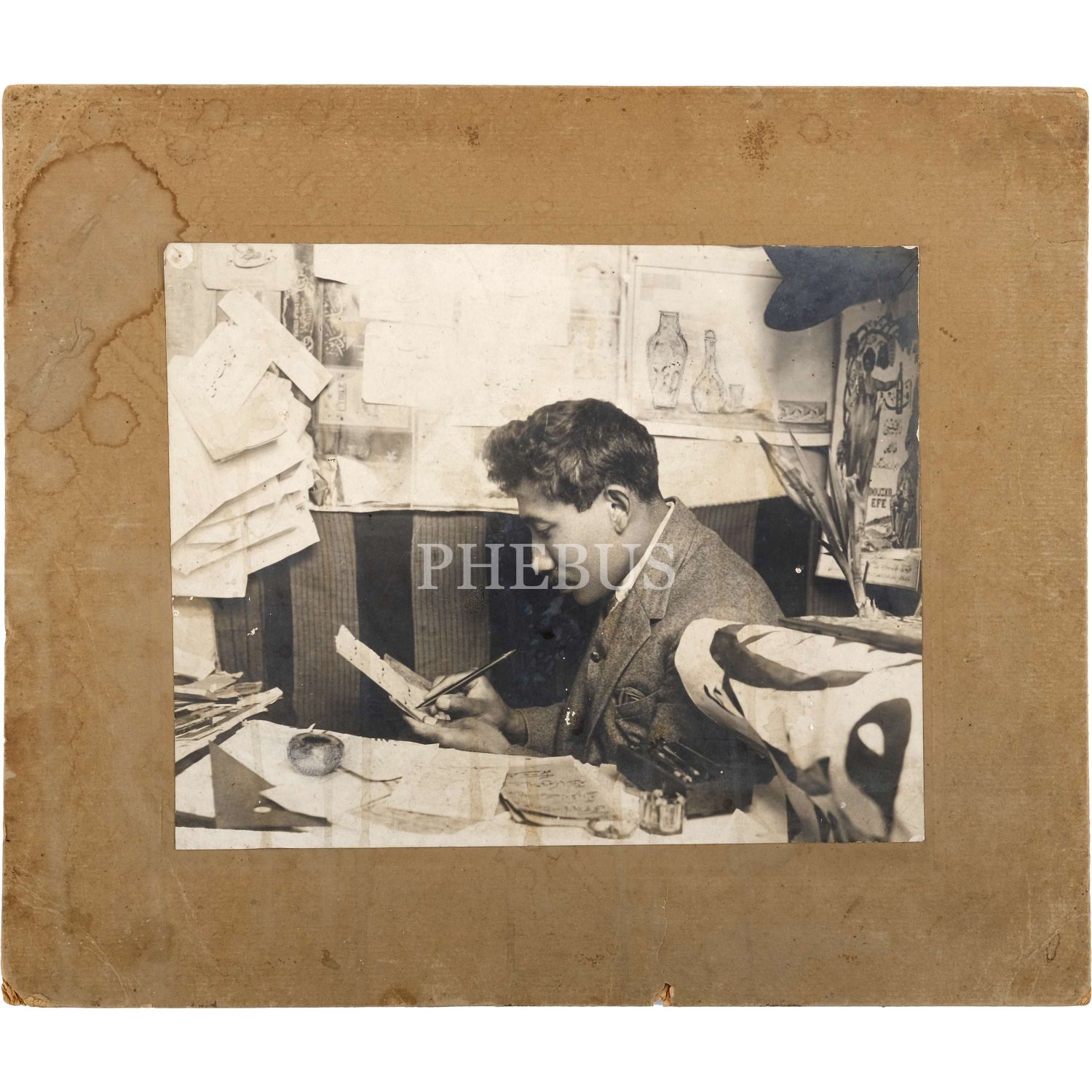 Halim Özyazıcı yazıhanesinde yazı yazarken çekilmiş fotoğraf, 29x22 cm, paspartu ölçü: 42x34 cm......