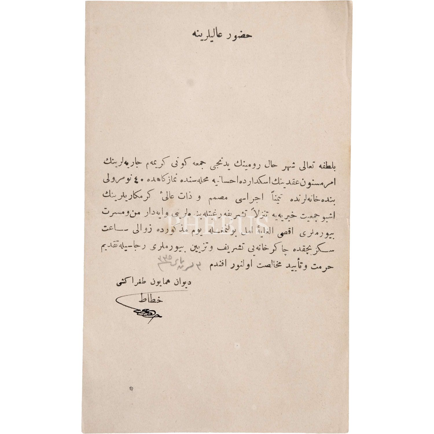 "Huzûr-ı Âlîlerine Bilütfihî Teâlâ şehr-i hâl-i rûmî´nin yedinci Cuma günü kerîmem câriyelerinin emr-i mesnûn akdinin Üsküdâr´da İhsâniye Mahallesinde Namâzgâh´da 40 numaralı bendehânelerinde teyemmünen icrâsı musammem ve zât-ı âli-i keremkârîlerinin işbu cemiyet-i hayriyeye tenezzülen teşrîfe rağbetle bendelerini vâyedâr-ı menn ü meserret buyurmaları aksa´l-gâye-i emel bulunmakla yevm-i mezkûrda zevâlî sâat saat sekiz buçukta çâkerhâneyi teşrif ve tezyin buyurmaları ricâsıyla takdim-i hürmet ve teyid-i muhâlasat olunur efendim 2 Teşrîn-i Sânî sene 335 Dîvân-ı Hümâyûn Tuğrâkeşi Hattat Hakkı"