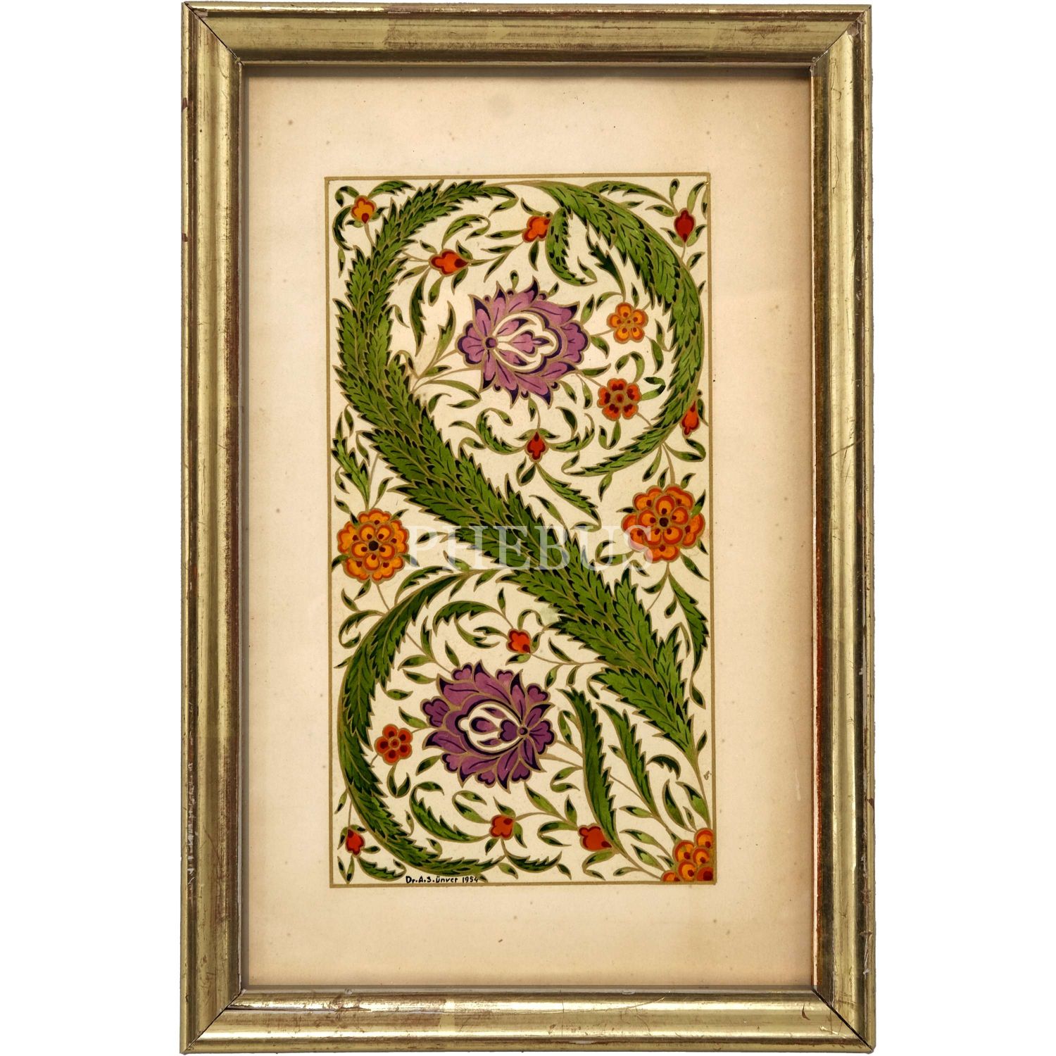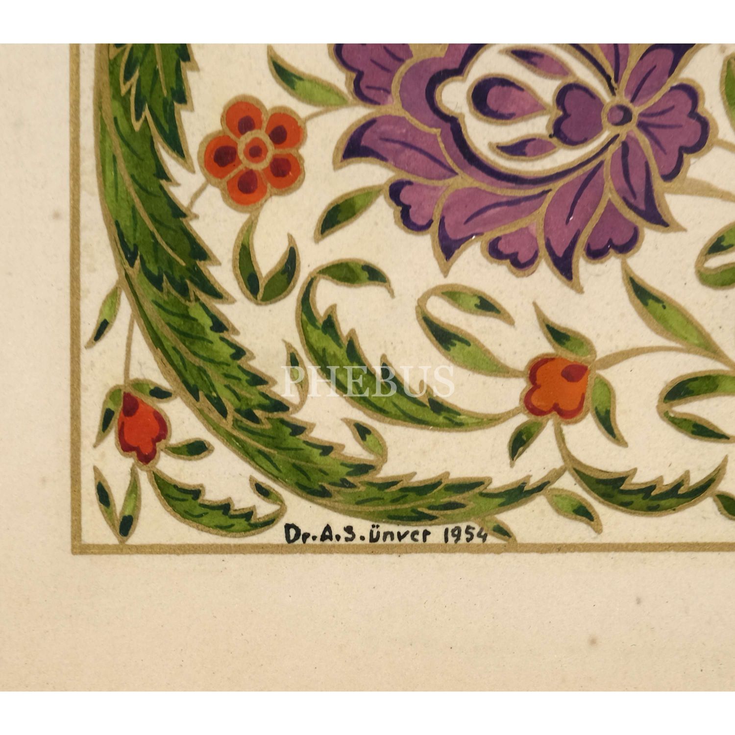 Süheyl Ünver imzalı hatayî ve saz yolu motifli tezhip, 1954 tarihli, ölçü: 9x16 cm, 13x21 cm...