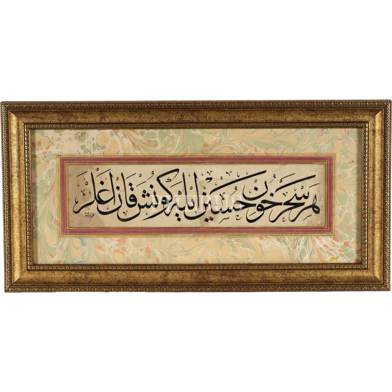 Nuri (Korman) ketebeli celî sülüs yazı, yazı ölçü: 37x9 cm, çerçeve içi ölçü 47x19 cm...