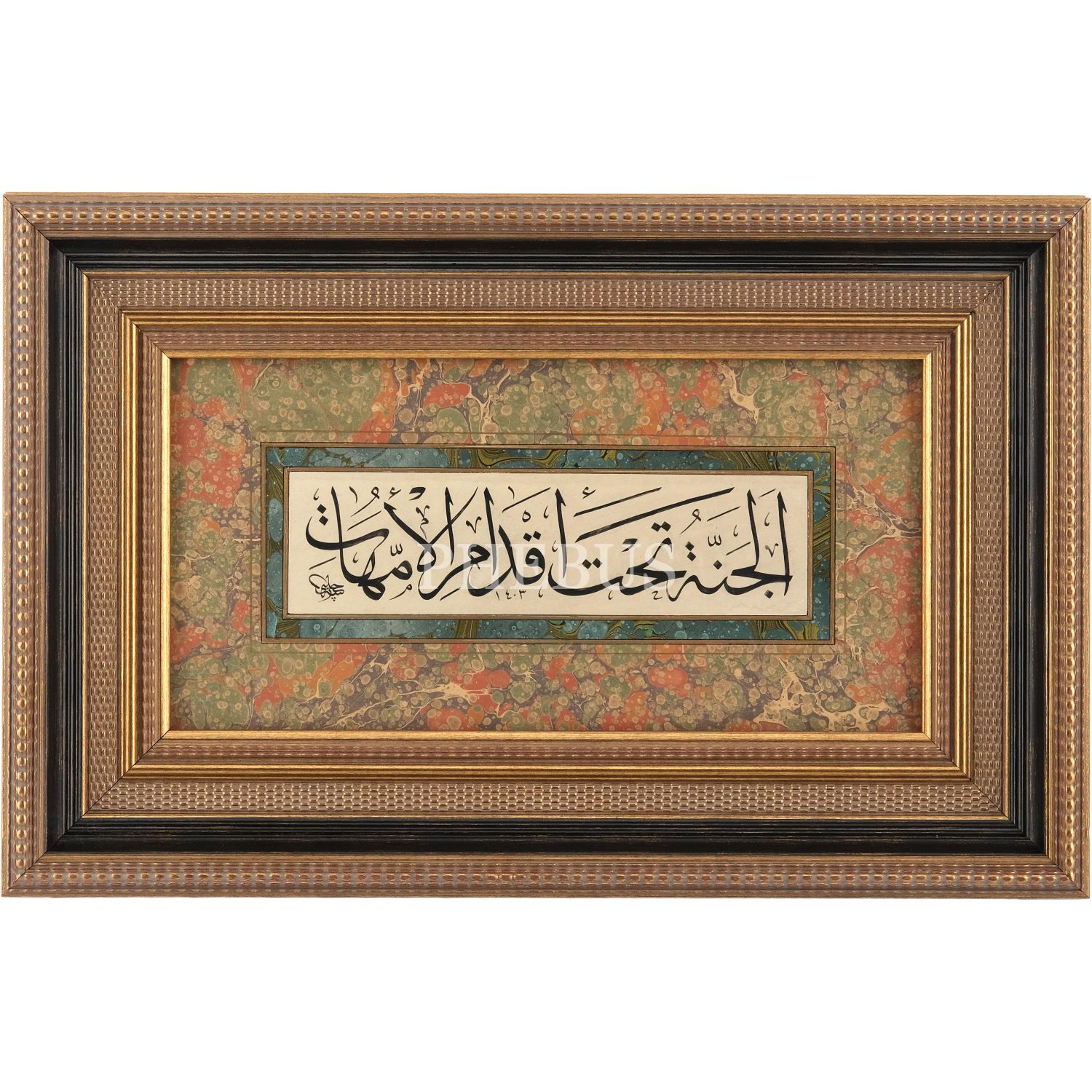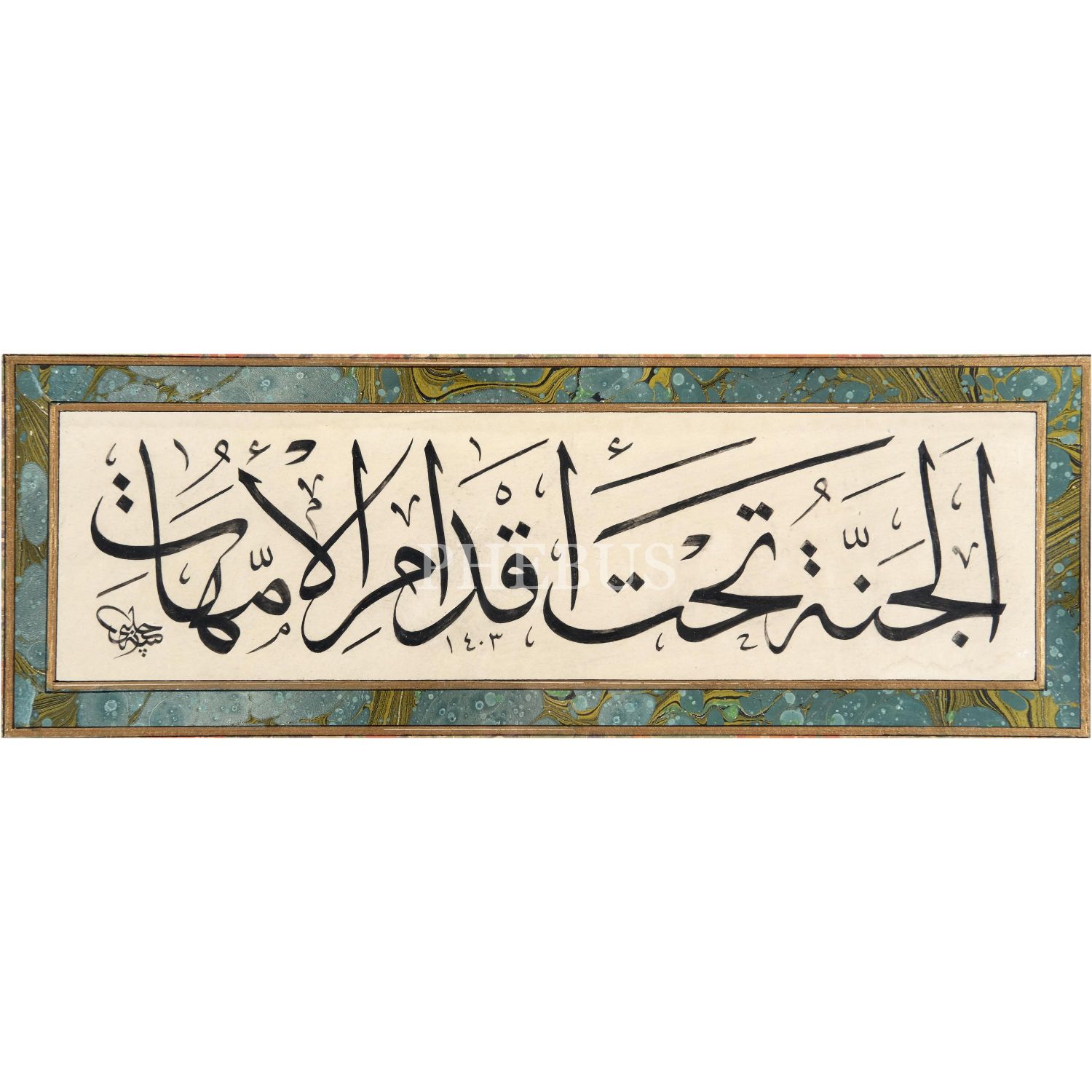 Hasan Çelebi ketebeli sülüs hadis-i şerif, hicri 1403 tarihli, pervazı battal ebrulu, çerçeve içi ölçü: 32x17cm...