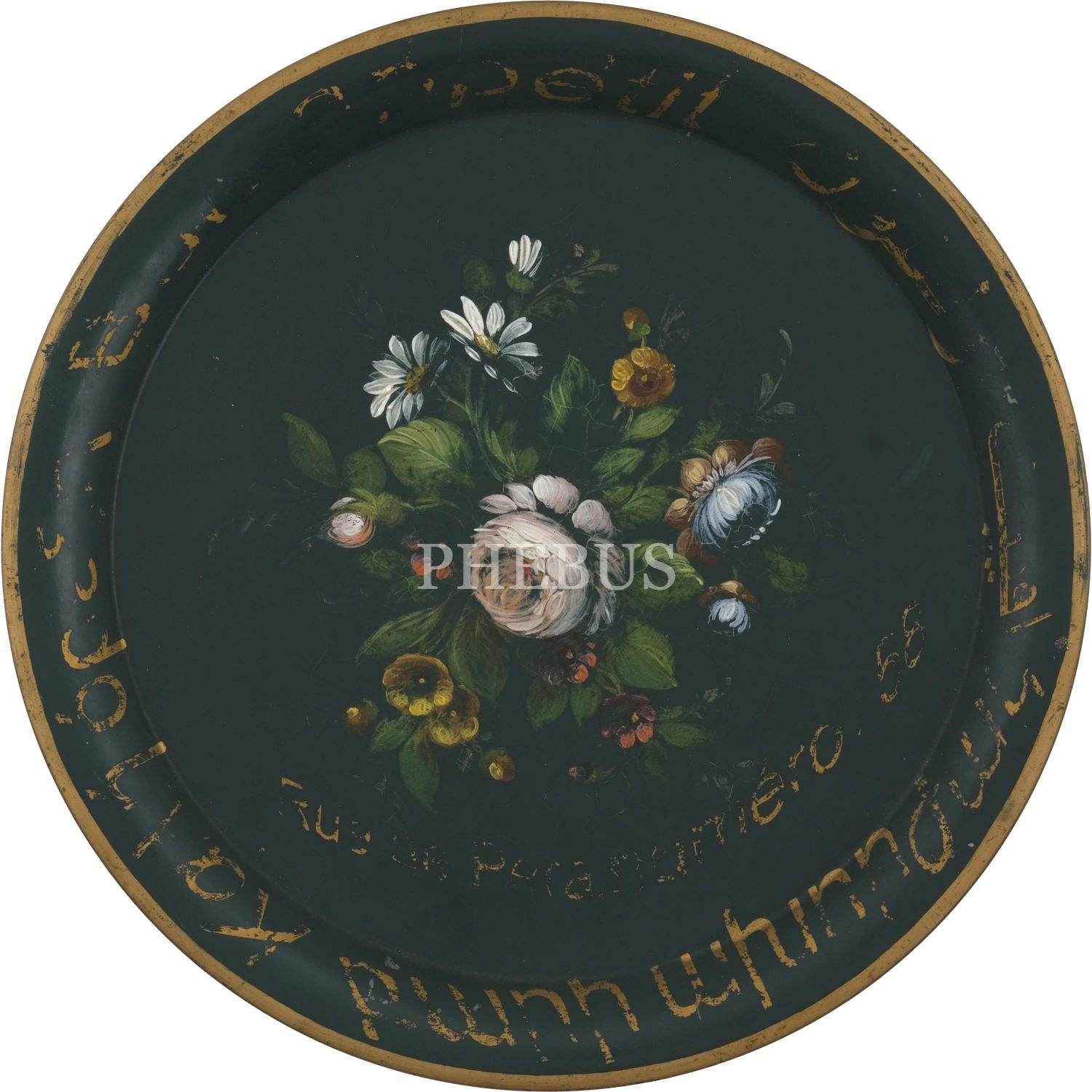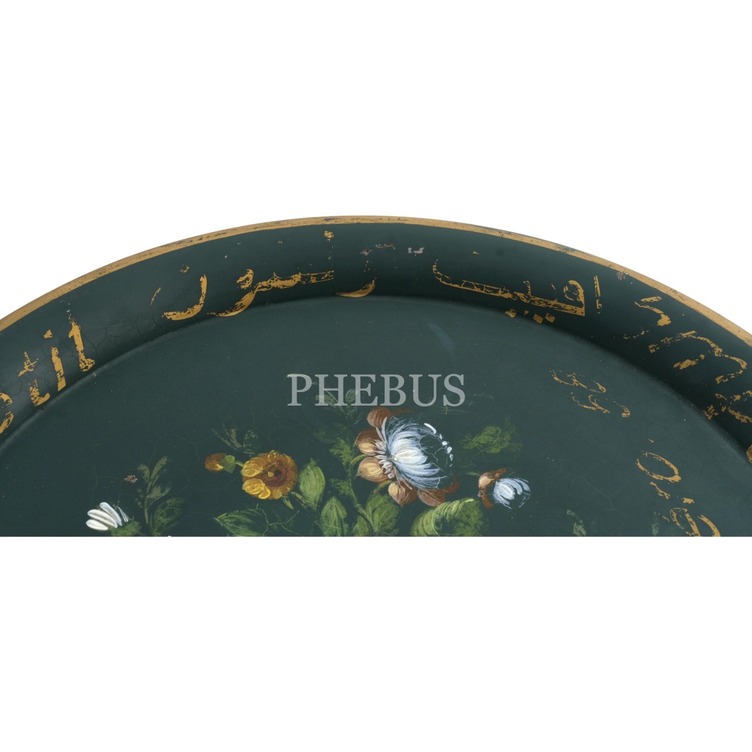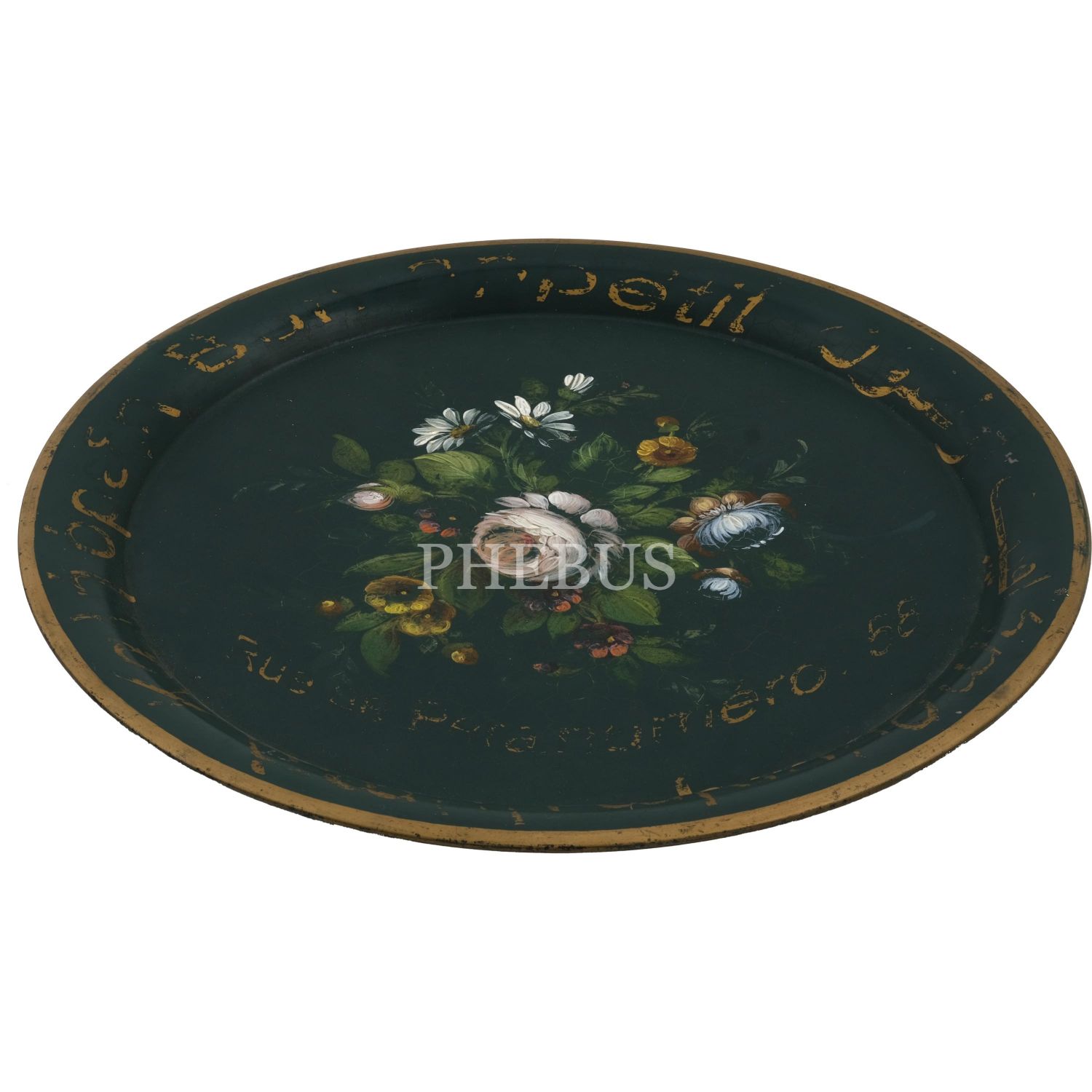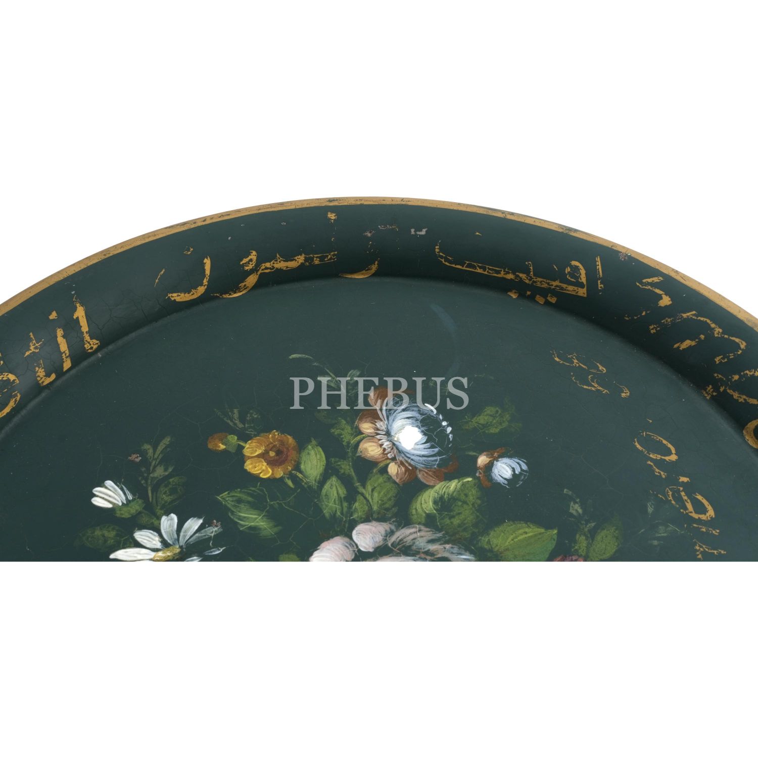 Kenarında Osmanlıca, Fransızca, Ermenice ve Rumca "Afiyet Olsun", göbeğinde "Rue de Pera numero 58" yazılı floral desenlerle bezeli tepsi, çap 40 cm...
