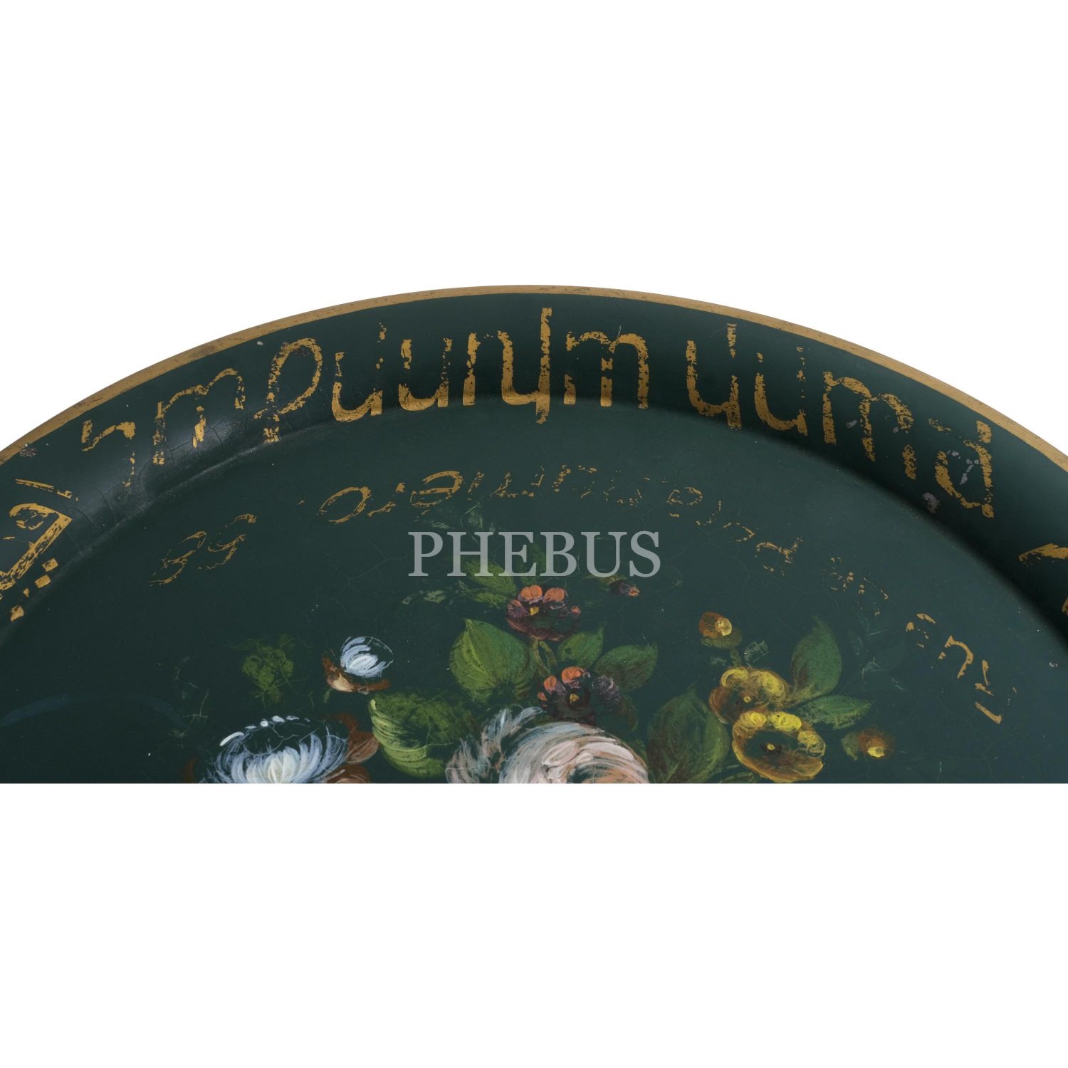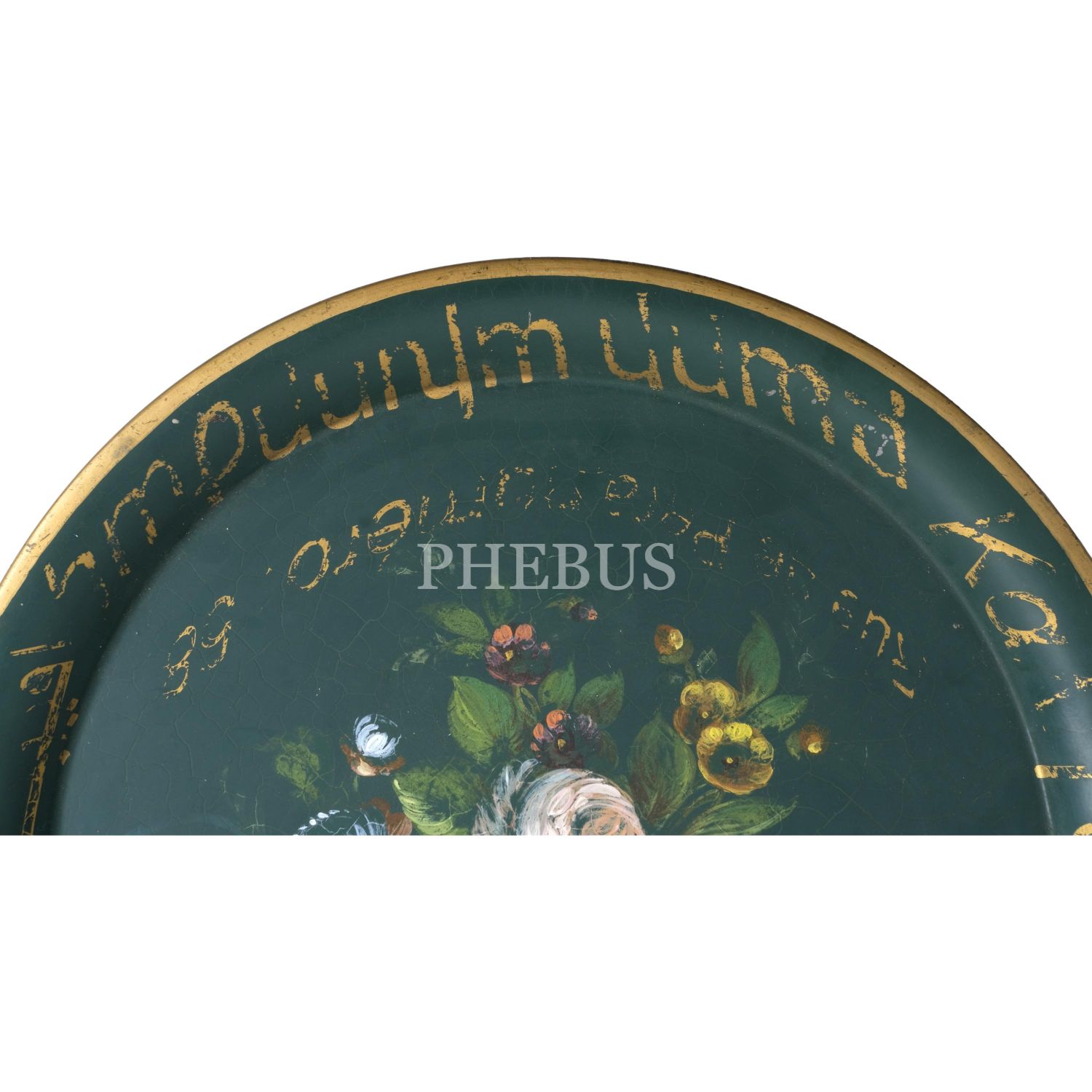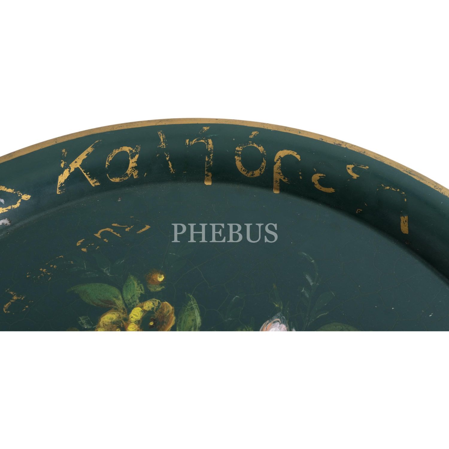 Kenarında Osmanlıca, Fransızca, Ermenice ve Rumca "Afiyet Olsun", göbeğinde "Rue de Pera numero 58" yazılı floral desenlerle bezeli tepsi, çap 40 cm...