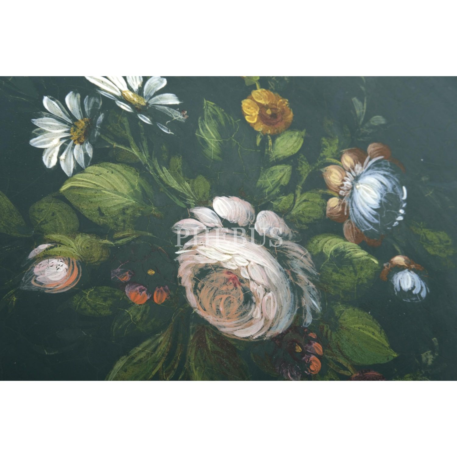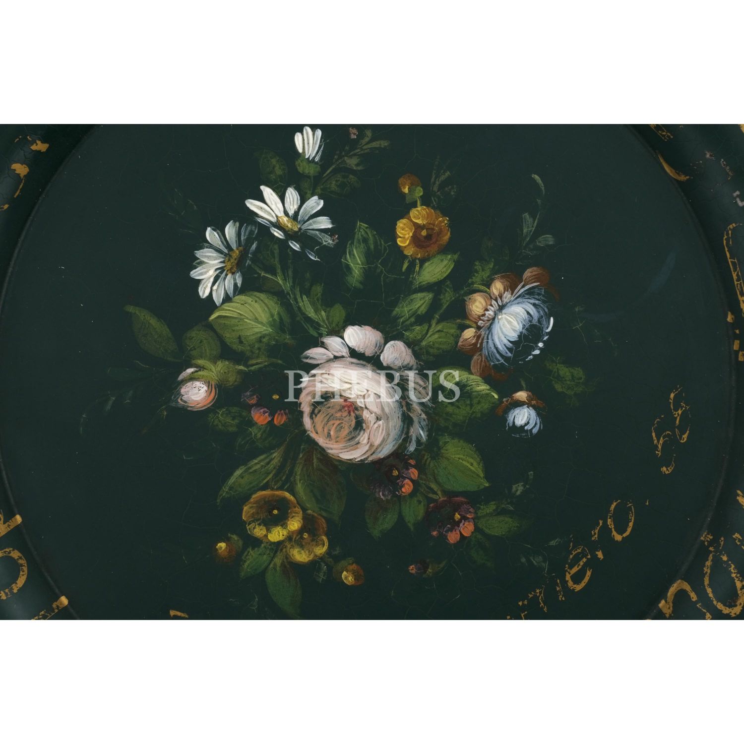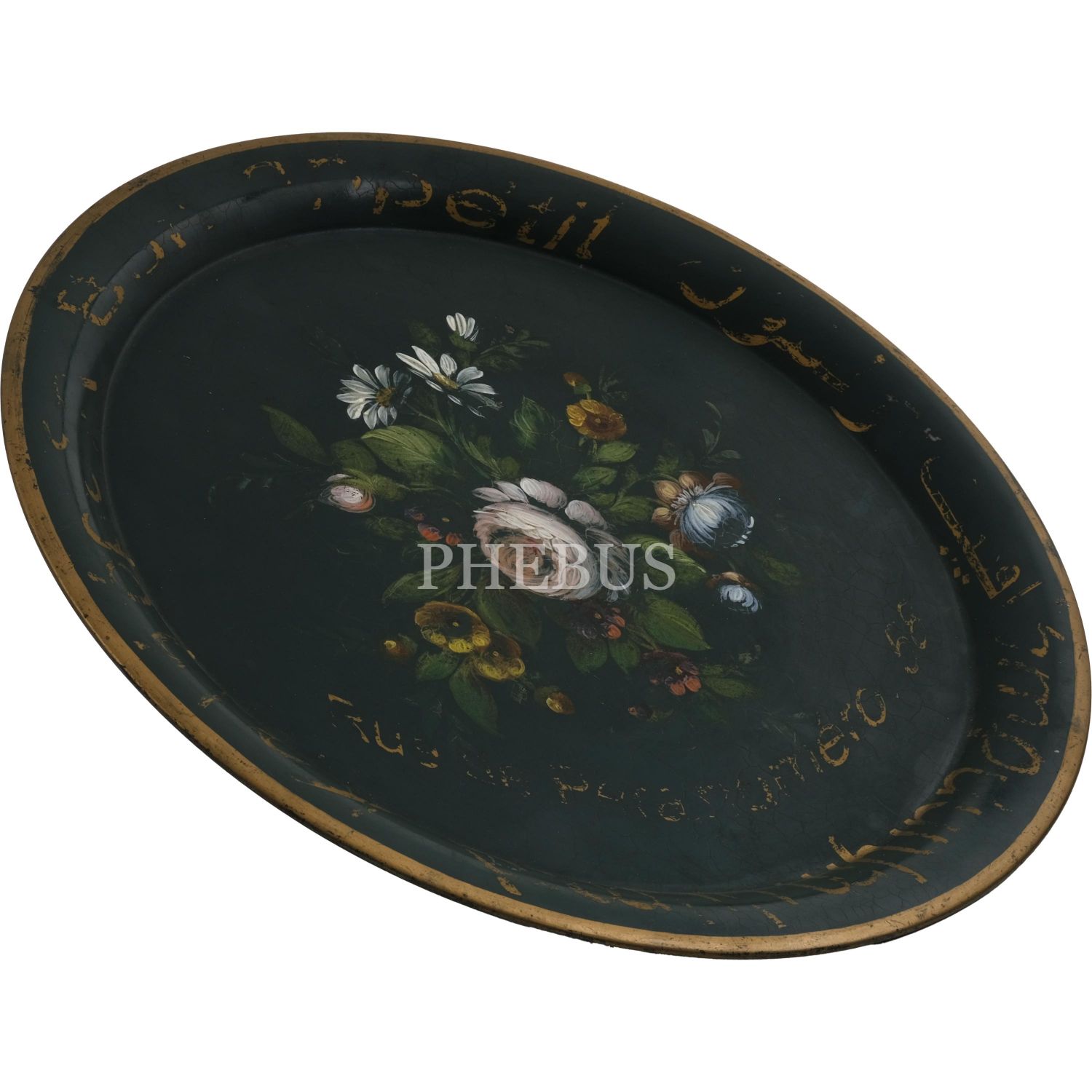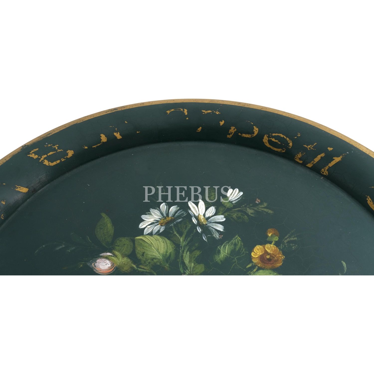 Kenarında Osmanlıca, Fransızca, Ermenice ve Rumca "Afiyet Olsun", göbeğinde "Rue de Pera numero 58" yazılı floral desenlerle bezeli tepsi, çap 40 cm...