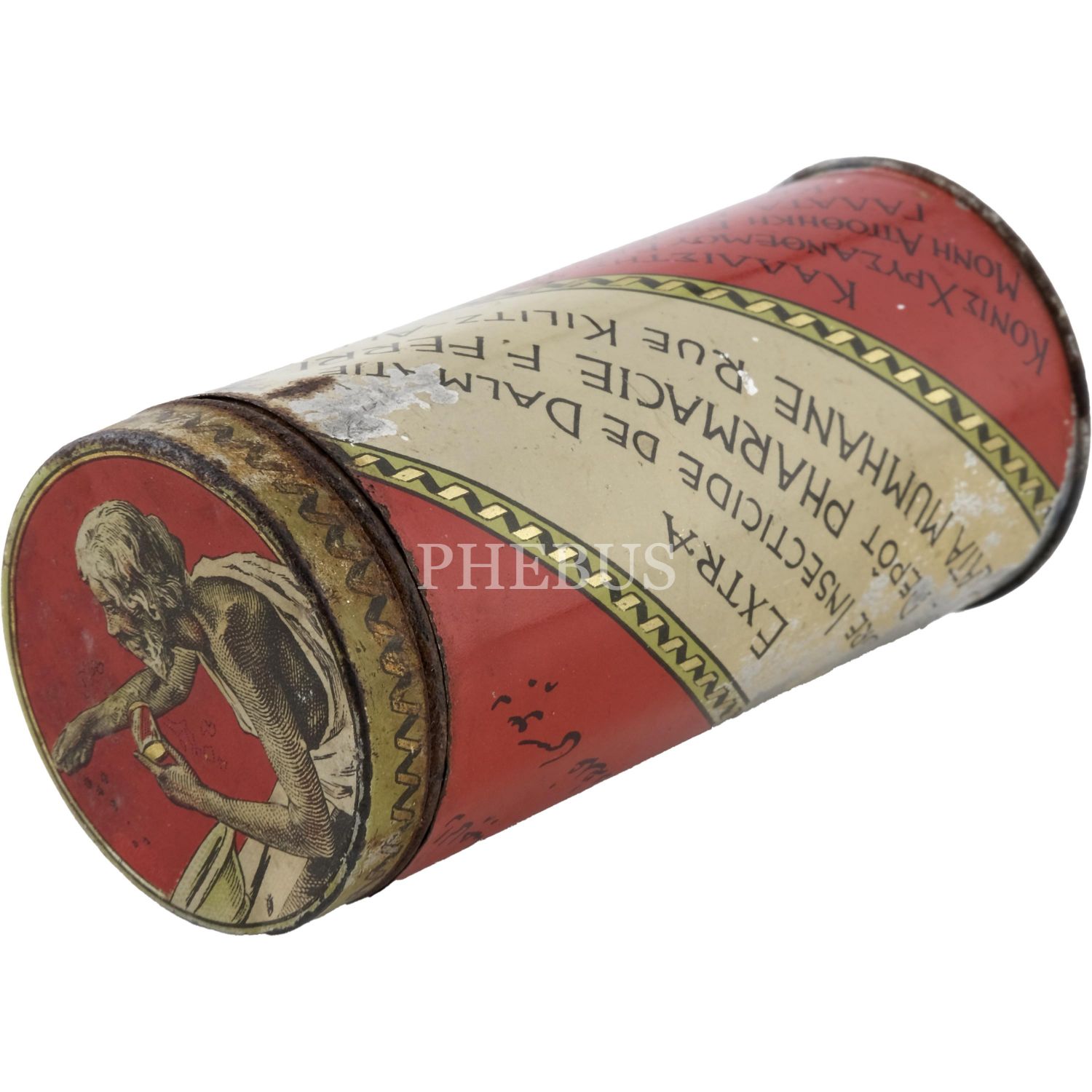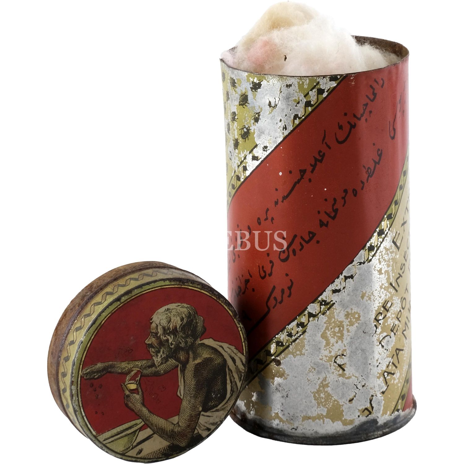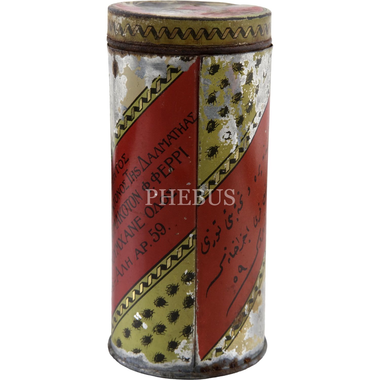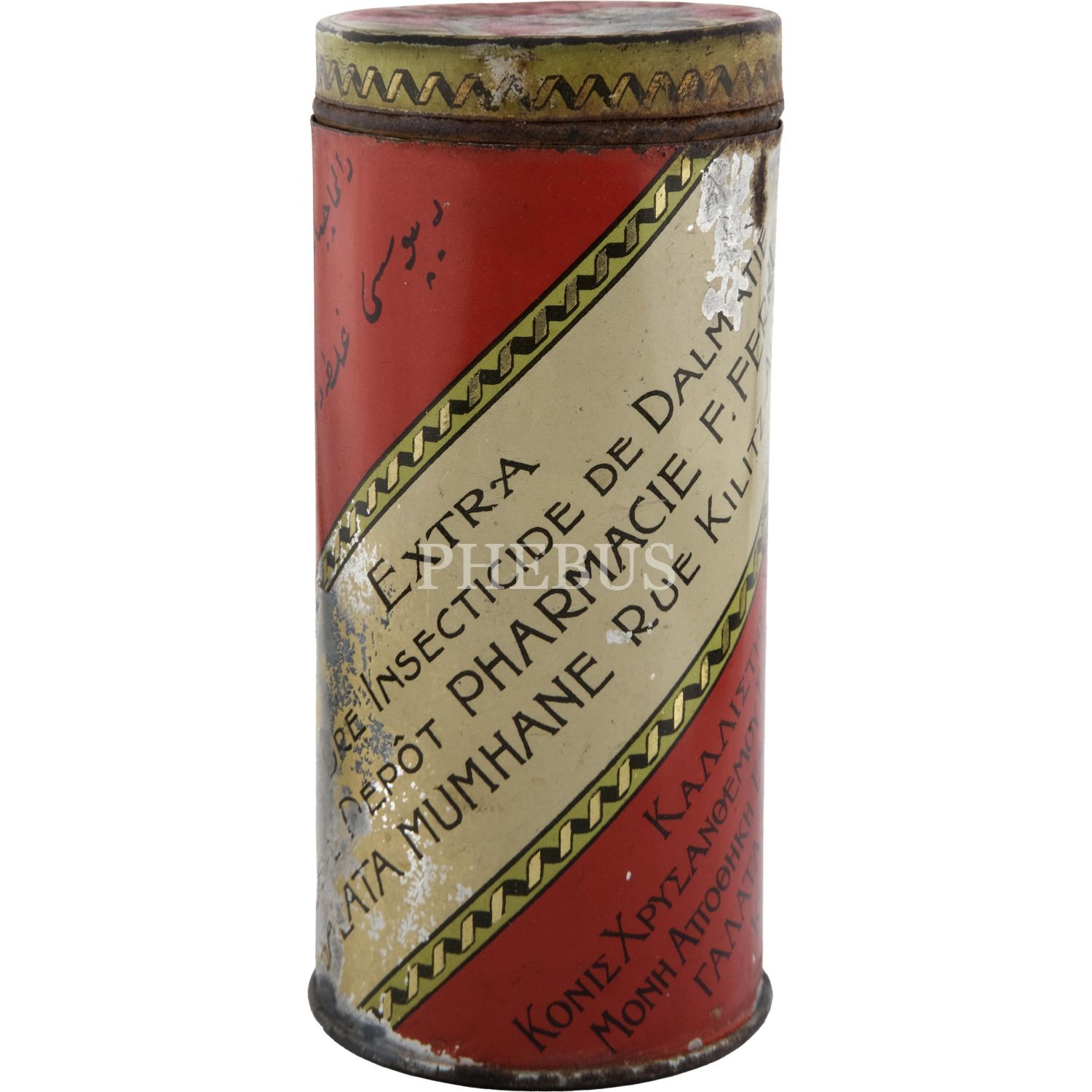 Galata´da faaliyet gösteren Ferri Eczahanesi´nin imal ettiği pire ve tahta biti tozunun Osmanlıca, Fransızca ve Rumca etiketli teneke kutusu, çap 4 cm, yükseklik 10 cm...
