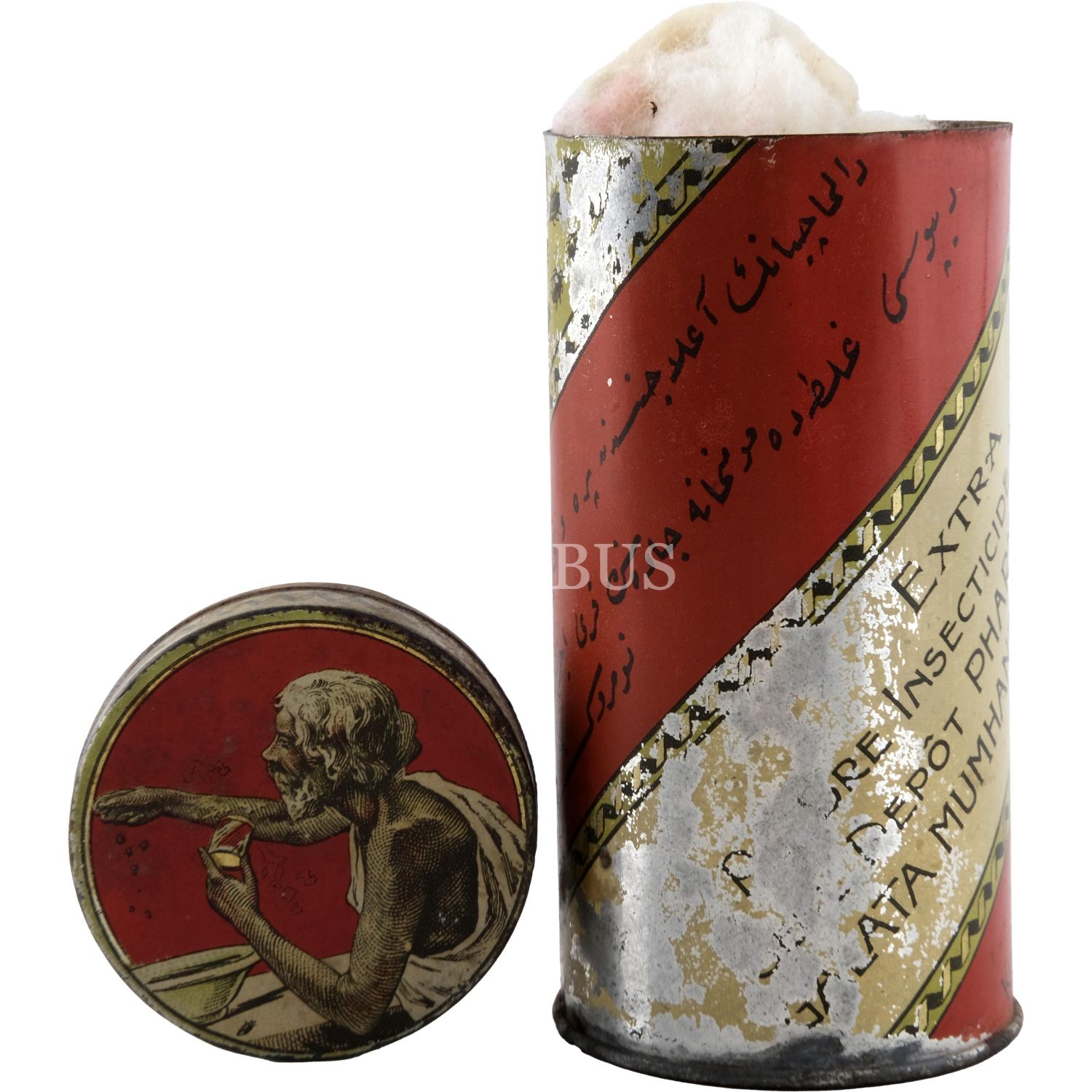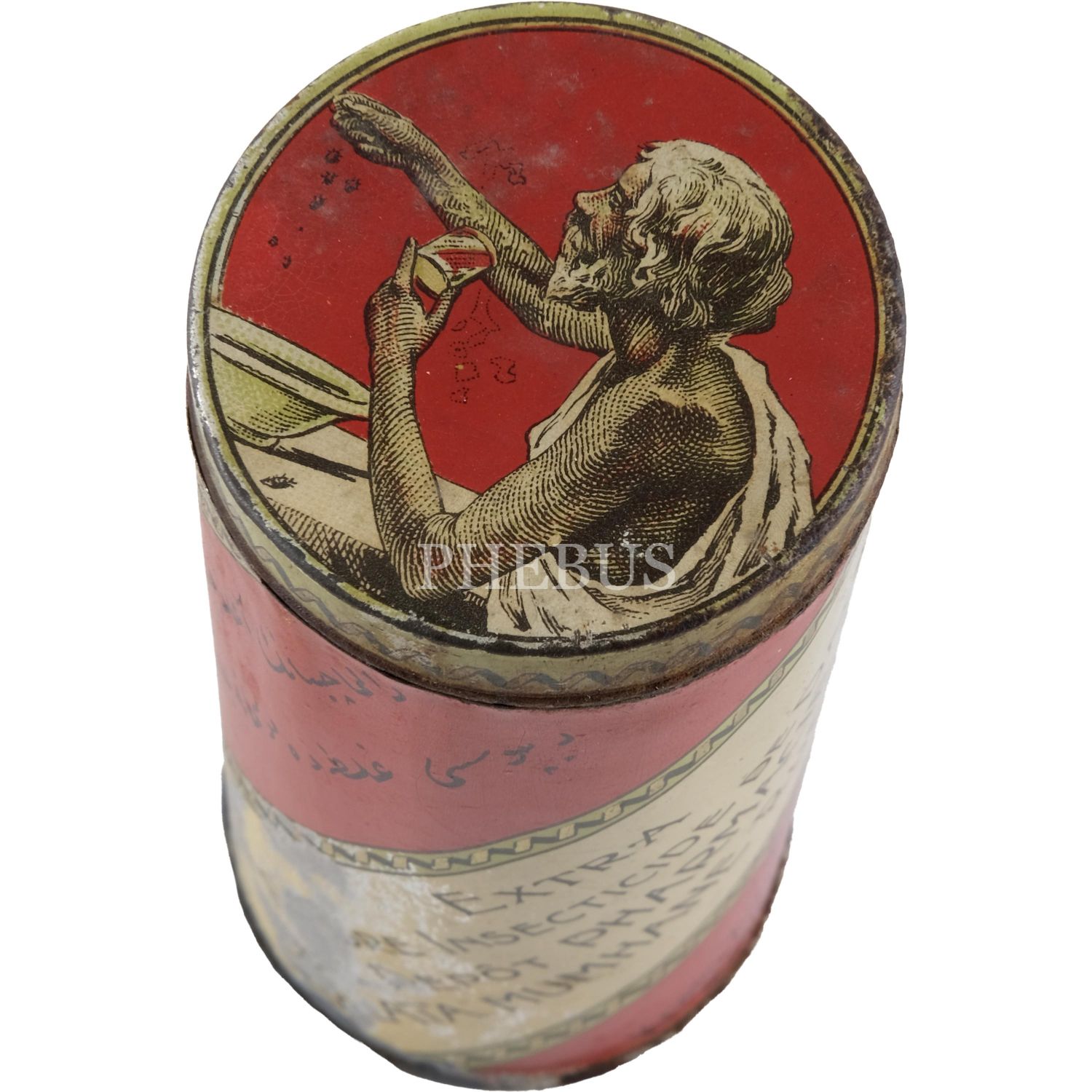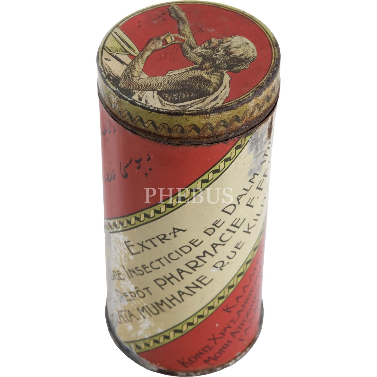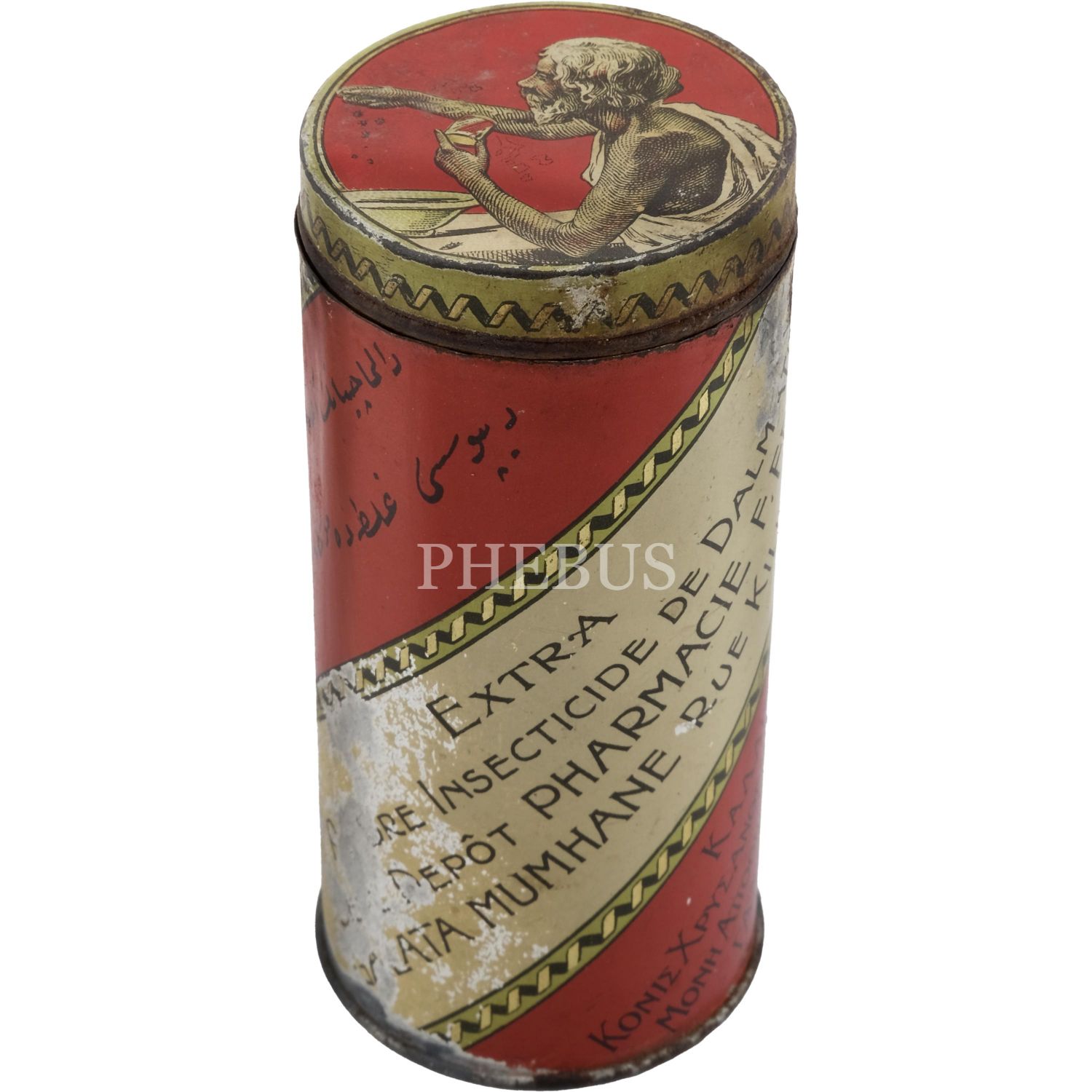 Galata´da faaliyet gösteren Ferri Eczahanesi´nin imal ettiği pire ve tahta biti tozunun Osmanlıca, Fransızca ve Rumca etiketli teneke kutusu, çap 4 cm, yükseklik 10 cm...