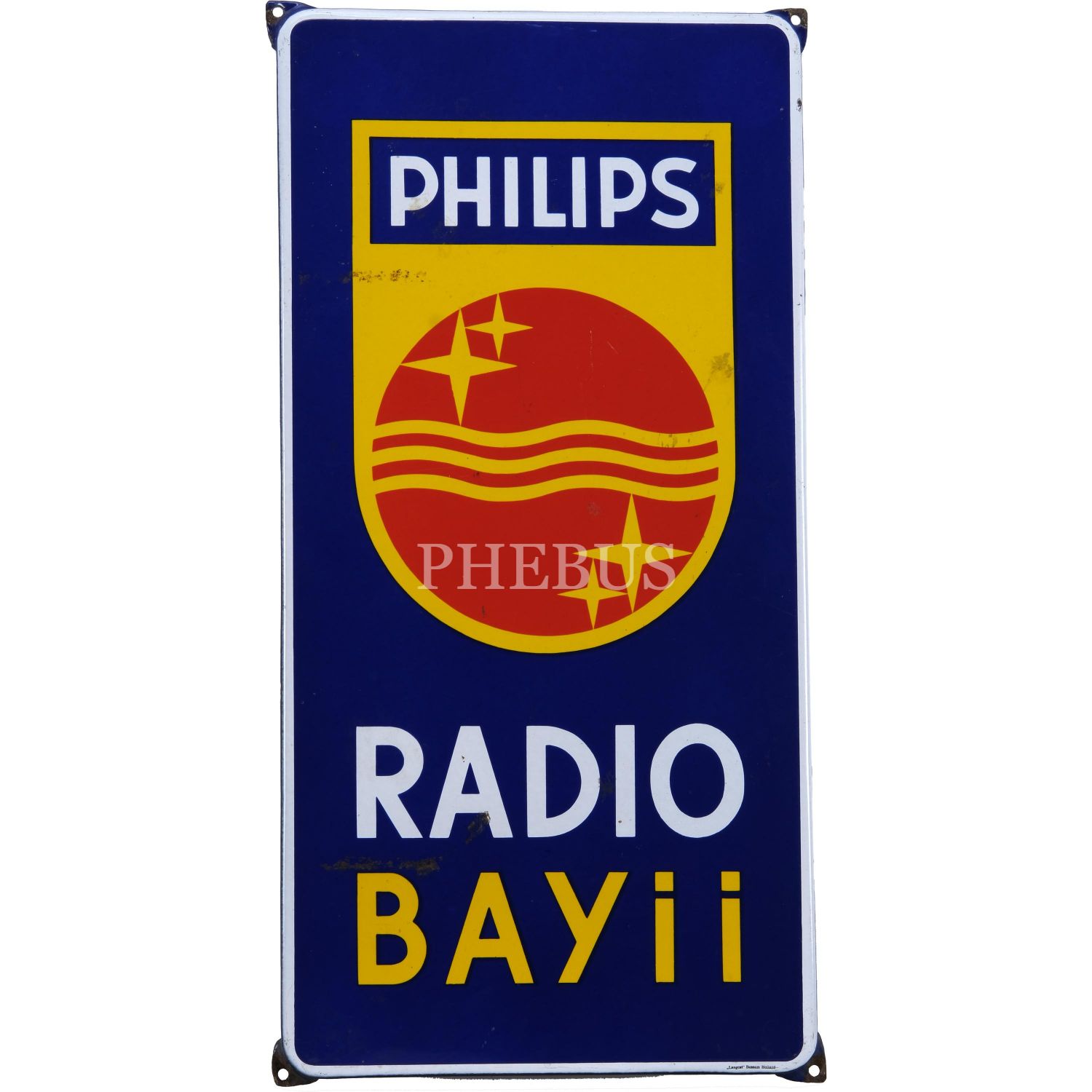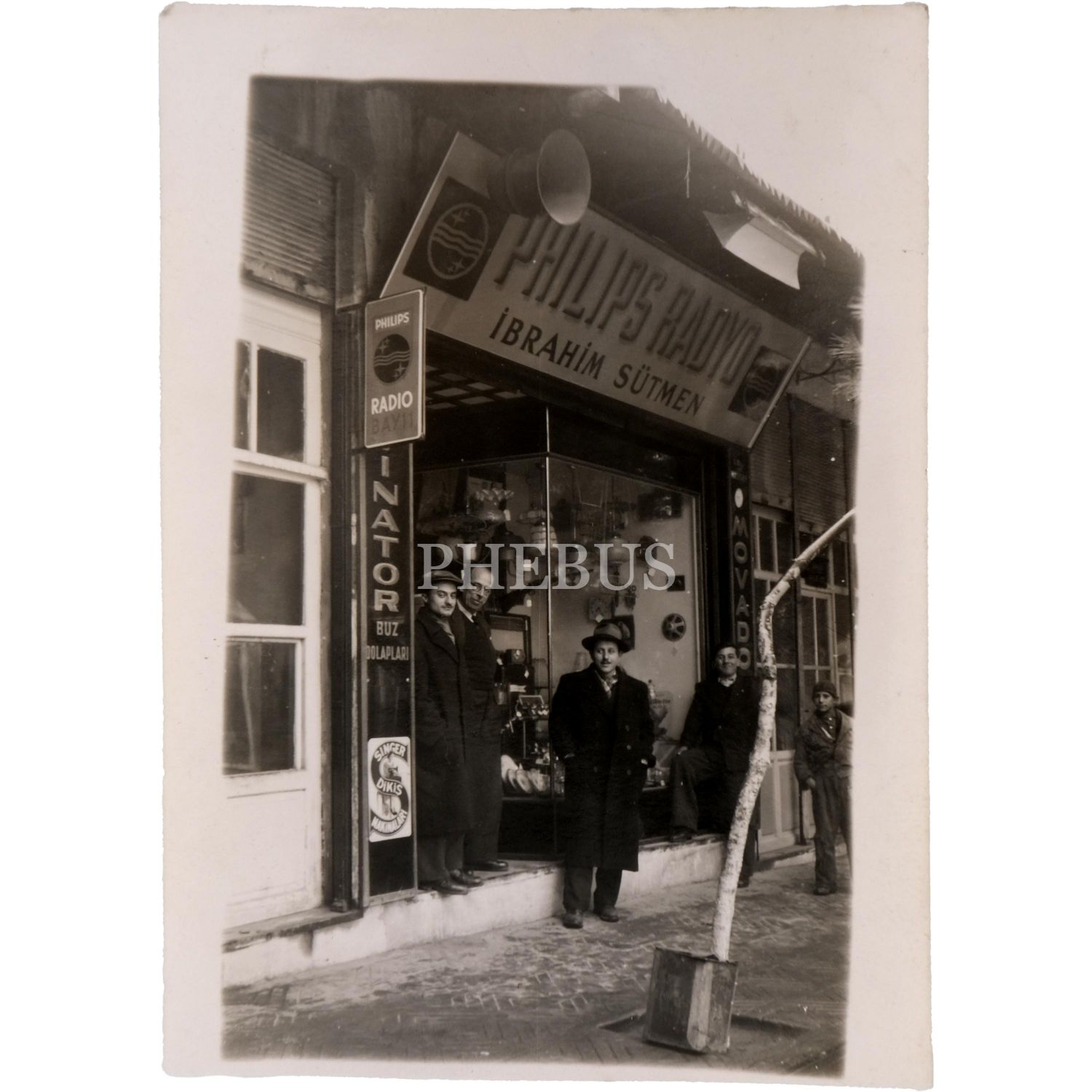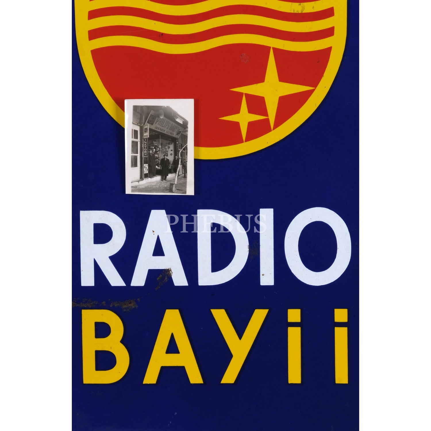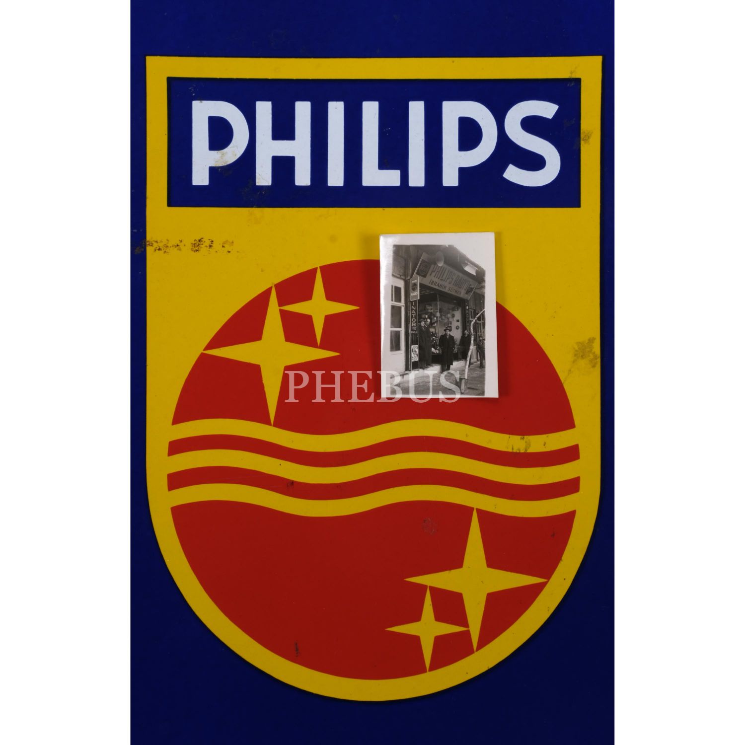 "Philips Radio Bayii" yazılı emaye tabela ve aynı tabelanın asılı olduğu İbrahim Sütmen Philips Radyo Bayii´nin fotoğrafı, 35x70 cm...