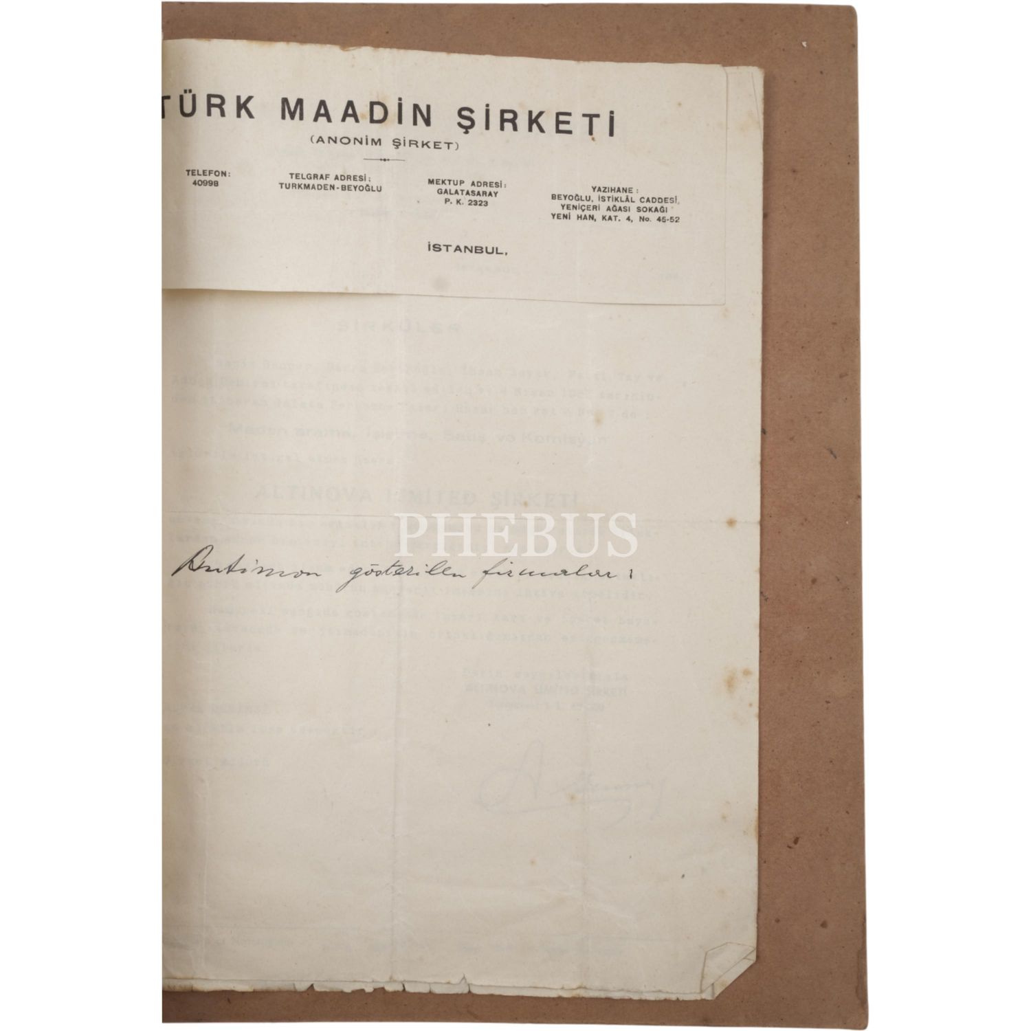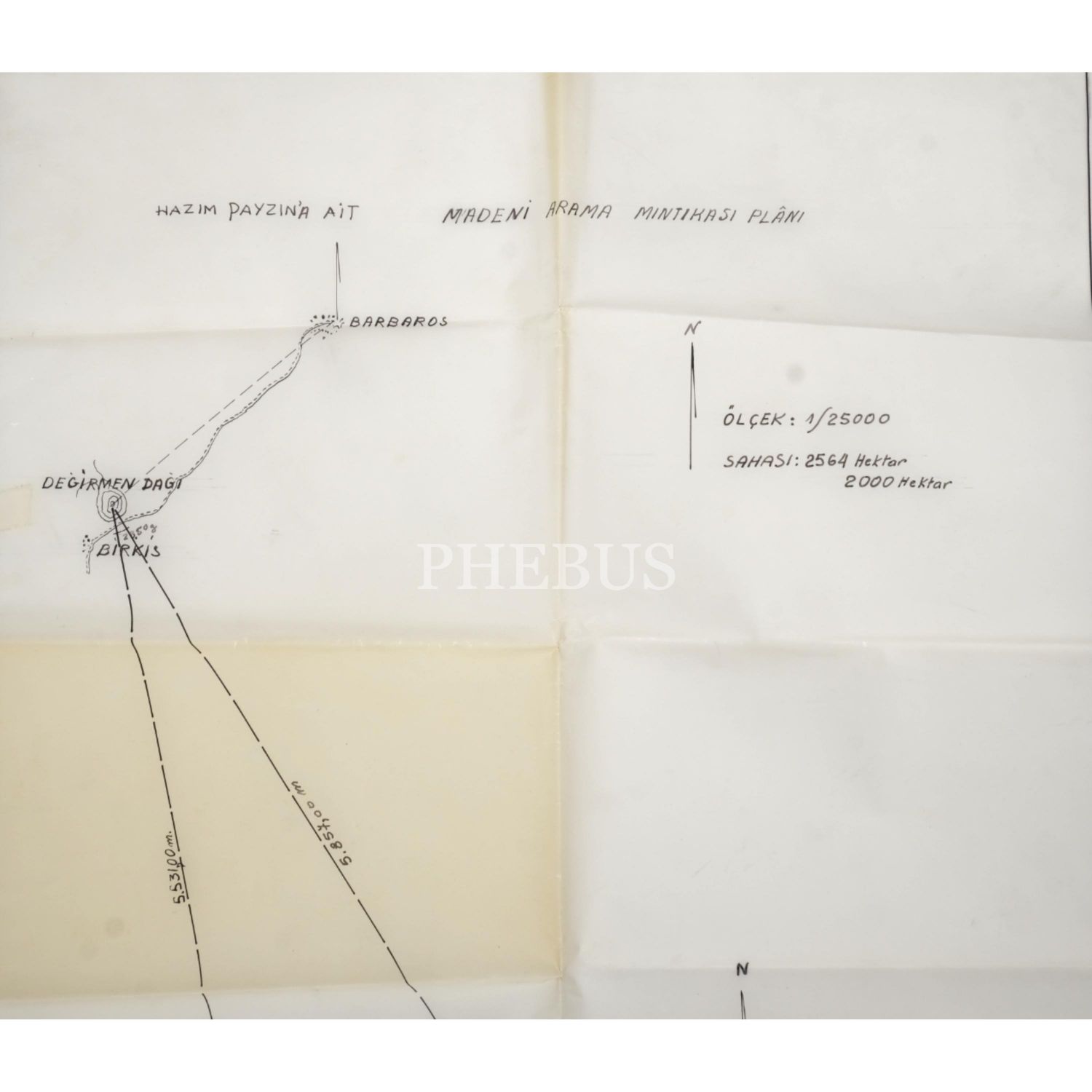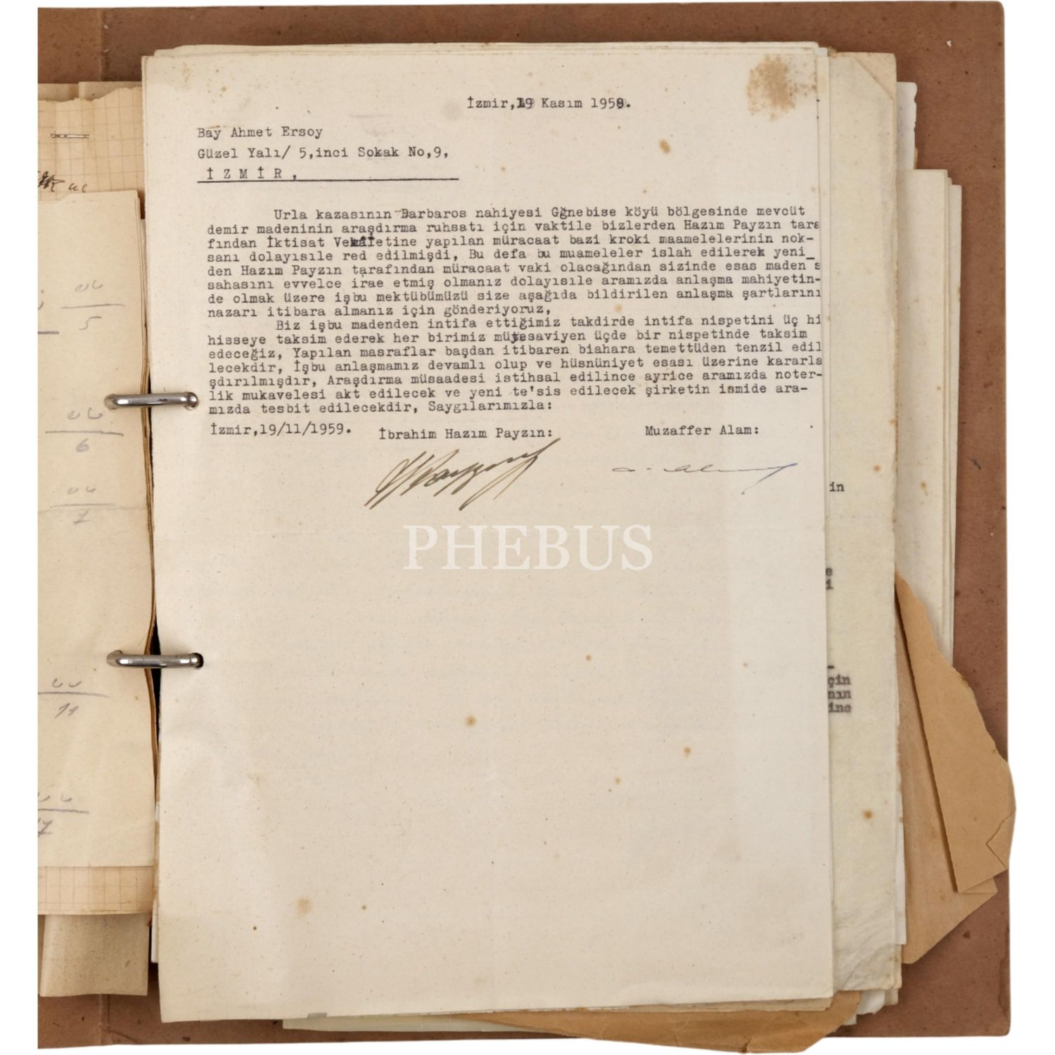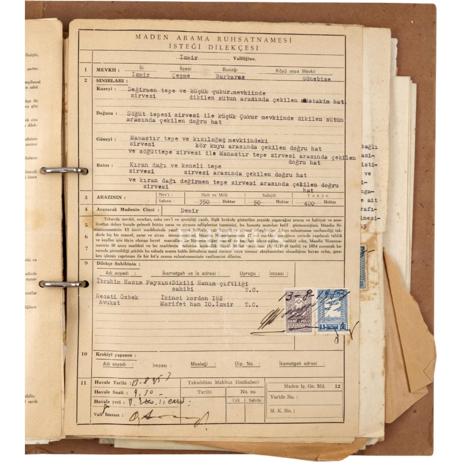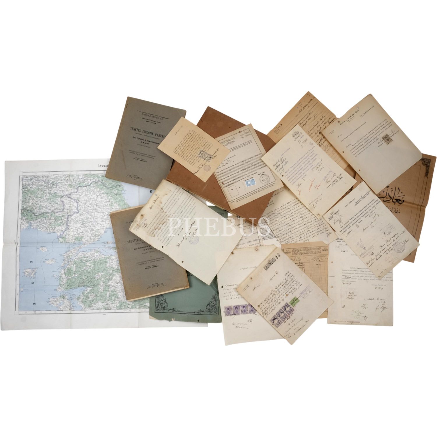 İzmir´in özellikle Efemçukuru, Kavacık ve Karaburun bölgelerinde, Osmanlı´nın son ve Cumhuriyet´in erken dönemlerinde kurulan altın ve simli kurşun madenleri hakkında çok sayıda evrak ve harita içeren lot...