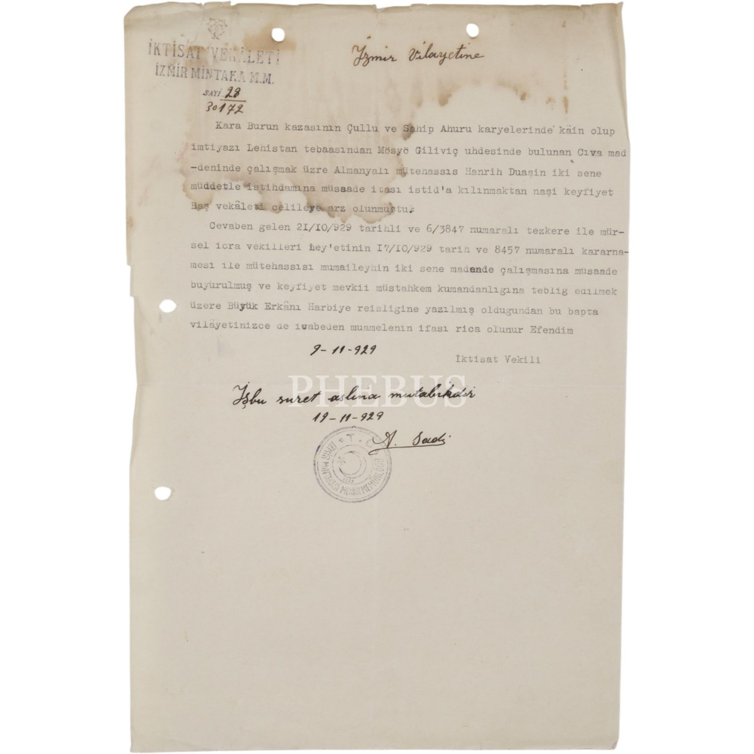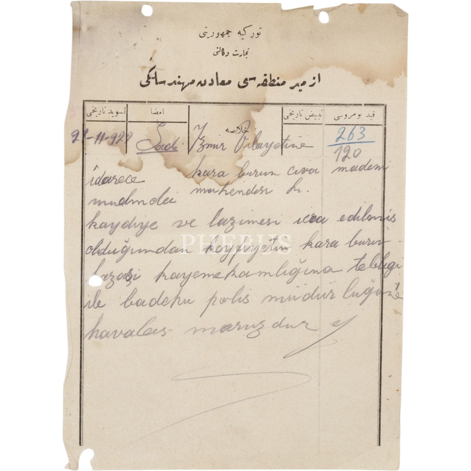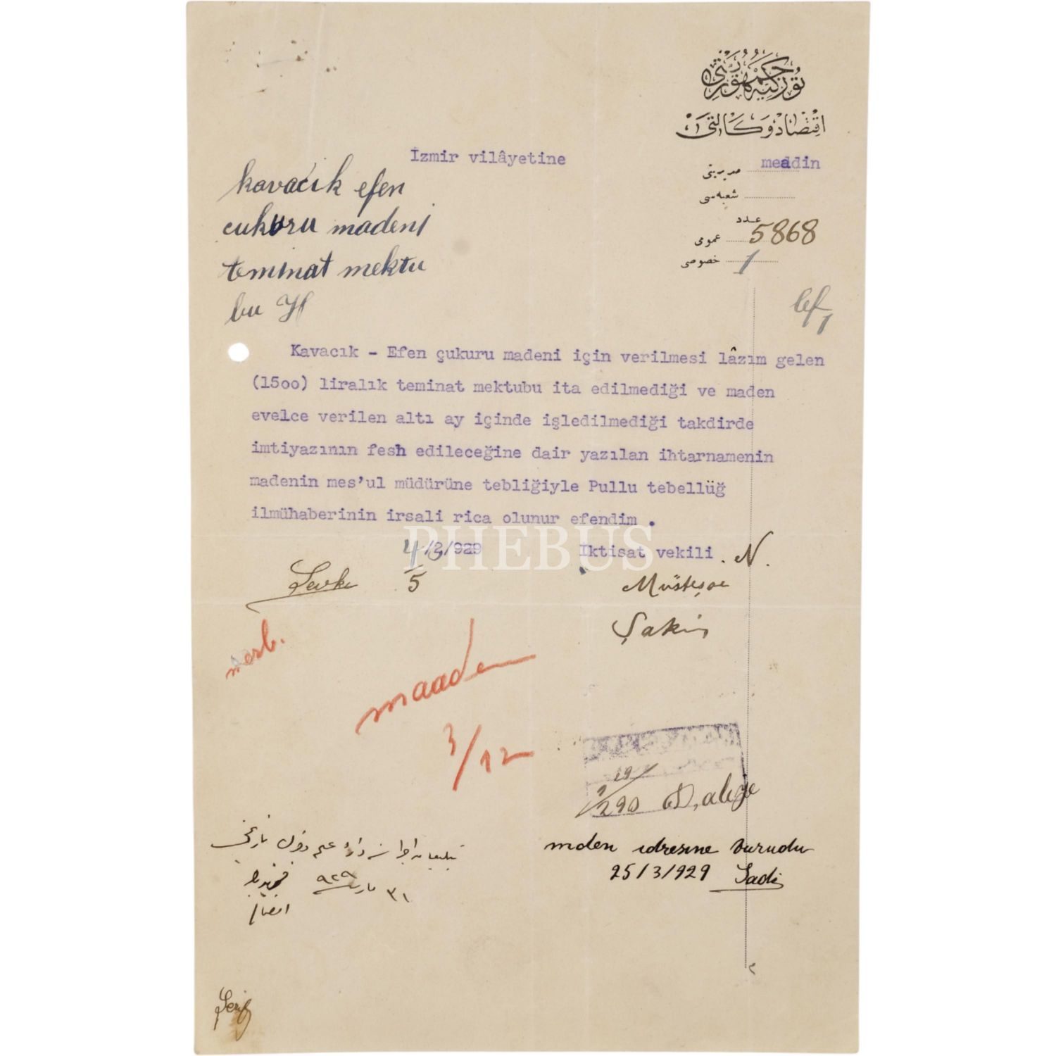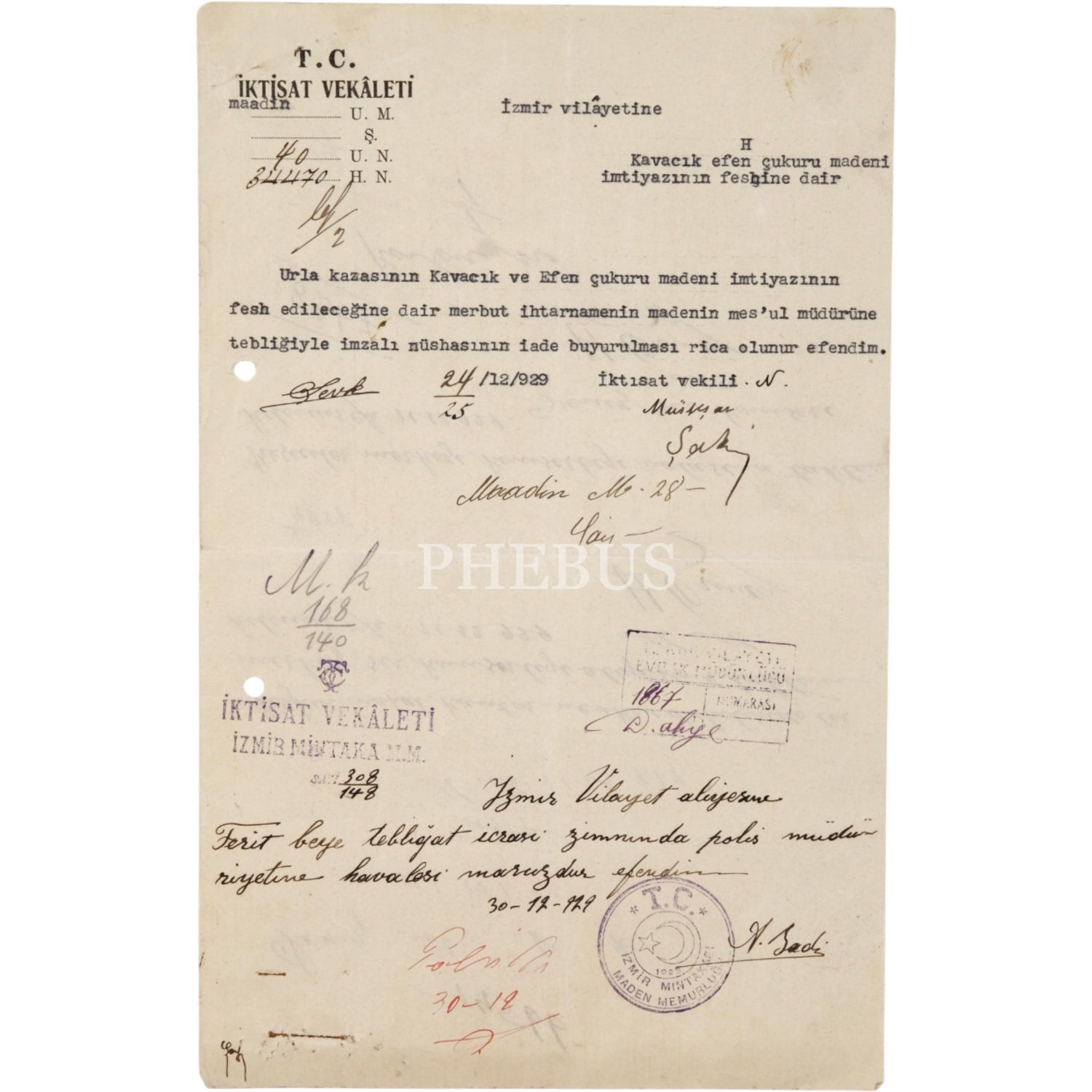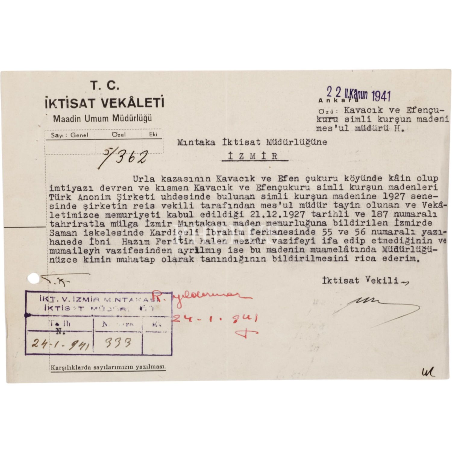 İzmir´in özellikle Efemçukuru, Kavacık ve Karaburun bölgelerinde, Osmanlı´nın son ve Cumhuriyet´in erken dönemlerinde kurulan altın ve simli kurşun madenleri hakkında çok sayıda evrak ve harita içeren lot...