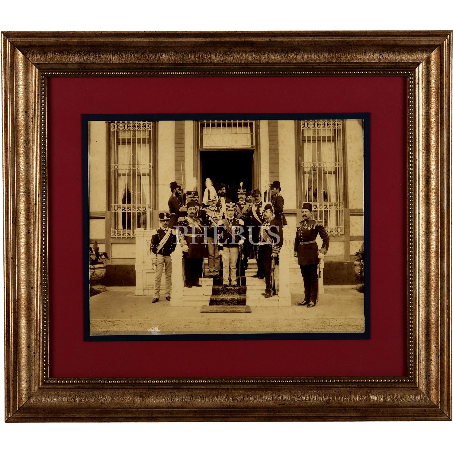 Ünlü Osmanlı ressamlarından Şeker Ahmet Paşa ve İstanbul´a ziyaret gerçekleştiren Avusturya Veliaht Prensi Rudolf´un, Yıldız Sarayı Şale Köşkü önünde çektirdikleri hatıra fotoğrafı, 50x43 cm...