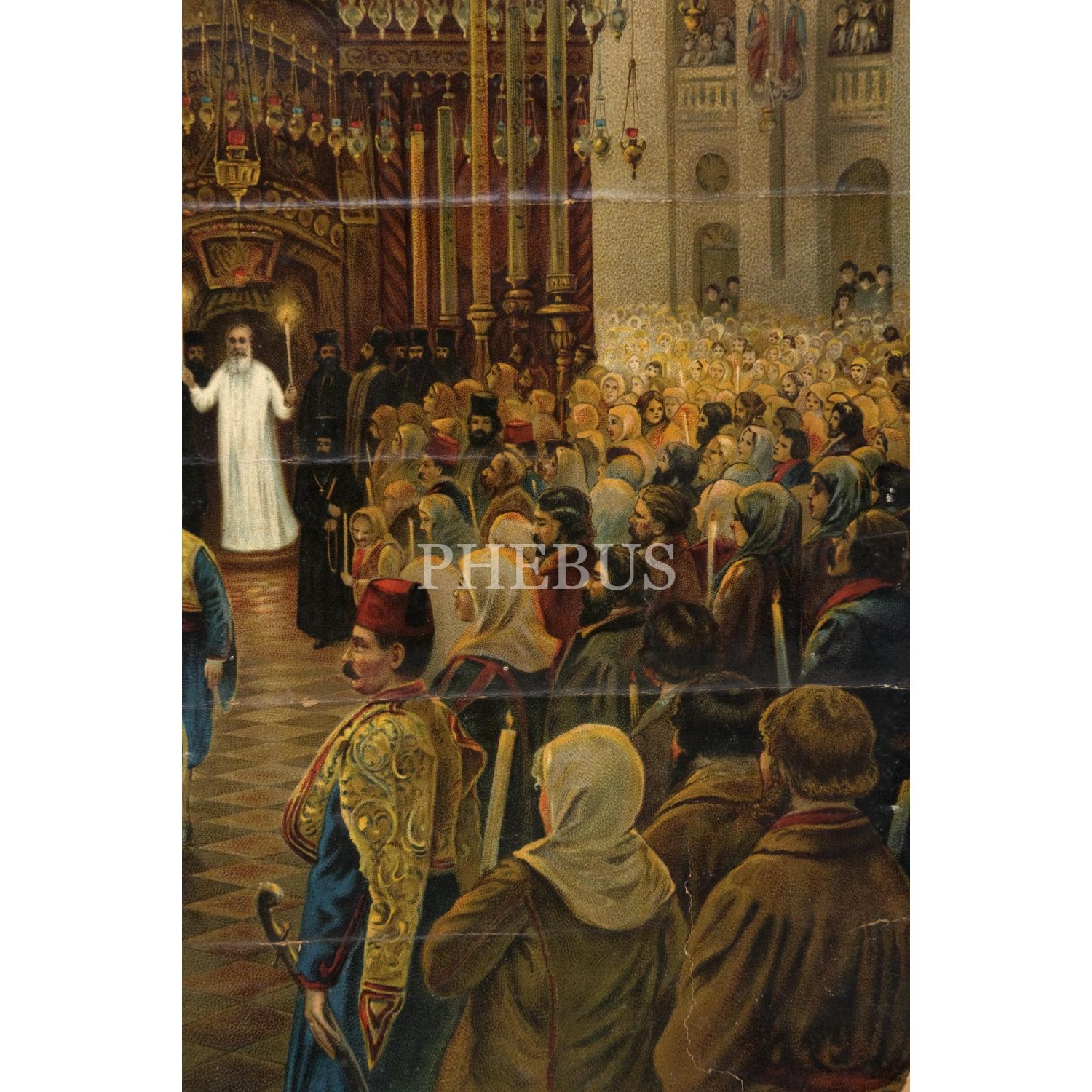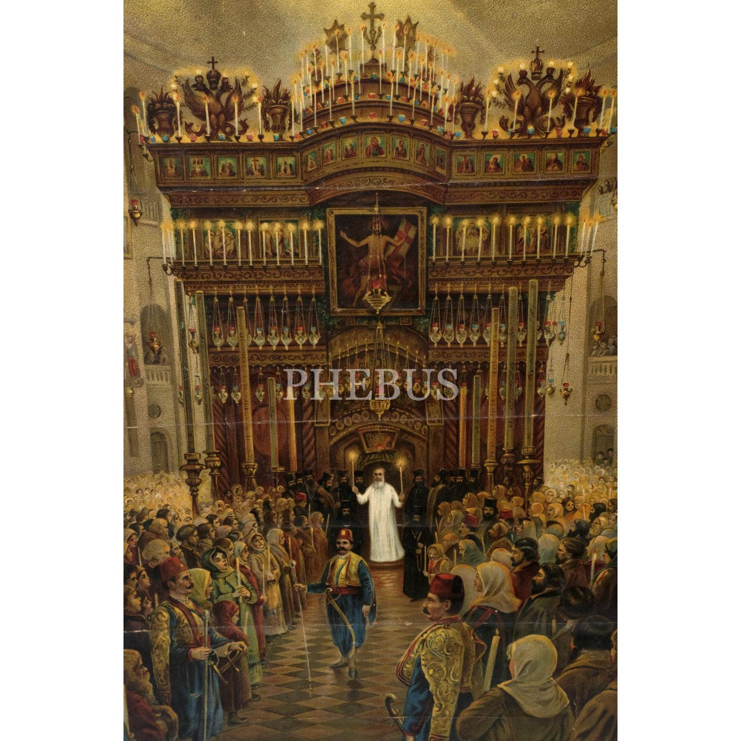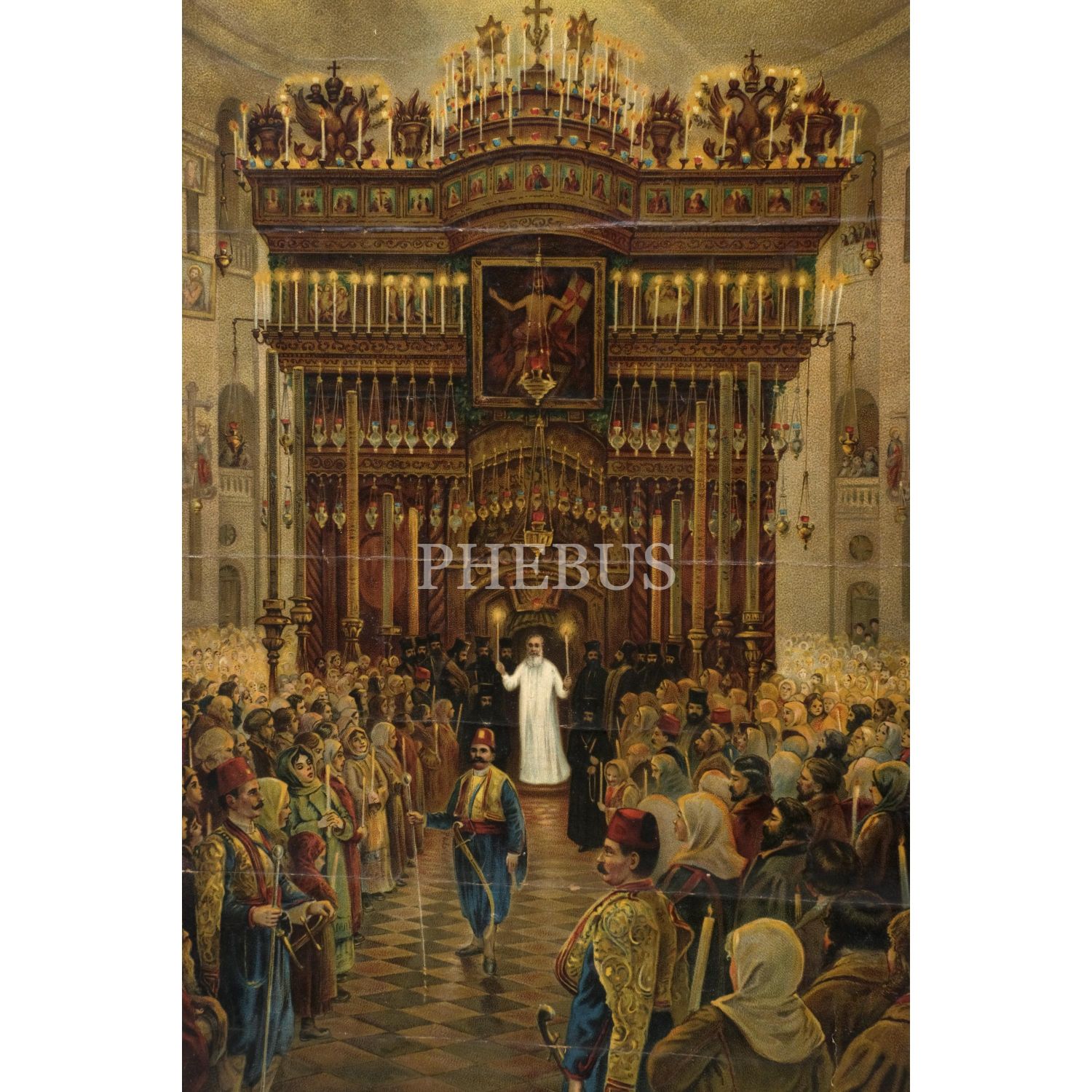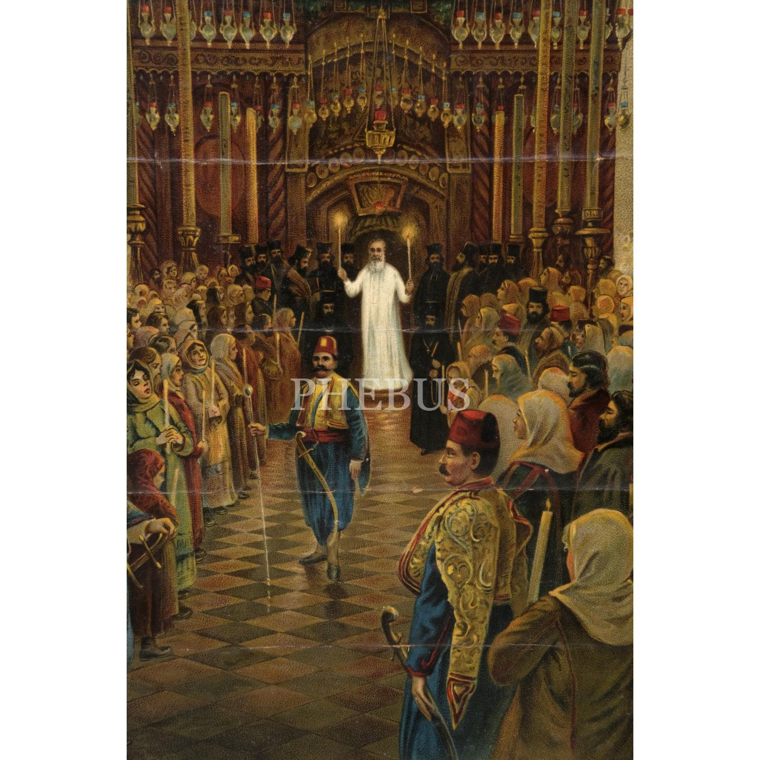Kudüs´te bulunan Kutsal Kabir Kilisesi´nde düzenlenen Kutsal Ateş ayinini yöneten Kudüs Rum Ortodoks Patriği ve Osmanlı´nın kendisine tahsis ettiği muhafızların görüldüğü baskı resim, 33x43 cm...