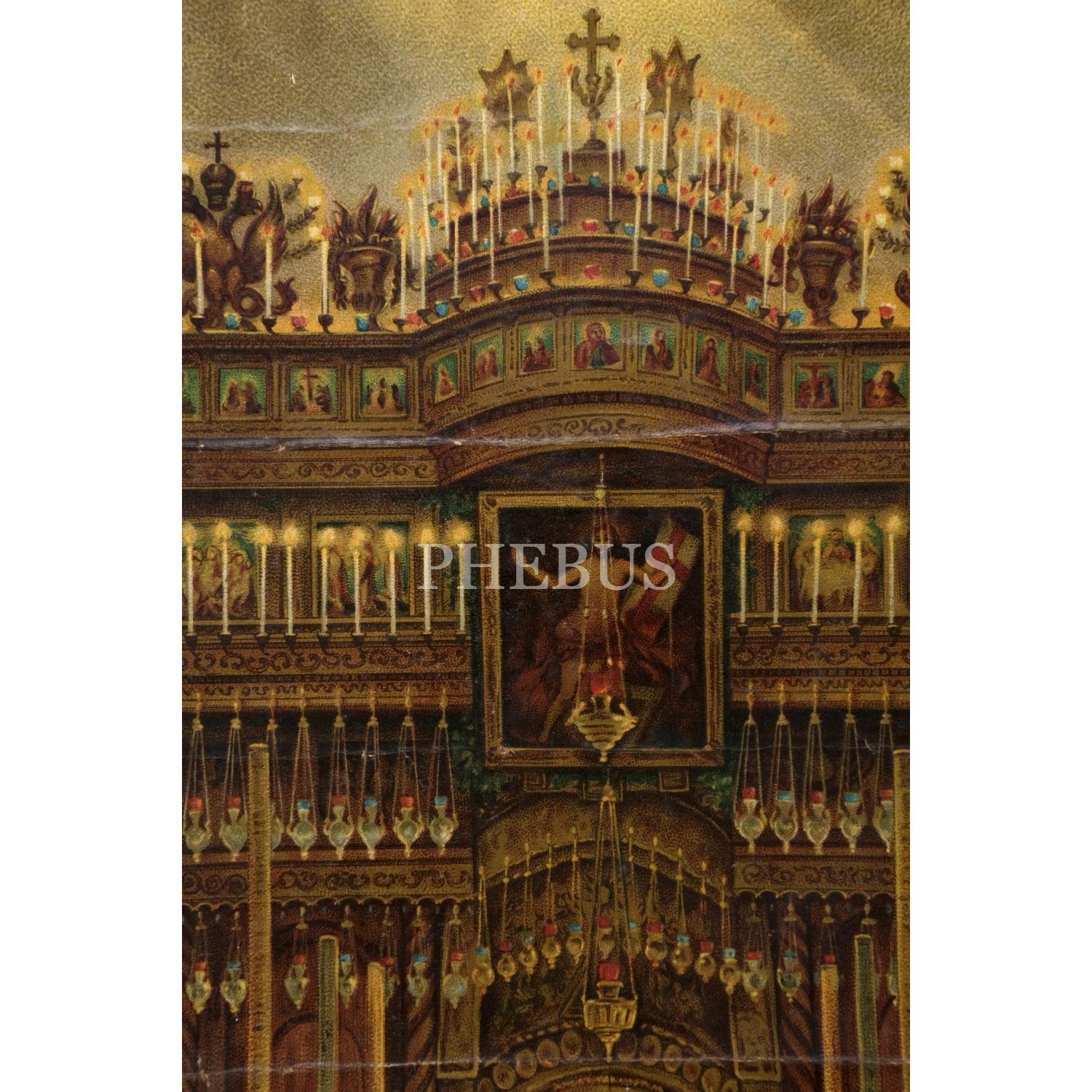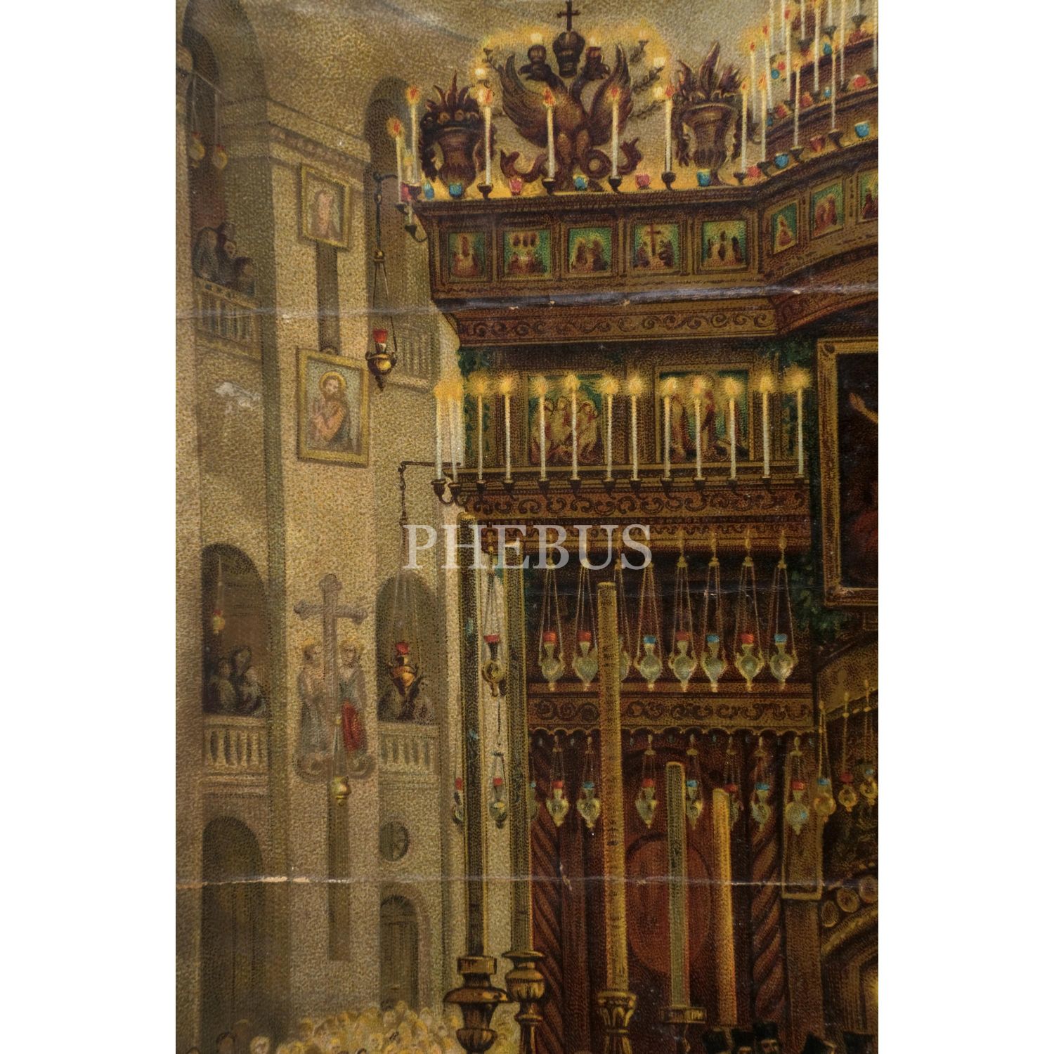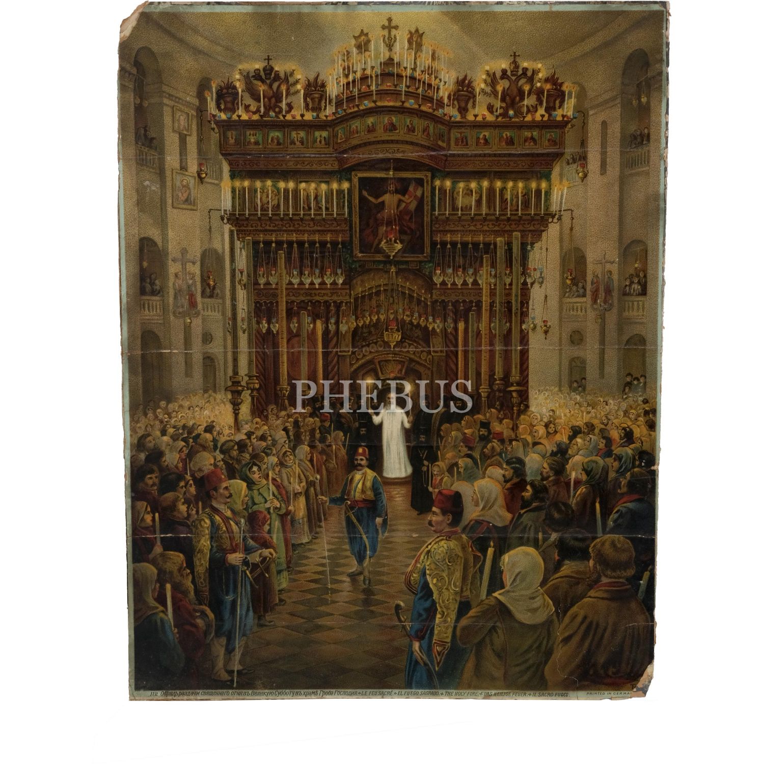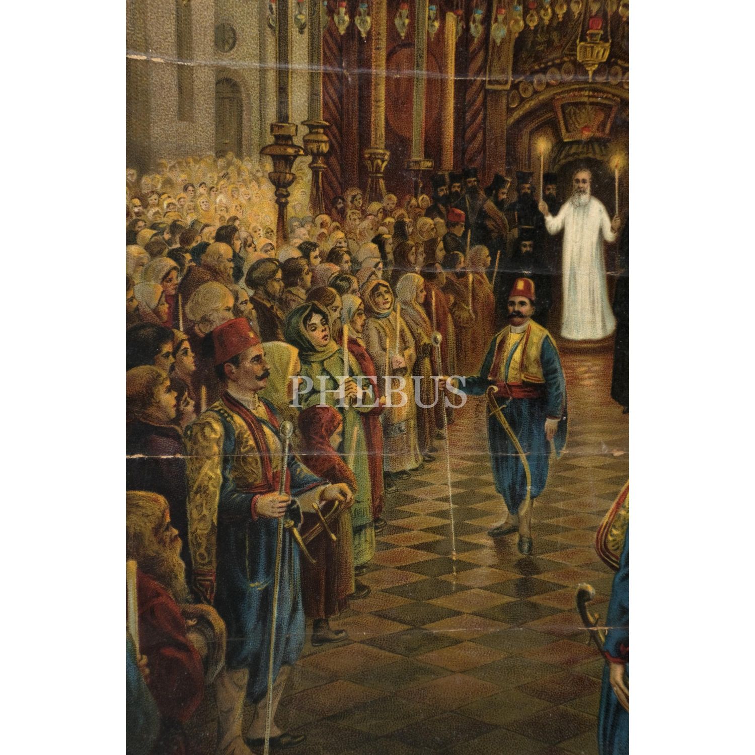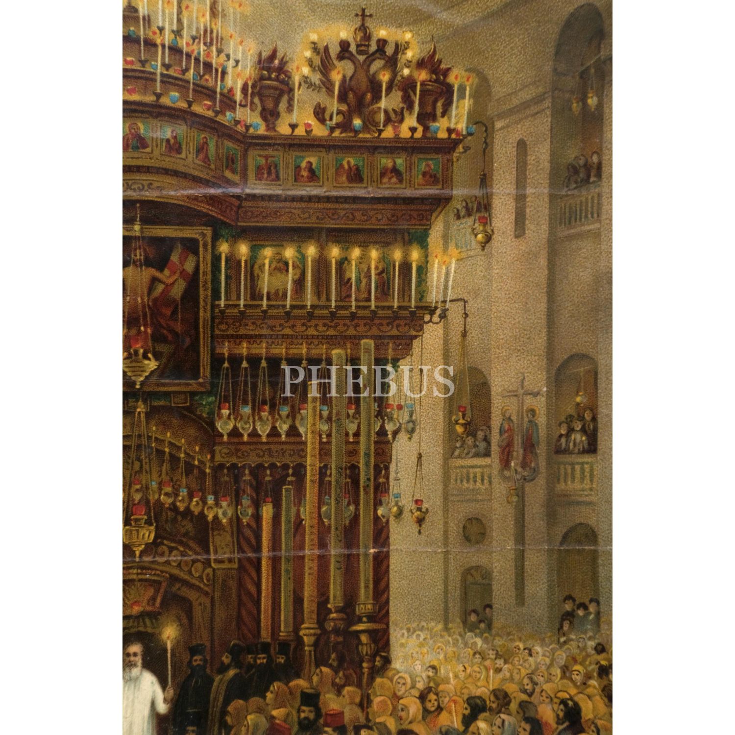 Kudüs´te bulunan Kutsal Kabir Kilisesi´nde düzenlenen Kutsal Ateş ayinini yöneten Kudüs Rum Ortodoks Patriği ve Osmanlı´nın kendisine tahsis ettiği muhafızların görüldüğü baskı resim, 33x43 cm...