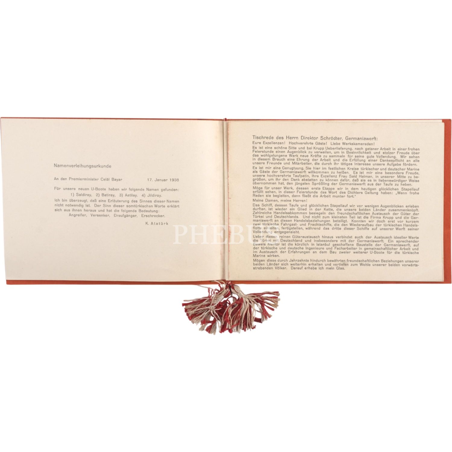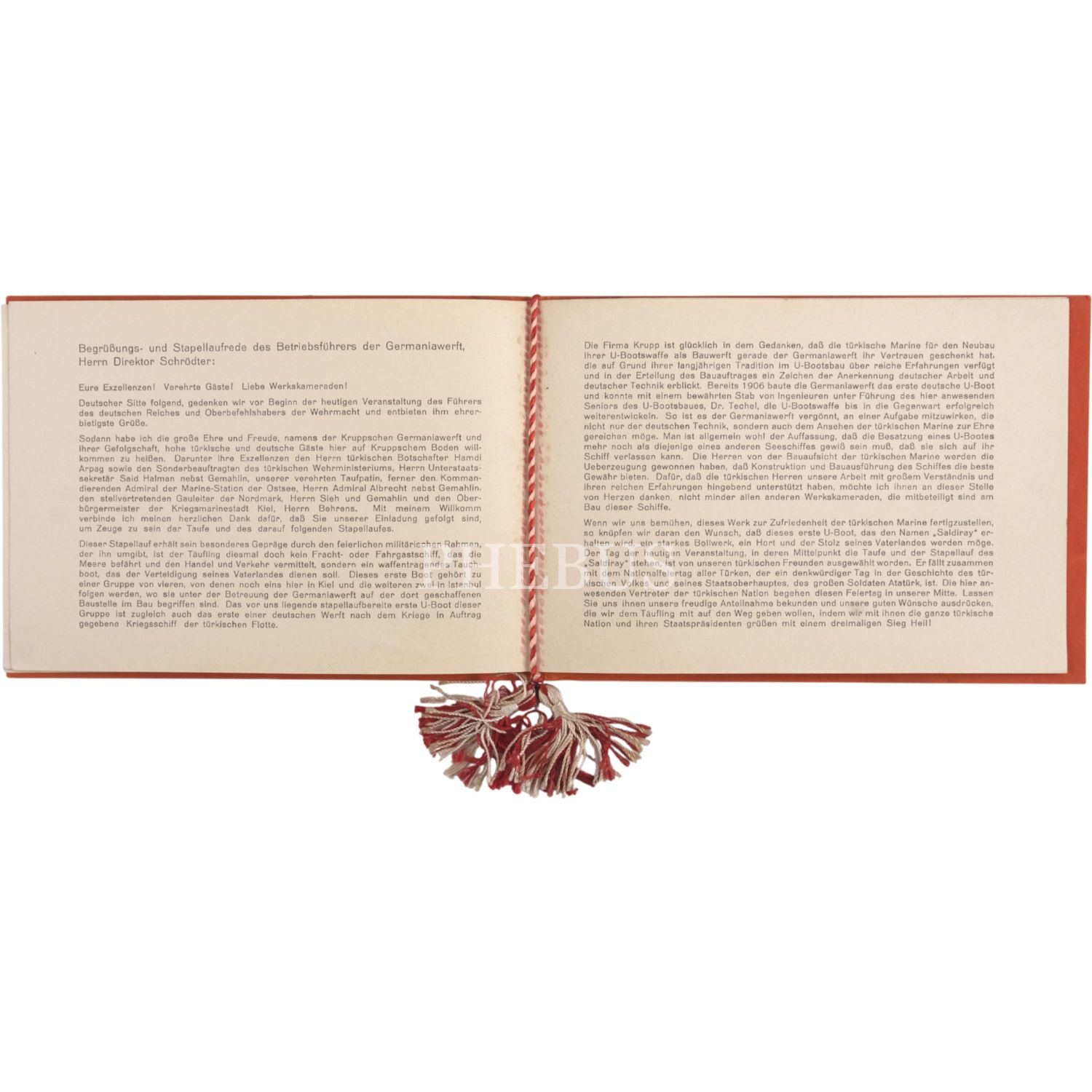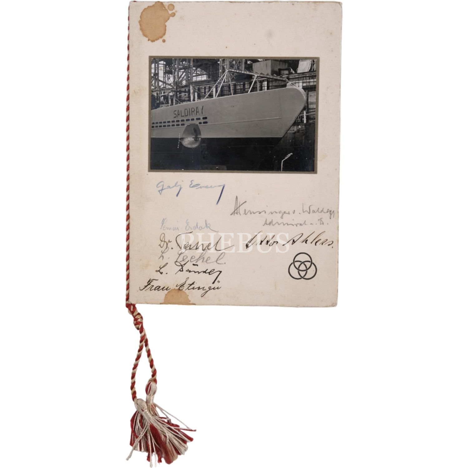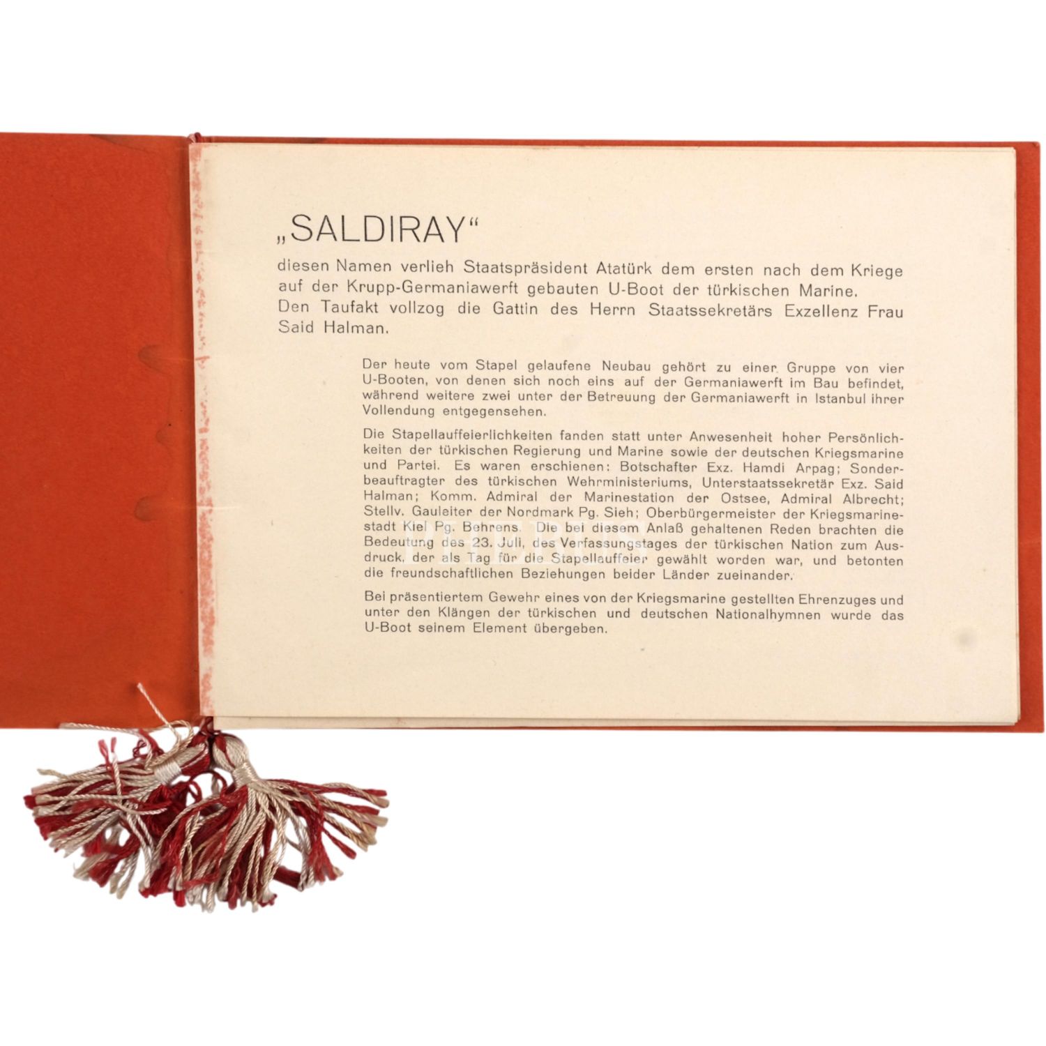 İsim babalığını Mustafa Kemal Atatürk´ün yaptığı ve Türkiye´nin ilk denizaltılarından olan Batıray ve Saldıray´ın Almanya´nın Kiel şehrinde bulunan Germaniawerft Tersanesi´ndeki inşa süreçleri ve suya indirilme merasimlerinden fotoğraflar ve Saldıray´ın suya indirlme merasiminin davetlilerden imzalı davetiyesi...