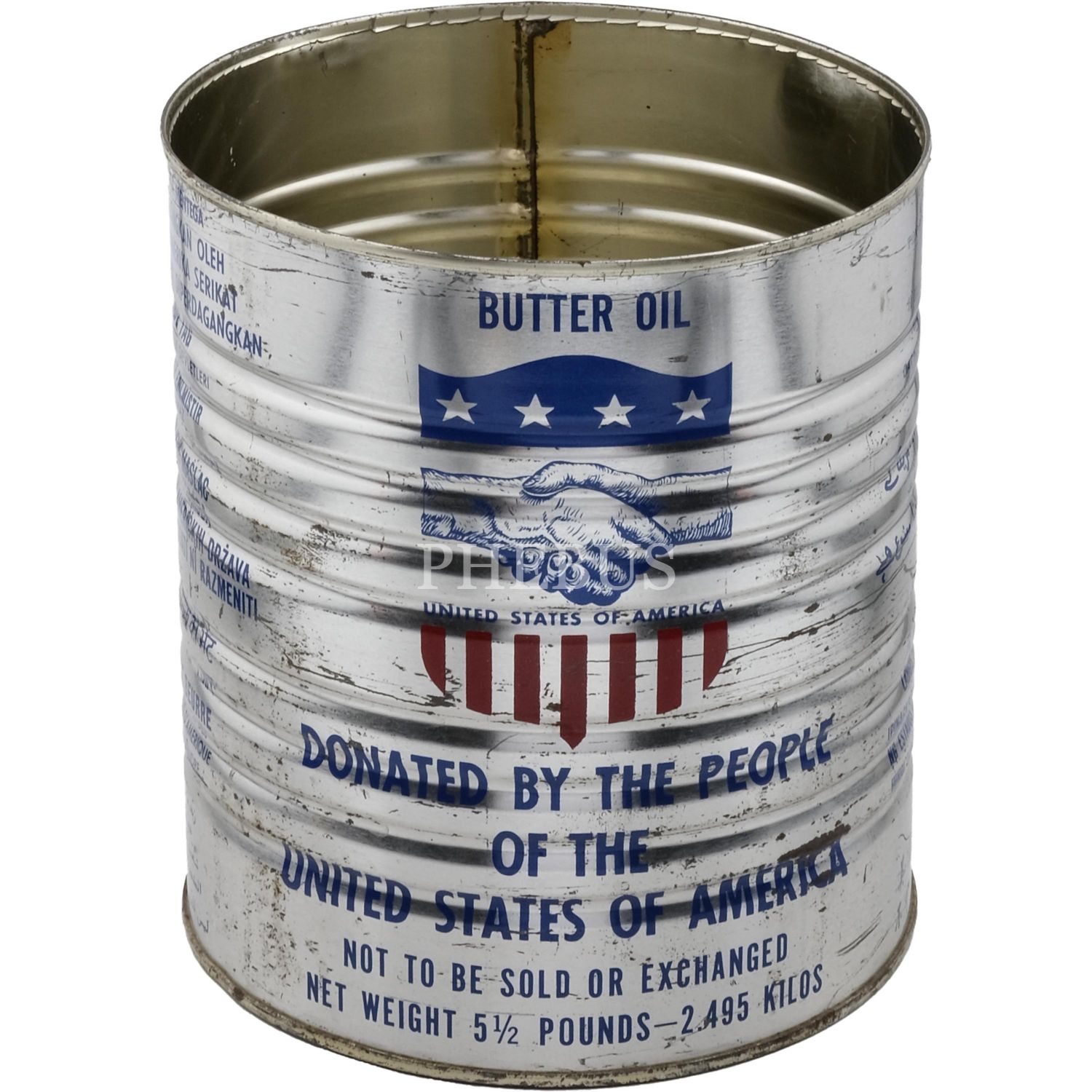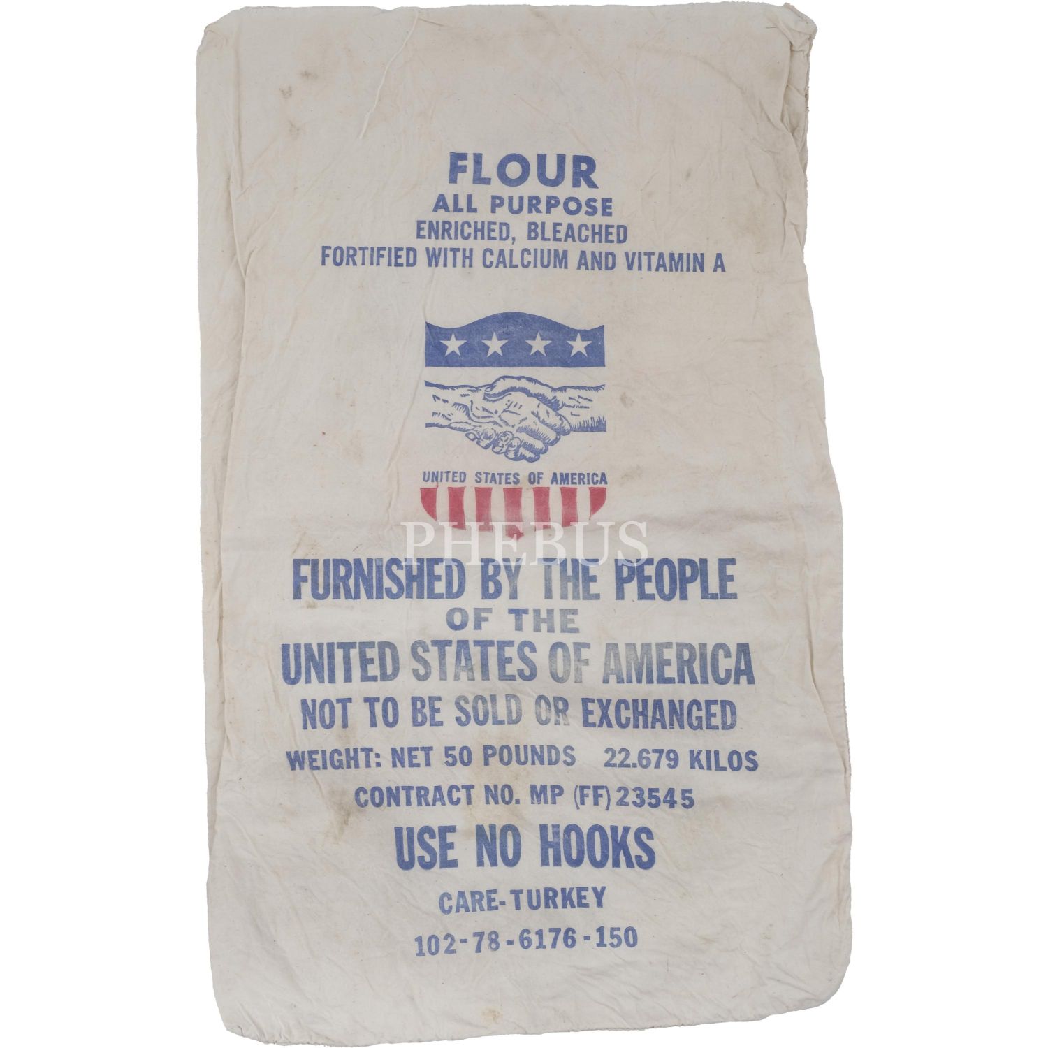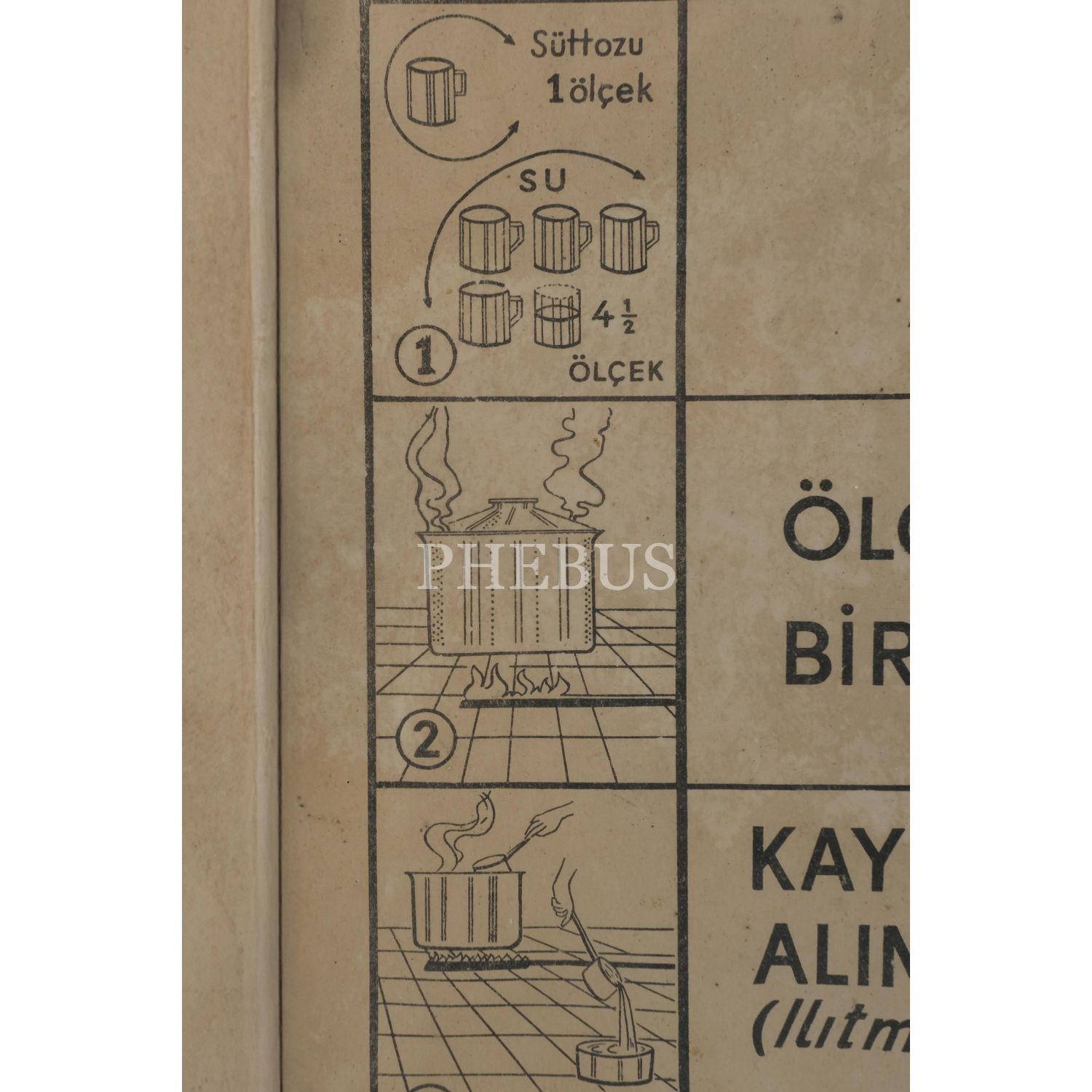 Marshall Planı ile Türkiye´ye gönderilen tereyağının orijinal tenekesi, zenginleştirilmiş unun çuvalı ve süt tozunun nasıl hazırlanacağını açıklayan afiş...