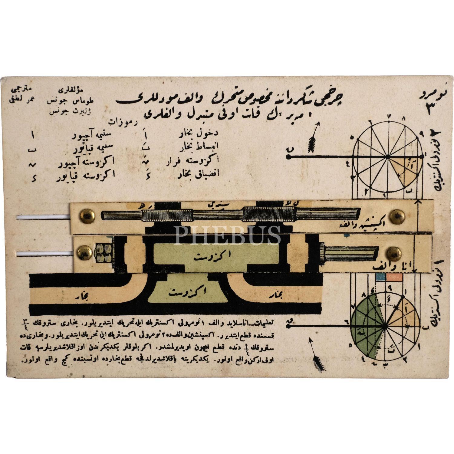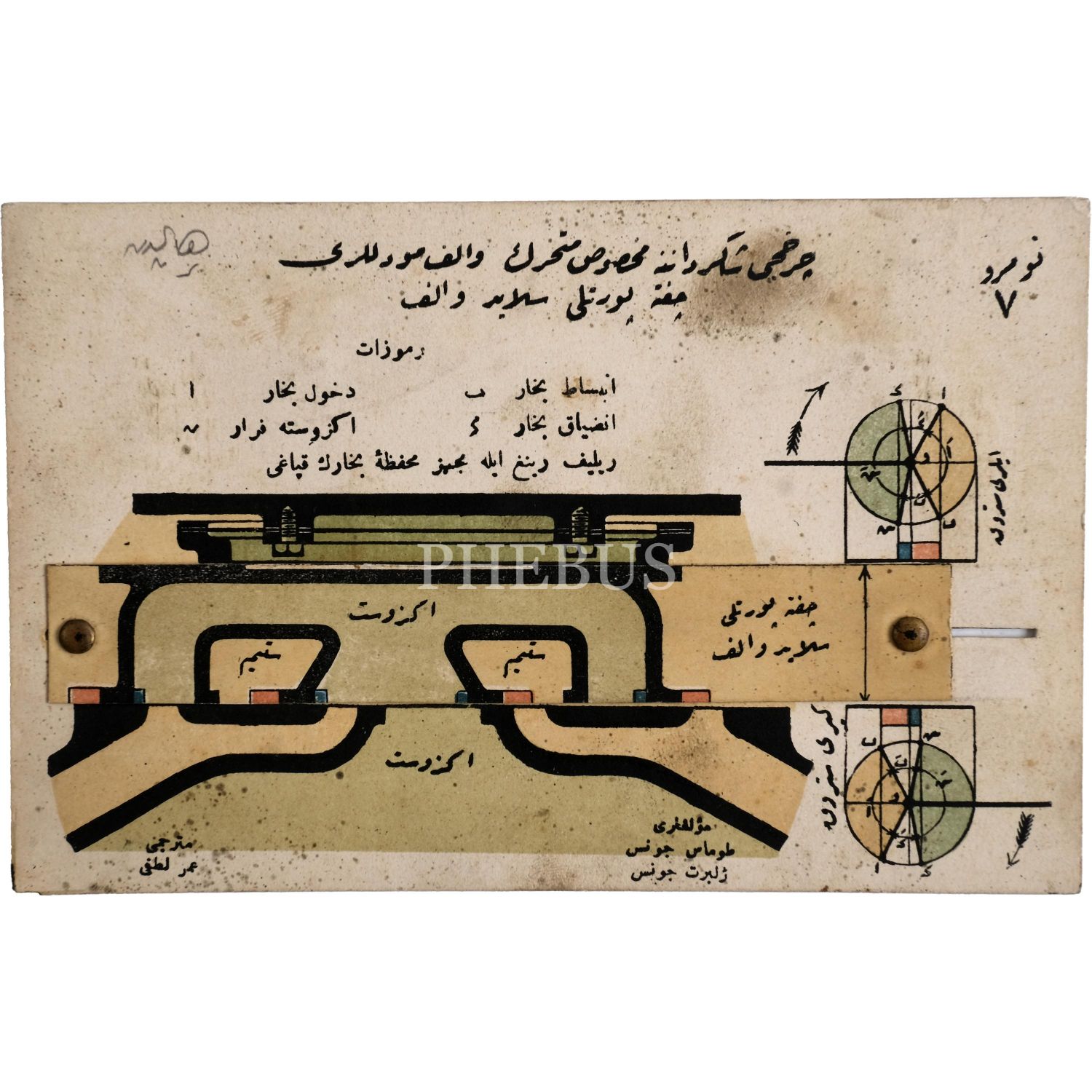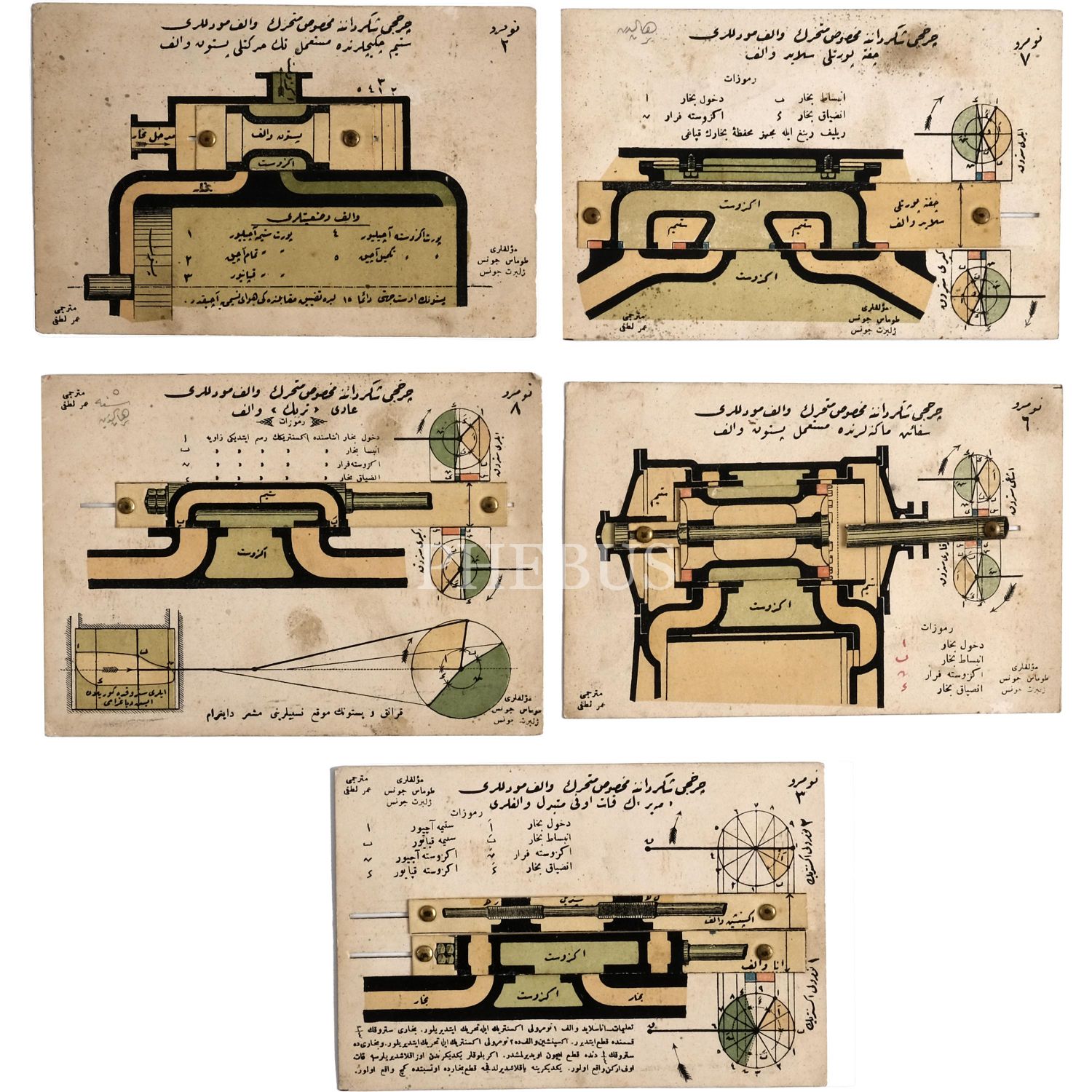 İngiliz Donanması´ndan Thomas Johns tarafından hazırlanan ve Ömer Lütfü Efendi tarafından Türkçe´ye tercüme edilen "Çarhçı şakirdanına mahsus müteharrik valf modelleri" başlıklı, oynar mekanizmalı 5 adet eğitim kartı, 15x10 cm...