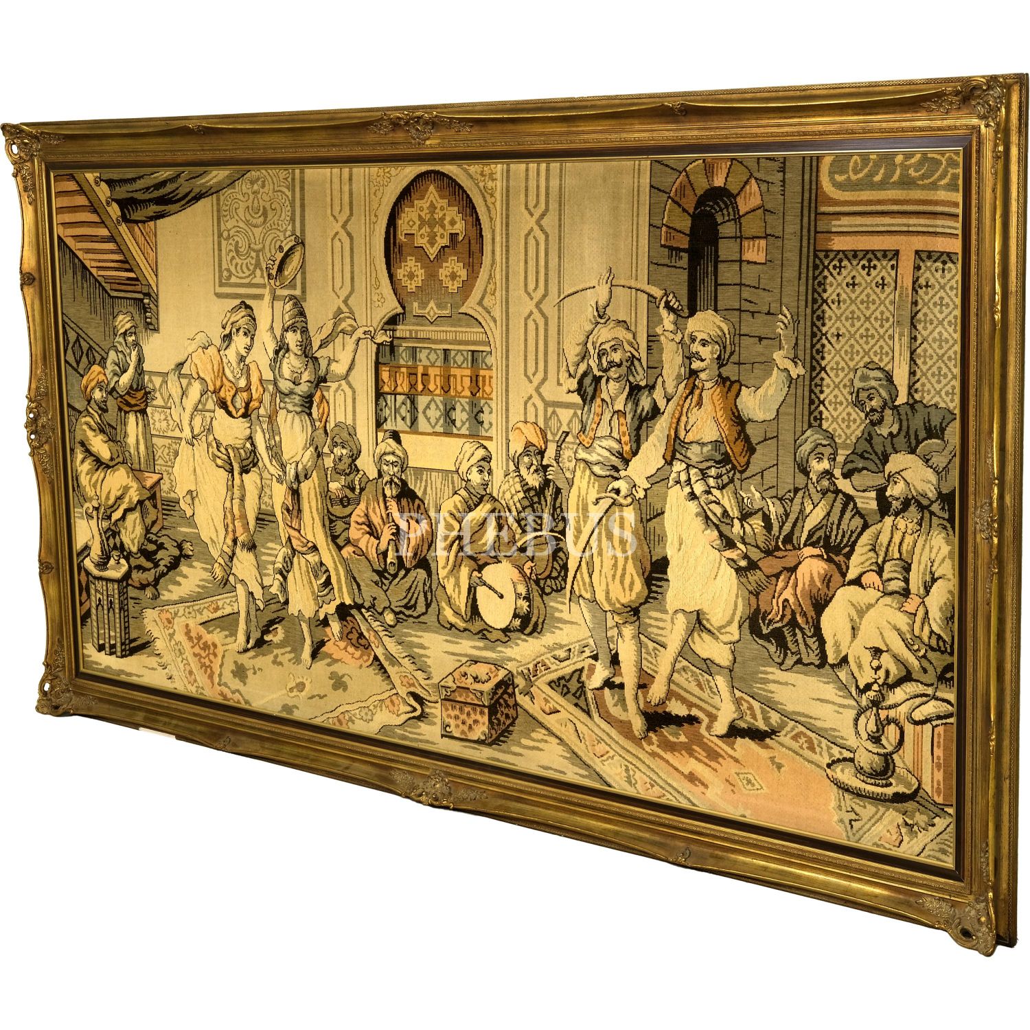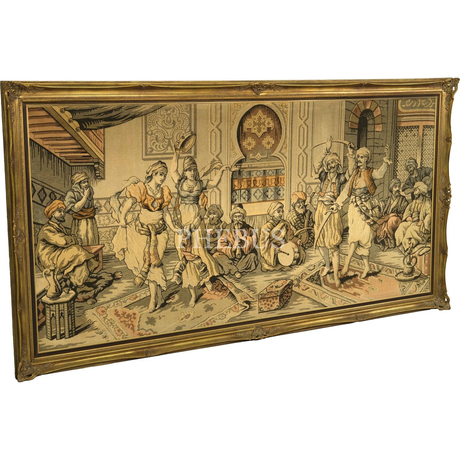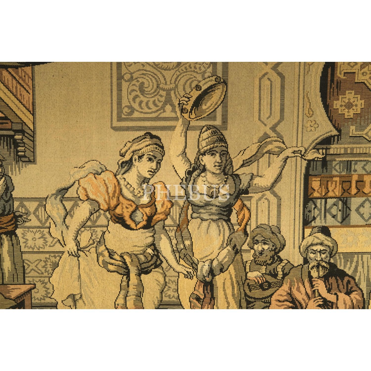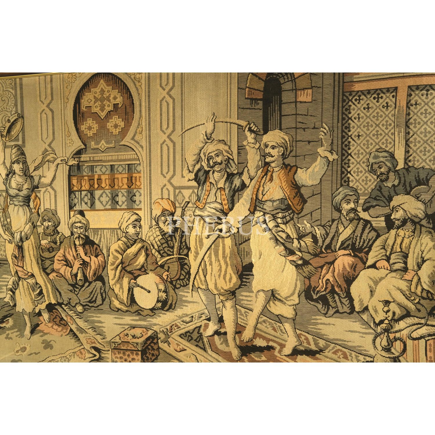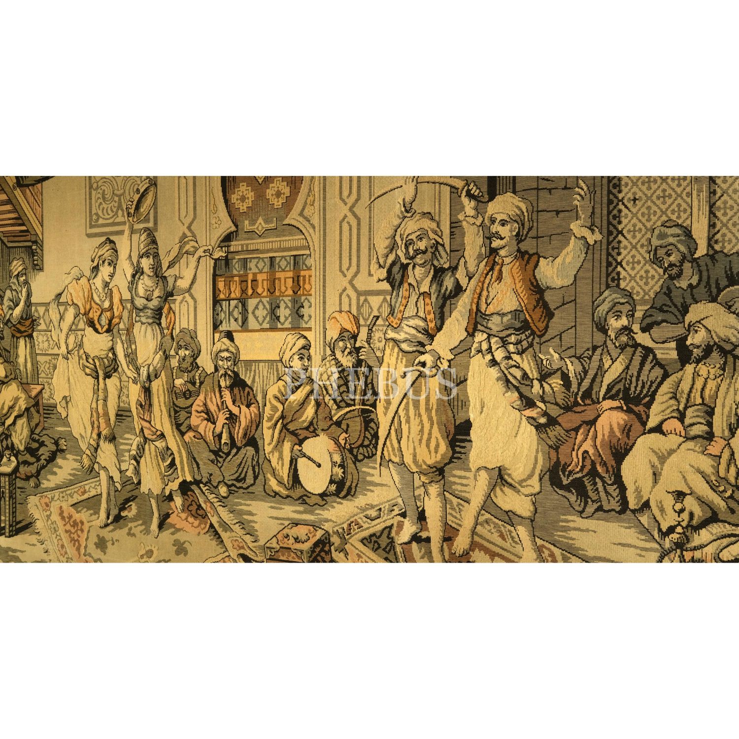Bir tarafta dans eden oryantallerin ve bir tarafta eli kılıçlı Osmanlı beylerinin betimlendiği goblen halı, halı ölçü: 251x121 cm, çerçevesiyle: 276x145 cm...