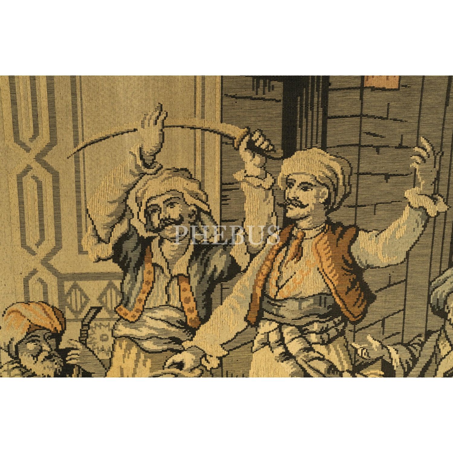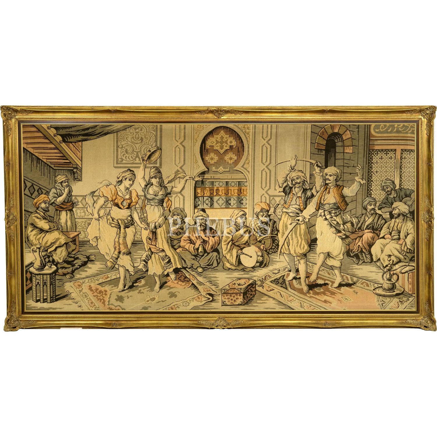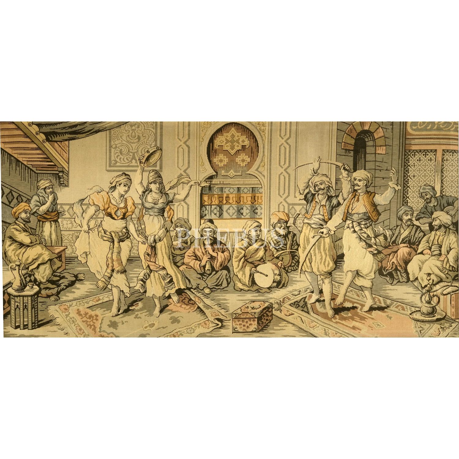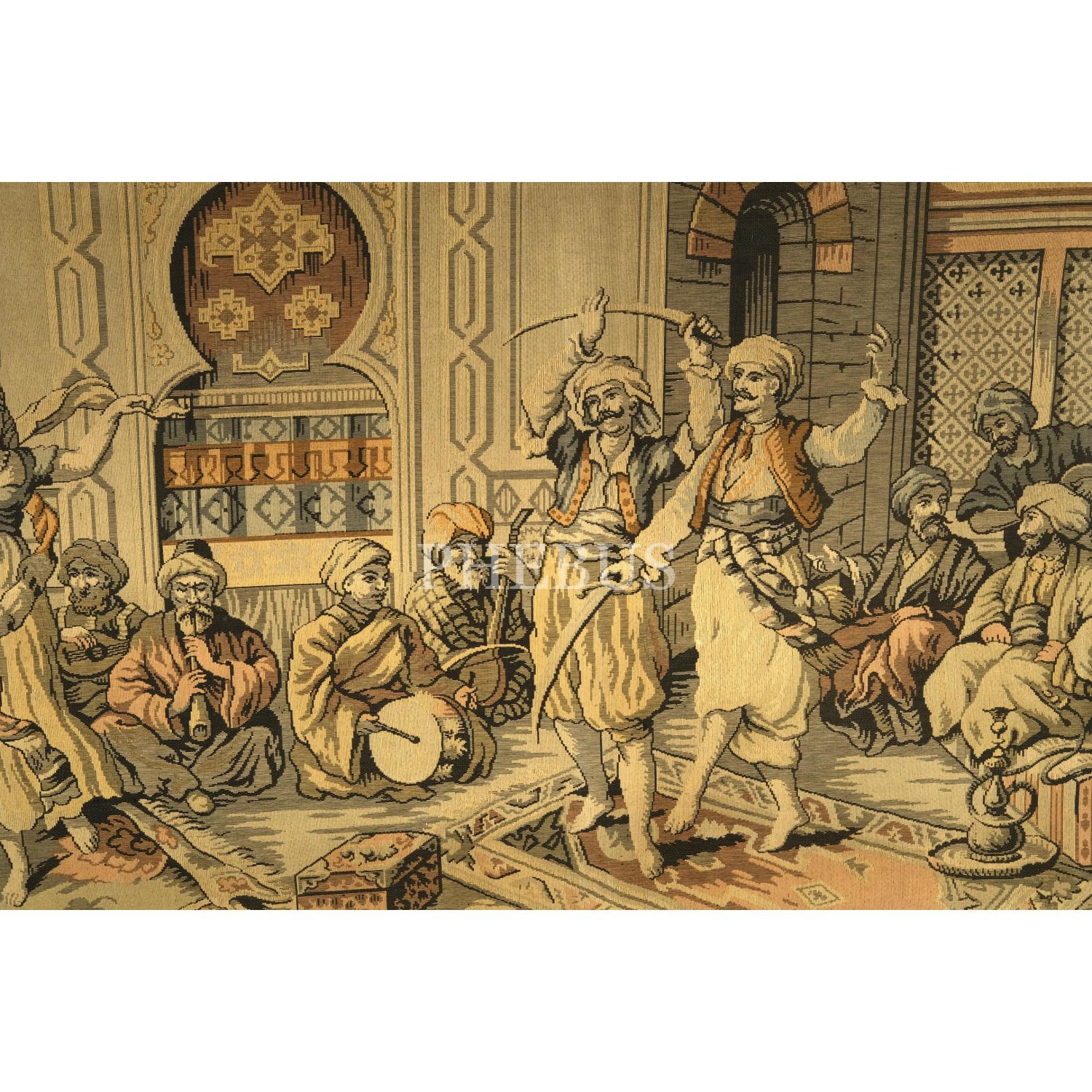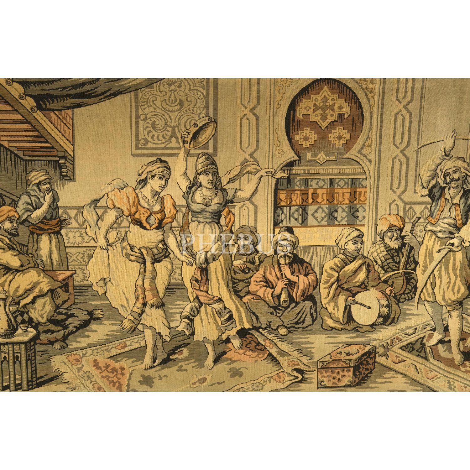 Bir tarafta dans eden oryantallerin ve bir tarafta eli kılıçlı Osmanlı beylerinin betimlendiği goblen halı, halı ölçü: 251x121 cm, çerçevesiyle: 276x145 cm...