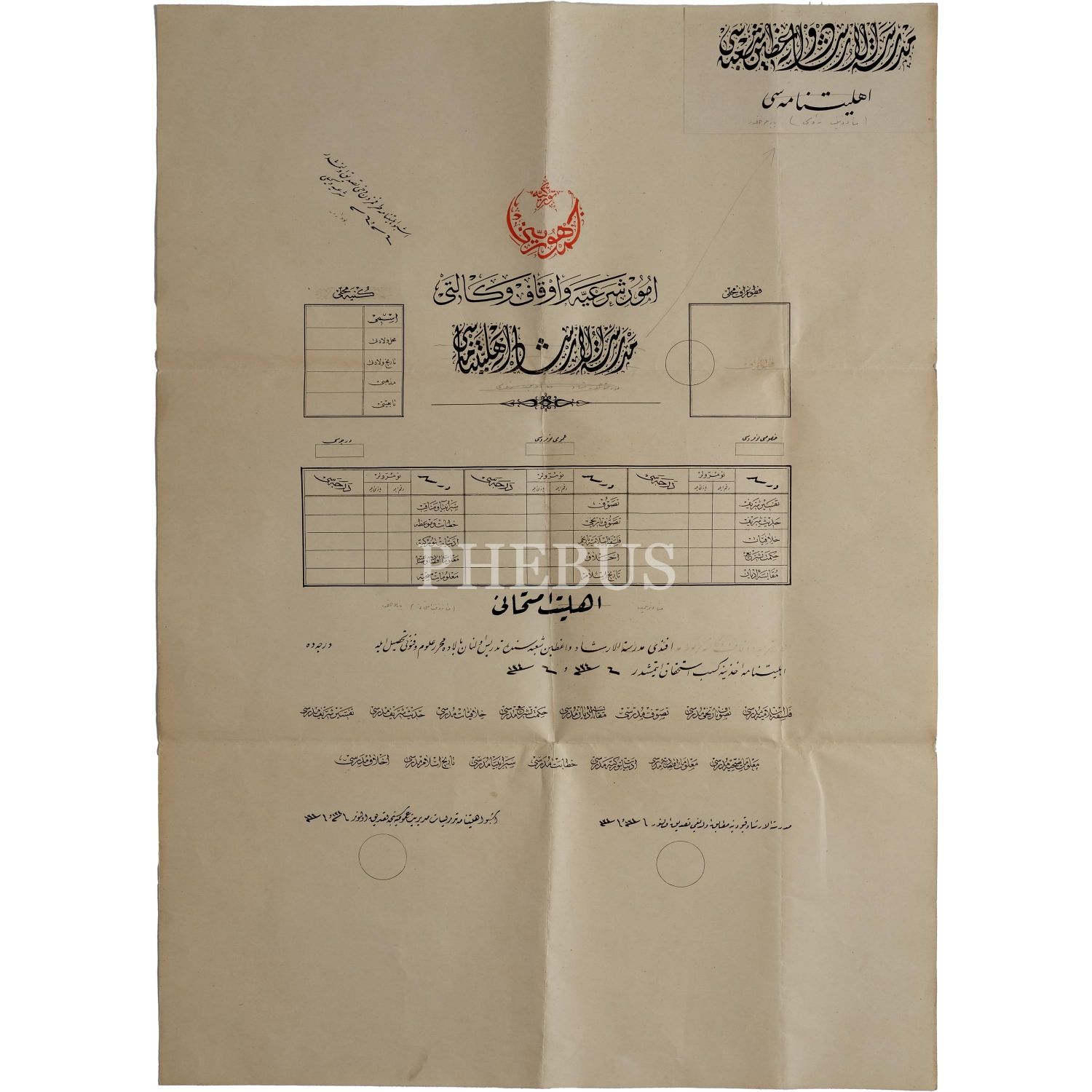 Medreset´ül İrşad´ın Vaizin Şubesi için medresenin ehliyetnamesi elle hazırlanan diploma taslağı, 59x41 cm...