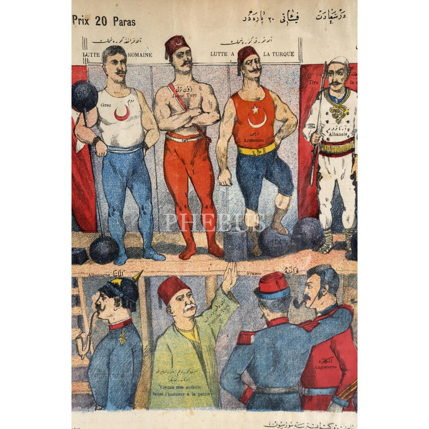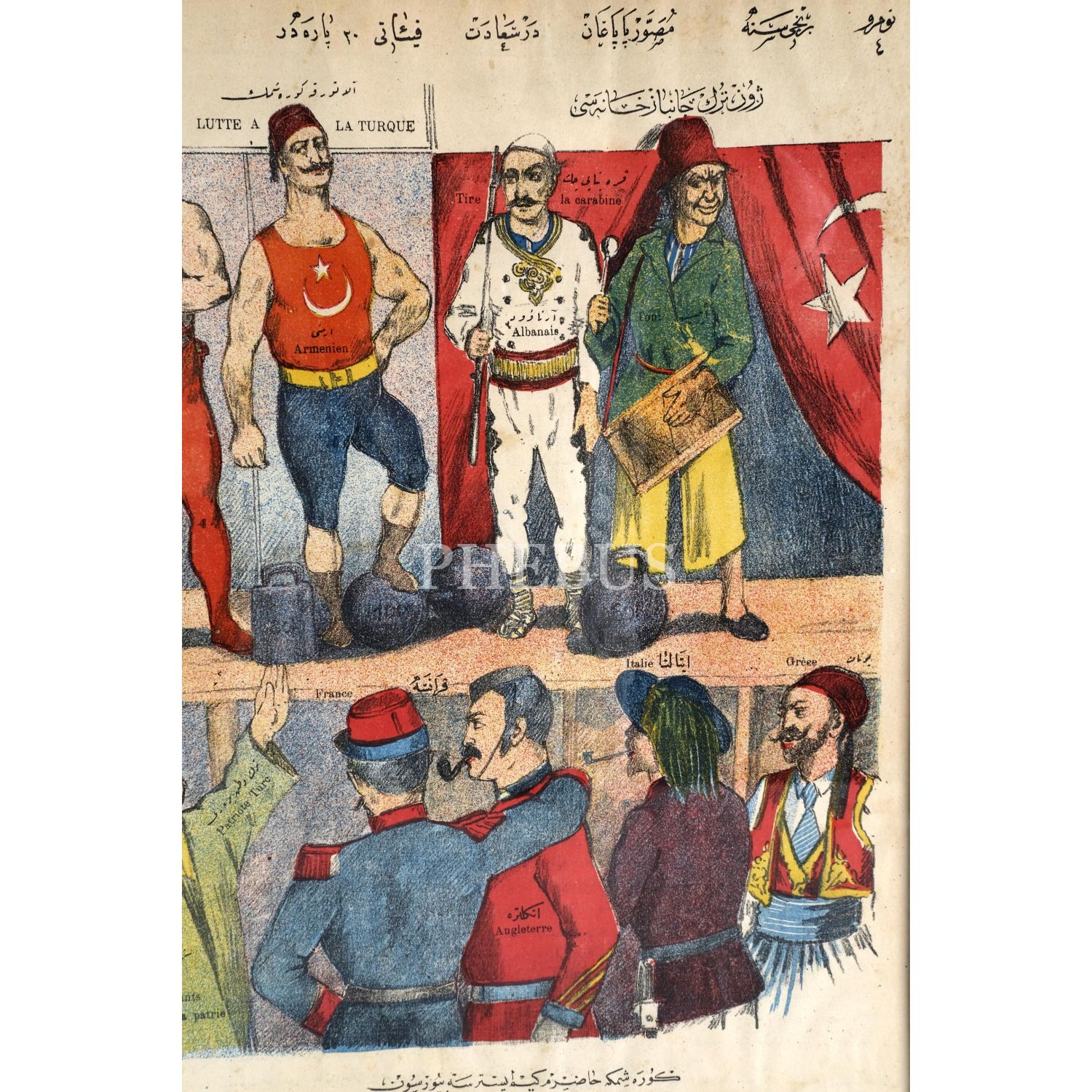 Bir sirk sahnesi ve seyirci alanı olarak tasarlanan afişte seyirciler arasında Rusya, Avusturya, Almanya, Türk vatanperveri, Fransa, İngiltere, İtalya ve Yunan varken sahnede Rum, Jön Türk ve Ermeni görülüyor. Sahnenin sağında ve solunda Musevi ve Arnavut, onların yanlarında da ibiş ve palyaço karakterleri çizilidir. Rum, elinde bir ağırlıkla ve hilalli fanila giyen bir romen/alafranga güreşçi, Ermeni de alaturka güreşçidir. Jön Türk kollarını kavuşturmuş vaziyette resmedilmiştir. Musevi davulcu, Arnavut da tüfekli olarak resmedilmiştir.