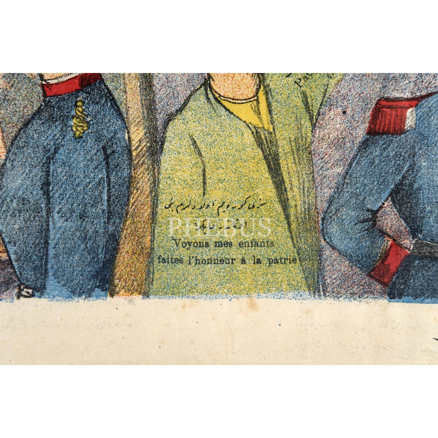 Seyircilerde Rusya ve Avusturya, İngiltere ile de Fransa ittifak halindedir. Sağ altta ve solda OsmanlıTürkçesi ve Fransızca olarak "Güreşmeye hazırım, kim isterse buyursun" yazılıdır. Vatanperver Türk de "Sizi göreyim evladlarım, beni utandırmayınız" sözleriyle tezahürat ediyor.