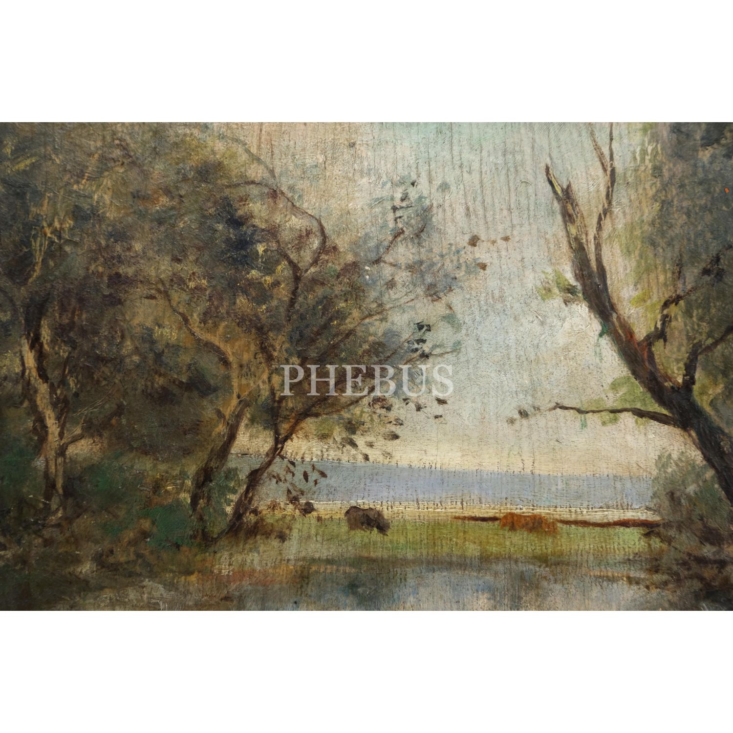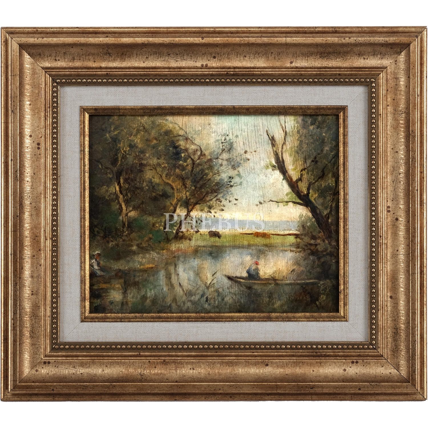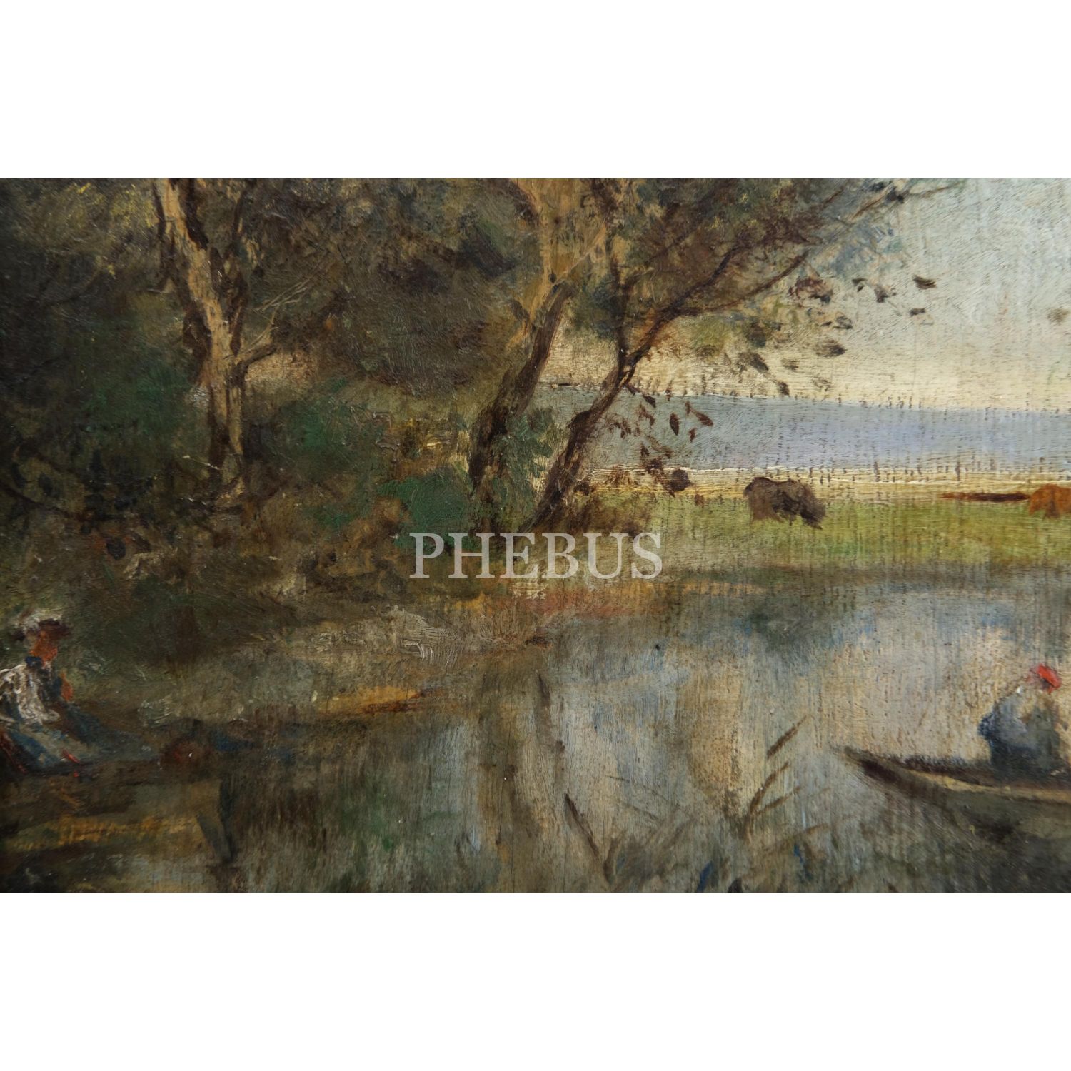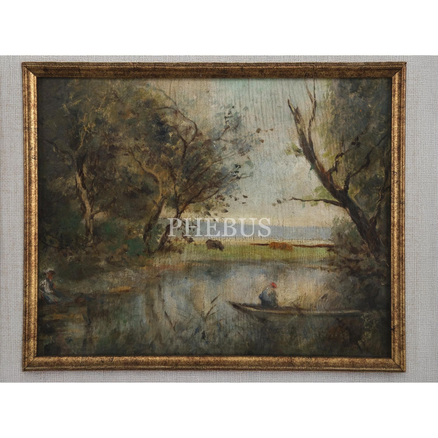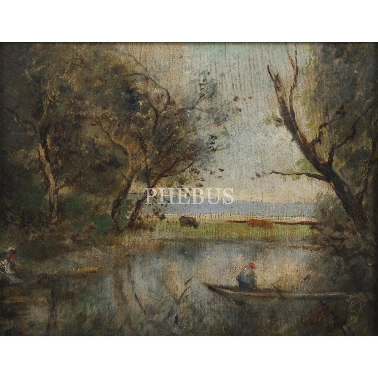 Müfide Kadri´den, kontrplak üzerine yağlıboya peyzaj (Göl Kenarında Kadın ve Kayıkçı), 18x23 cm...