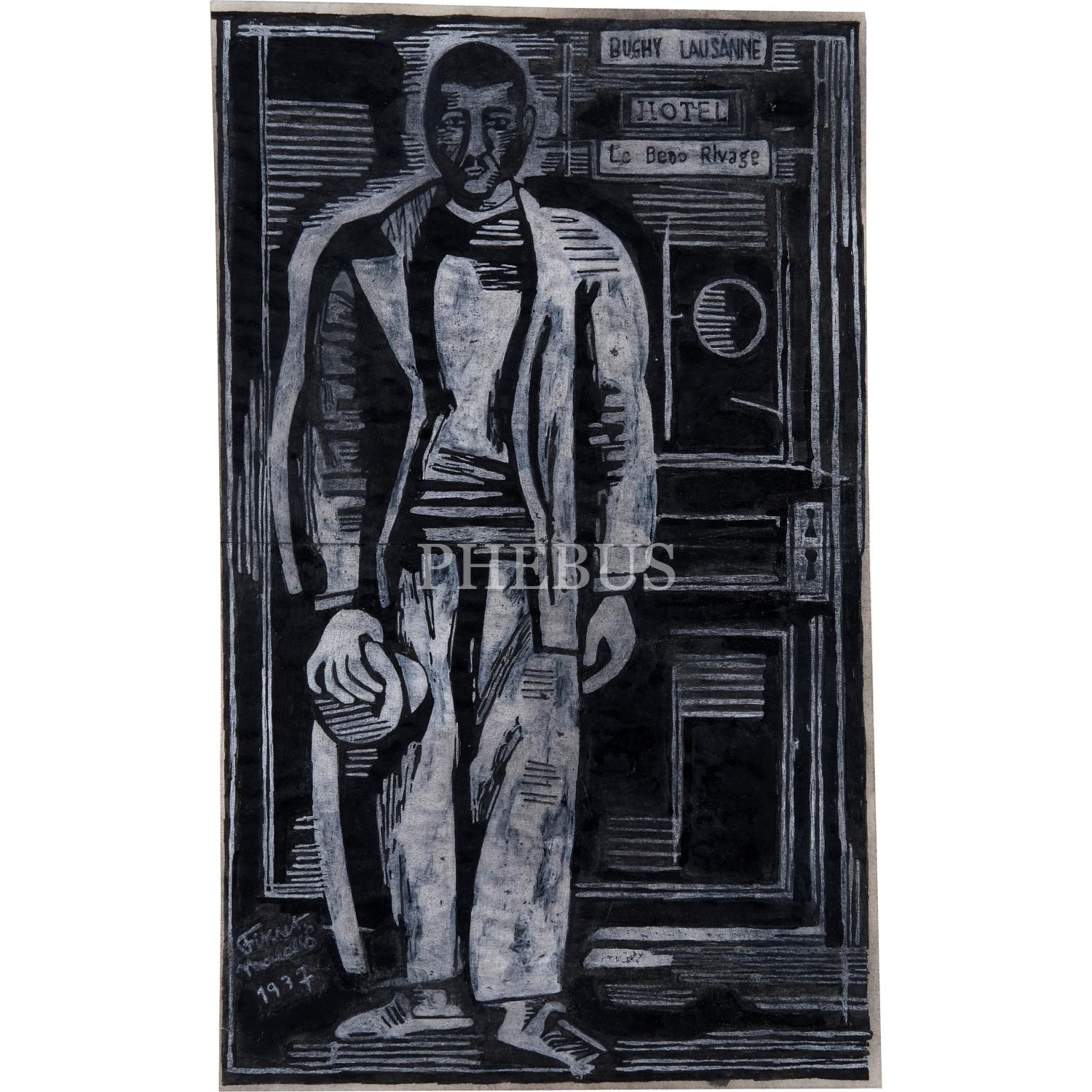 Fikret Mualla imzalı, kağıt üzerine siyah mürekkep ve beyaz pastelle insan figürü çizimi, 1937, 17x28 cm...