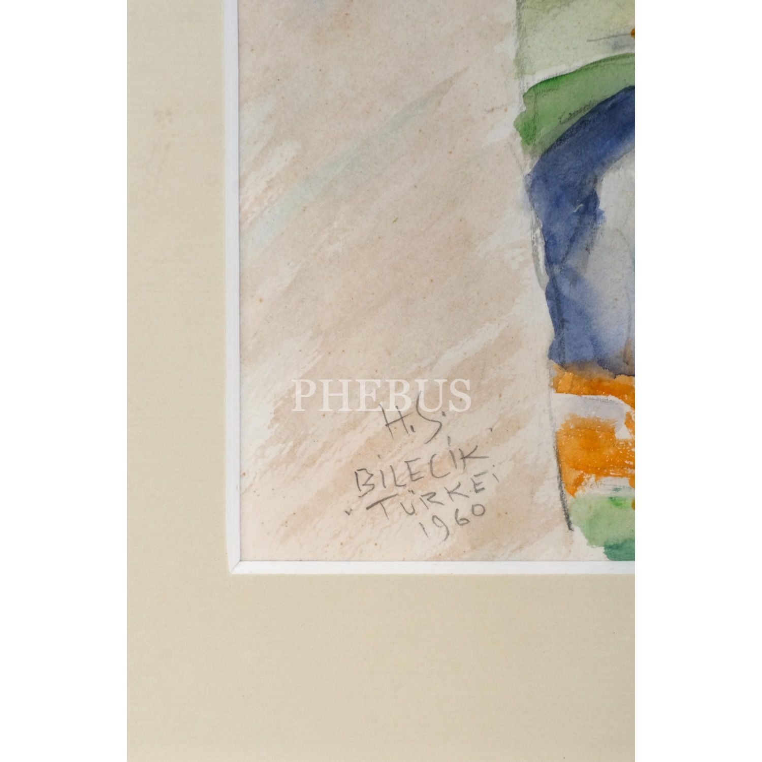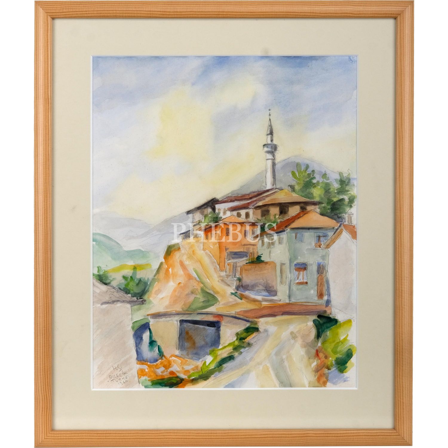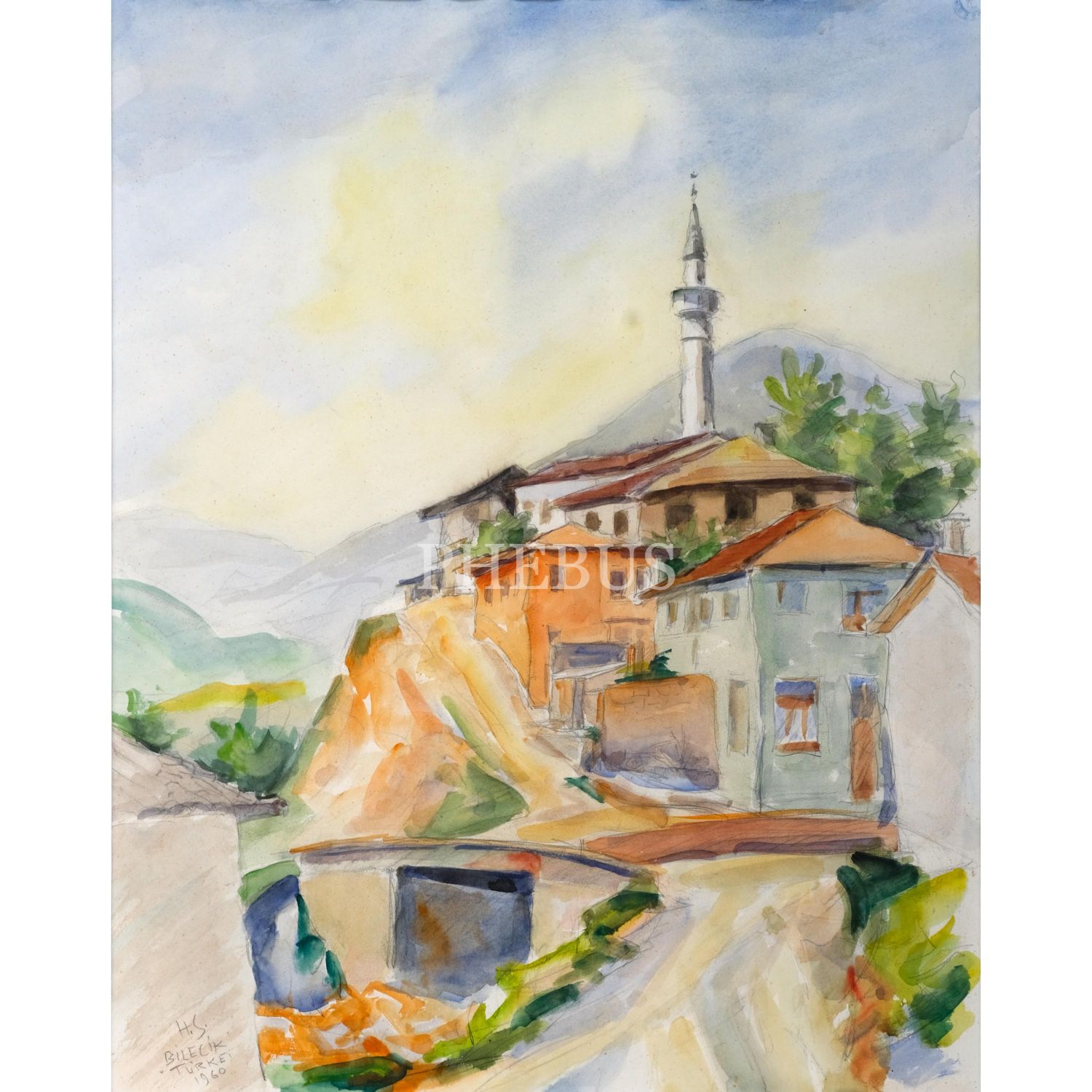 H.S. imzalı, Bilecik´ten bir manzaranın resmedildiği suluboya tablo, 1960, 38x48 cm...