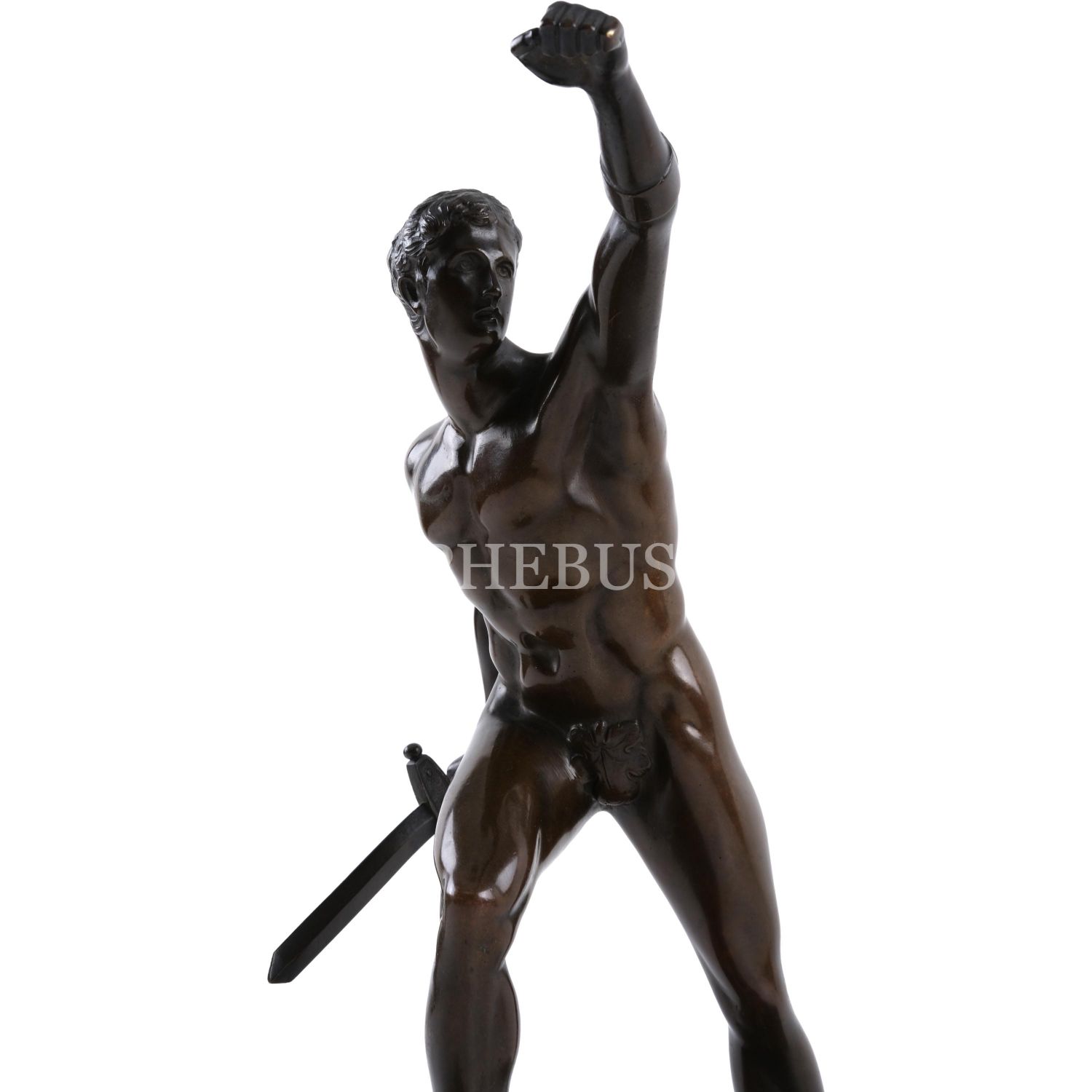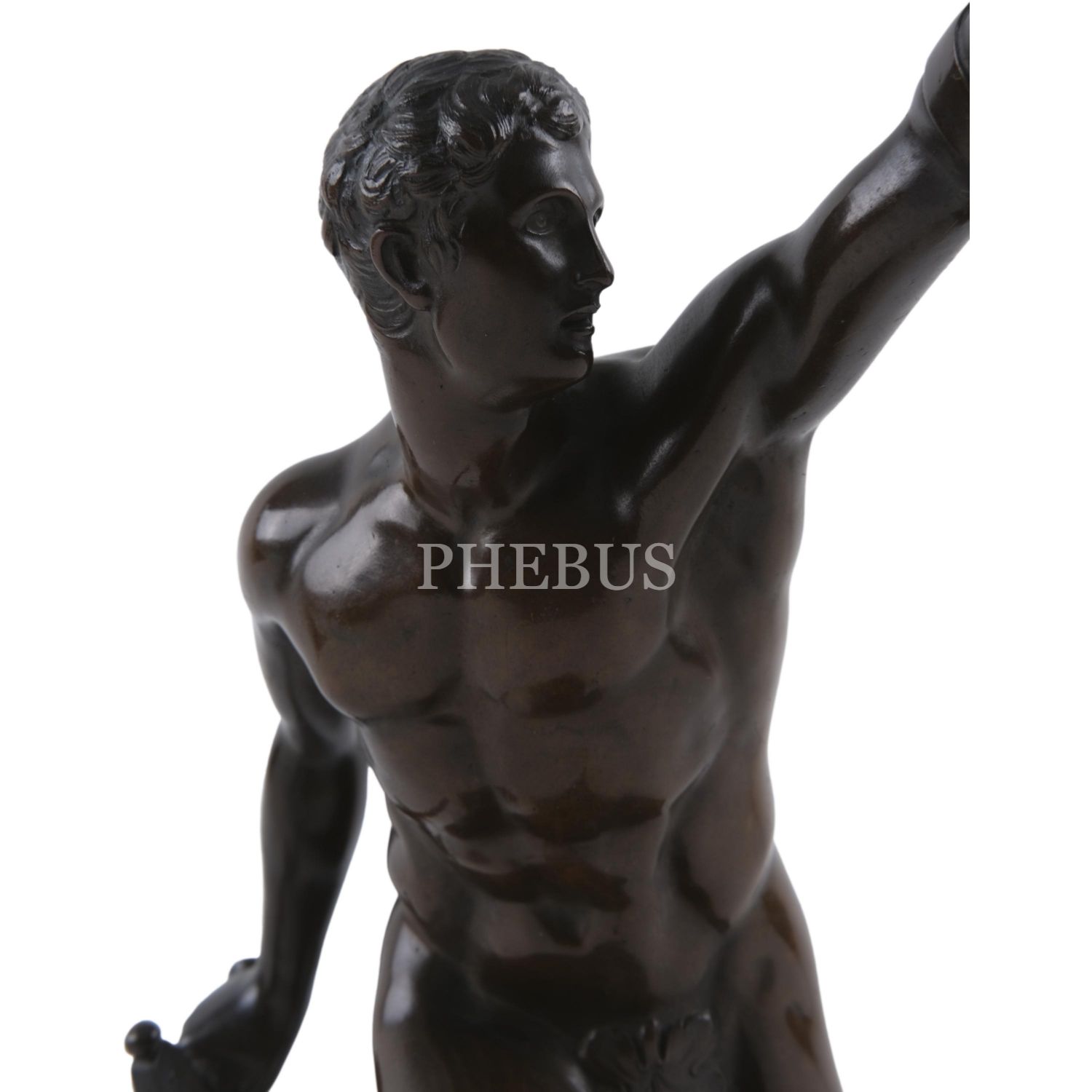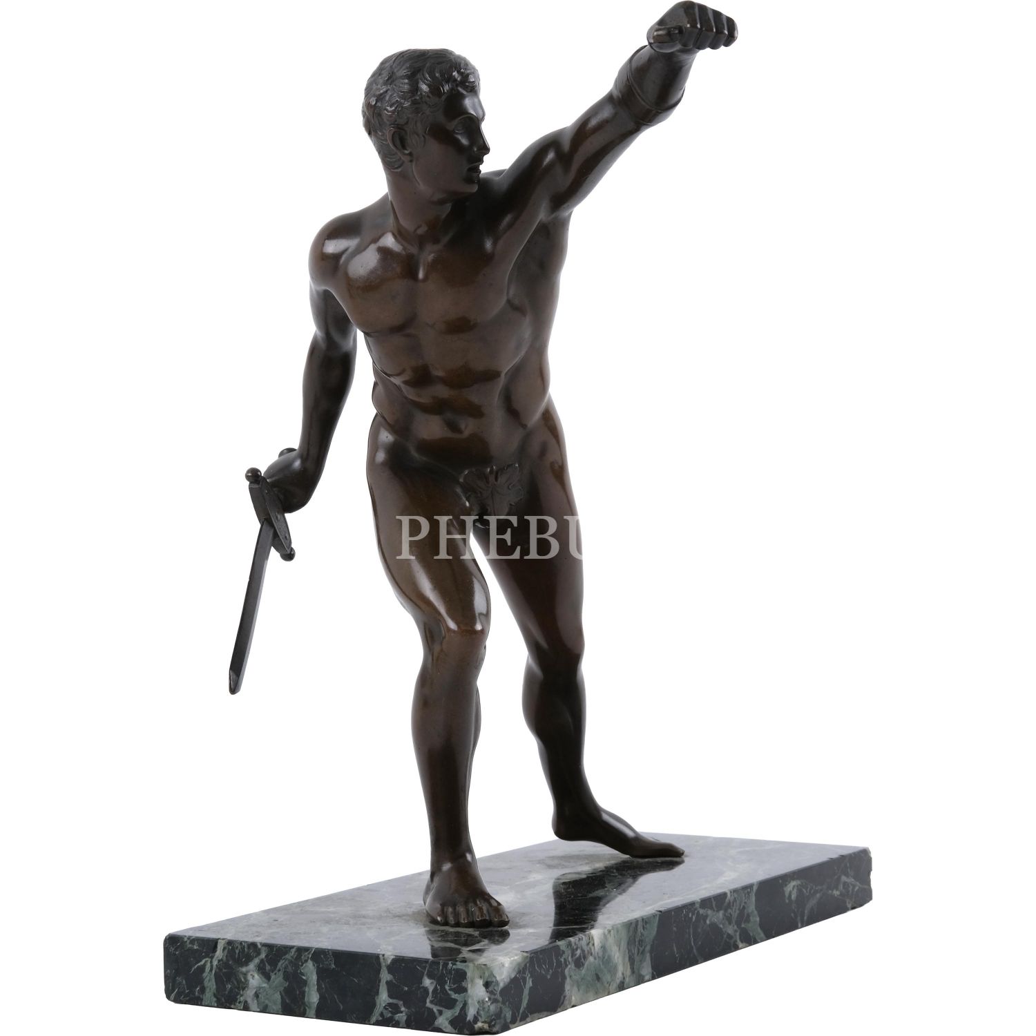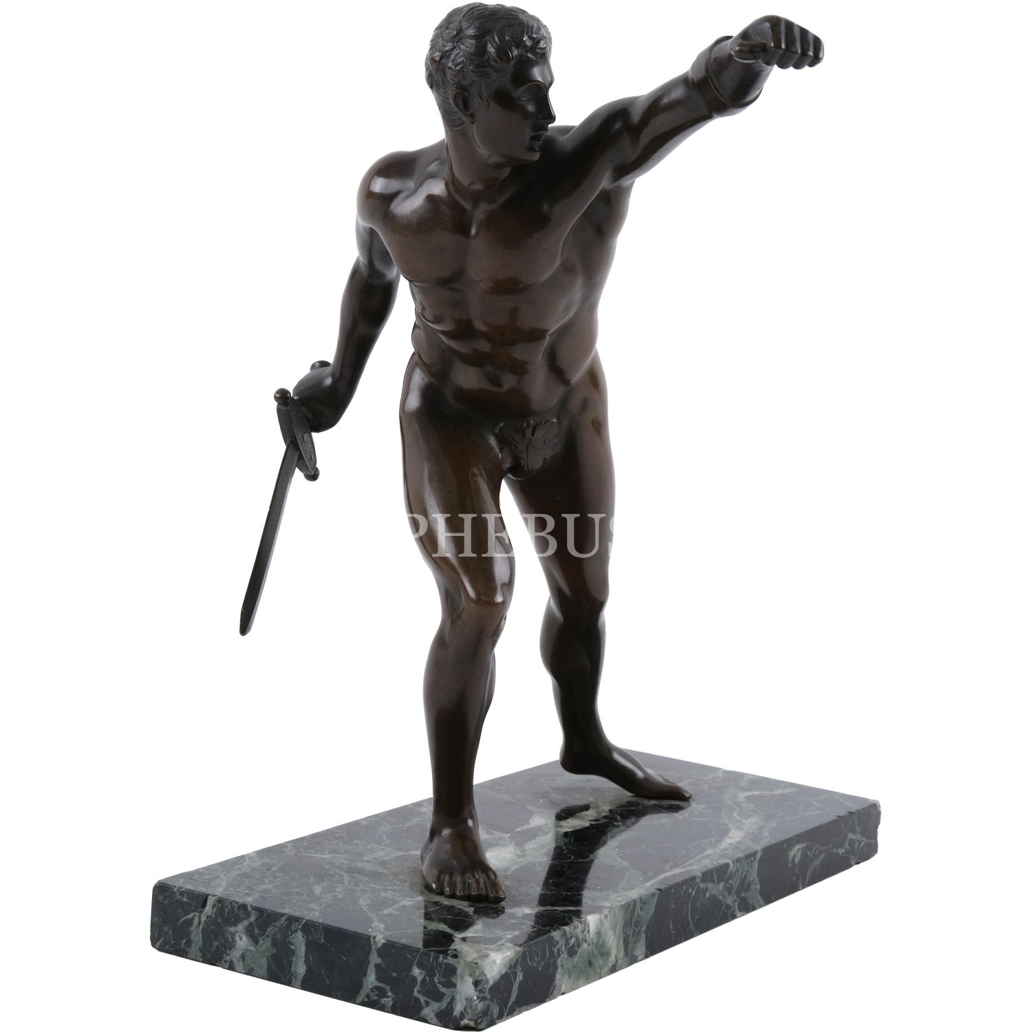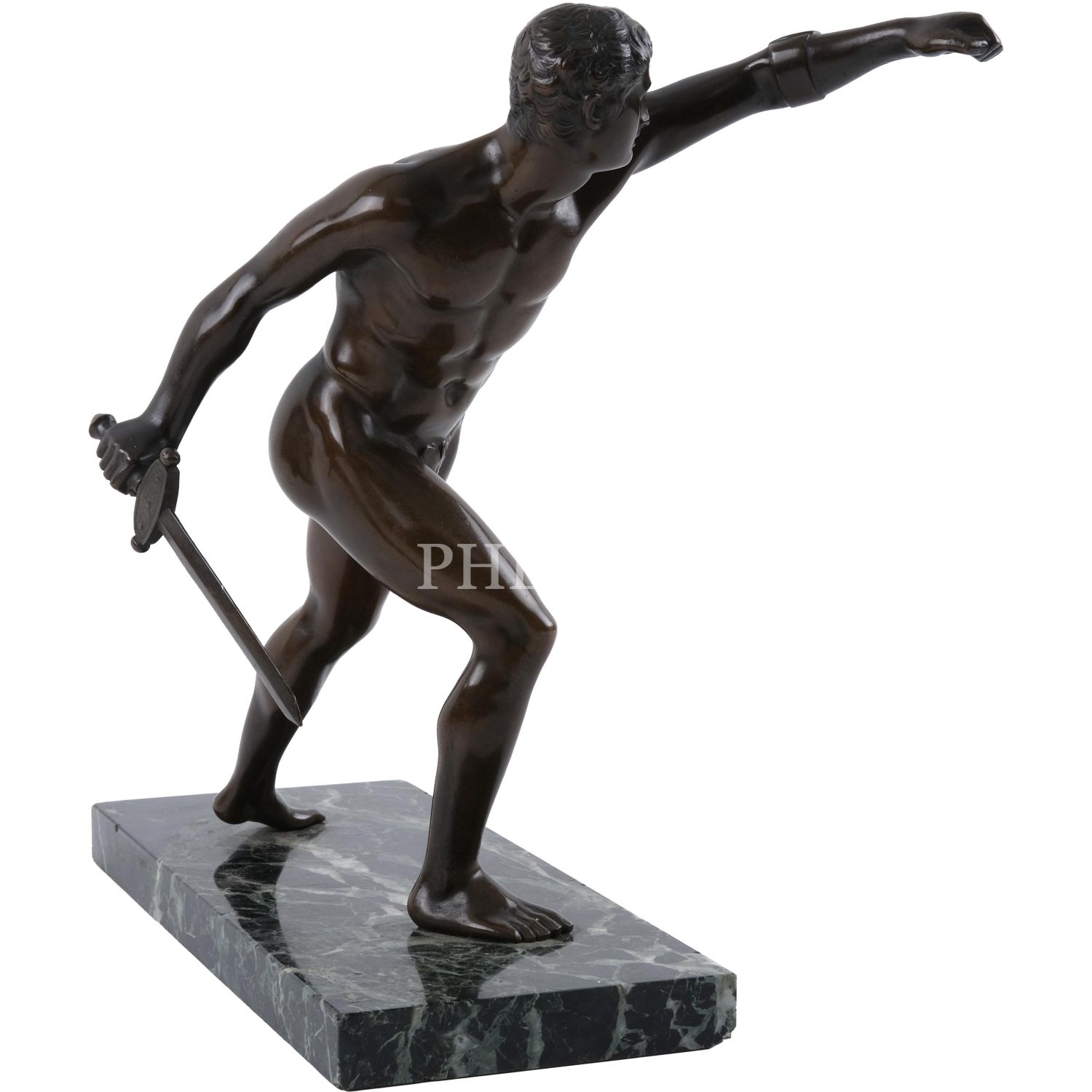 Mermer kaide üzerine konumlandırılmış, nü savaşçı formunda bronz heykel, 24x28x10 cm...