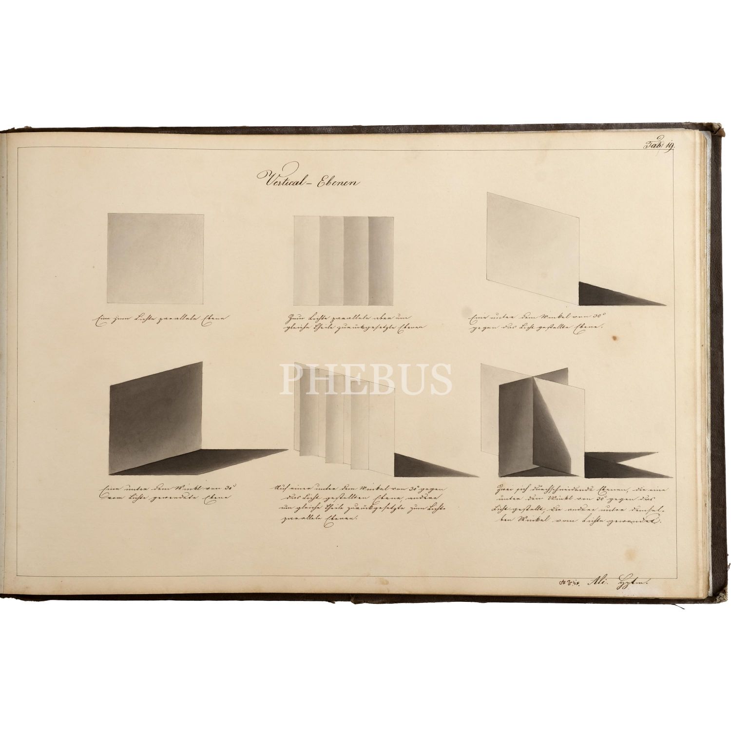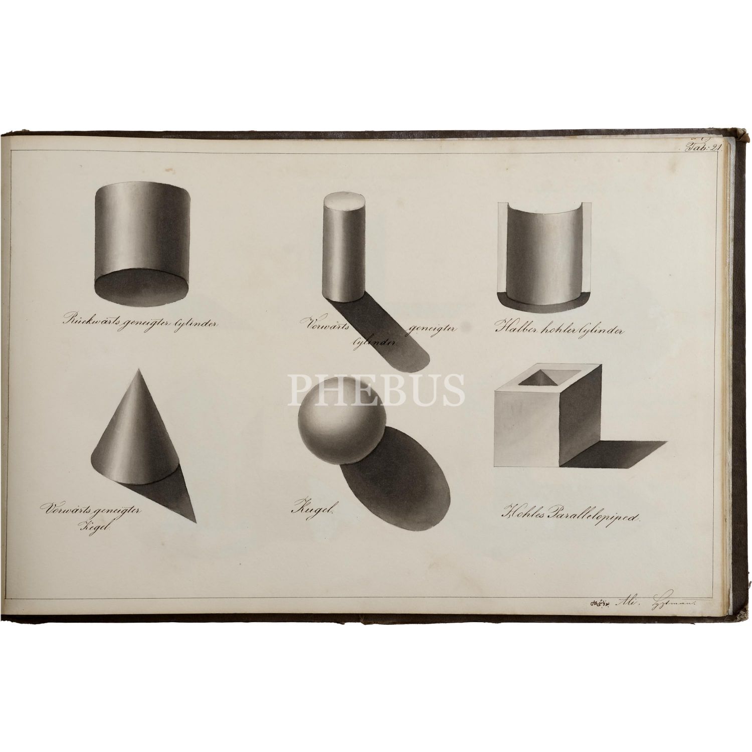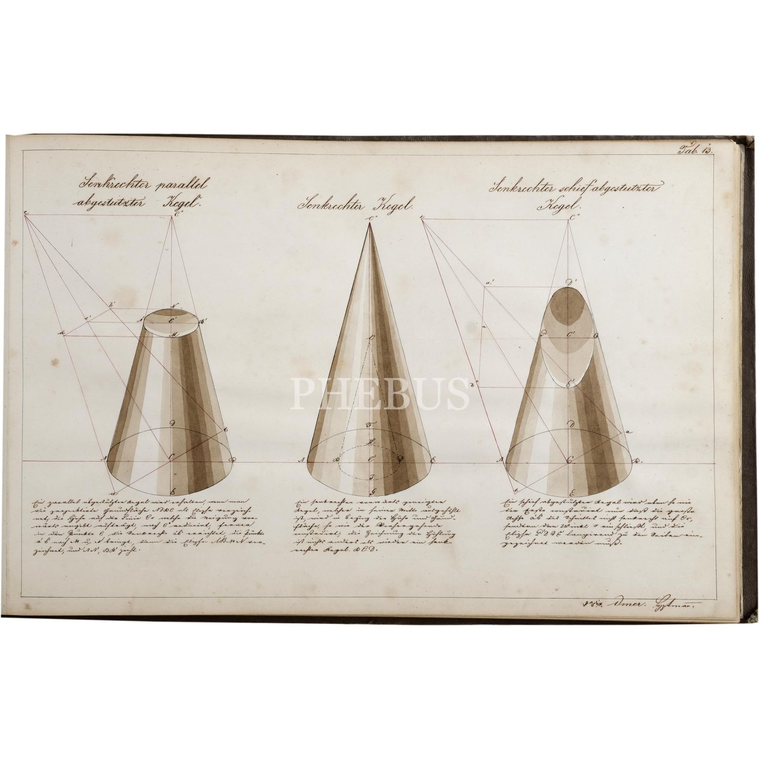 LINIEN-FLÄCHEN-KÖRPER UND GESCHÜTZ- ZEICHNUNGEN (Geometrik Hacim ve Silah Çizimleri) başlığıyla ciltlenmiş, Harbiye Mektebi öğrencileri ve mektep müdürü İbrahim Efendi, Yüzbaşı Hüseyin Efendi, Yüzbaşı Ahmed Sırrı Efendi ve Yüzbaşı Mustafa Efendi´ye ait üç boyutlu teknik ve savaş topu gibi silah üretimi konulu çizimlerden oluşan çizim defteri, 53 sayfa, 48x32 cm...