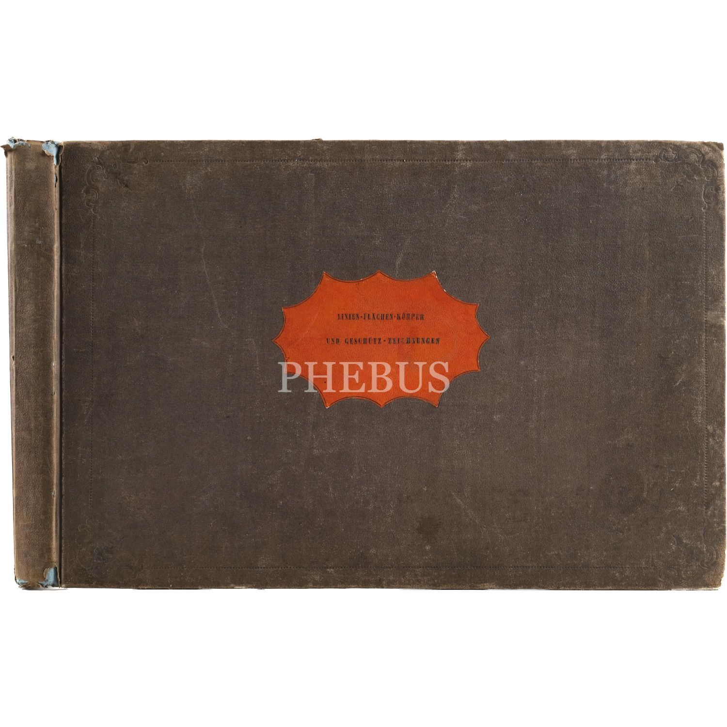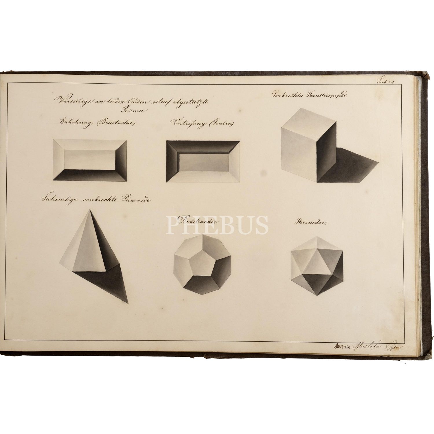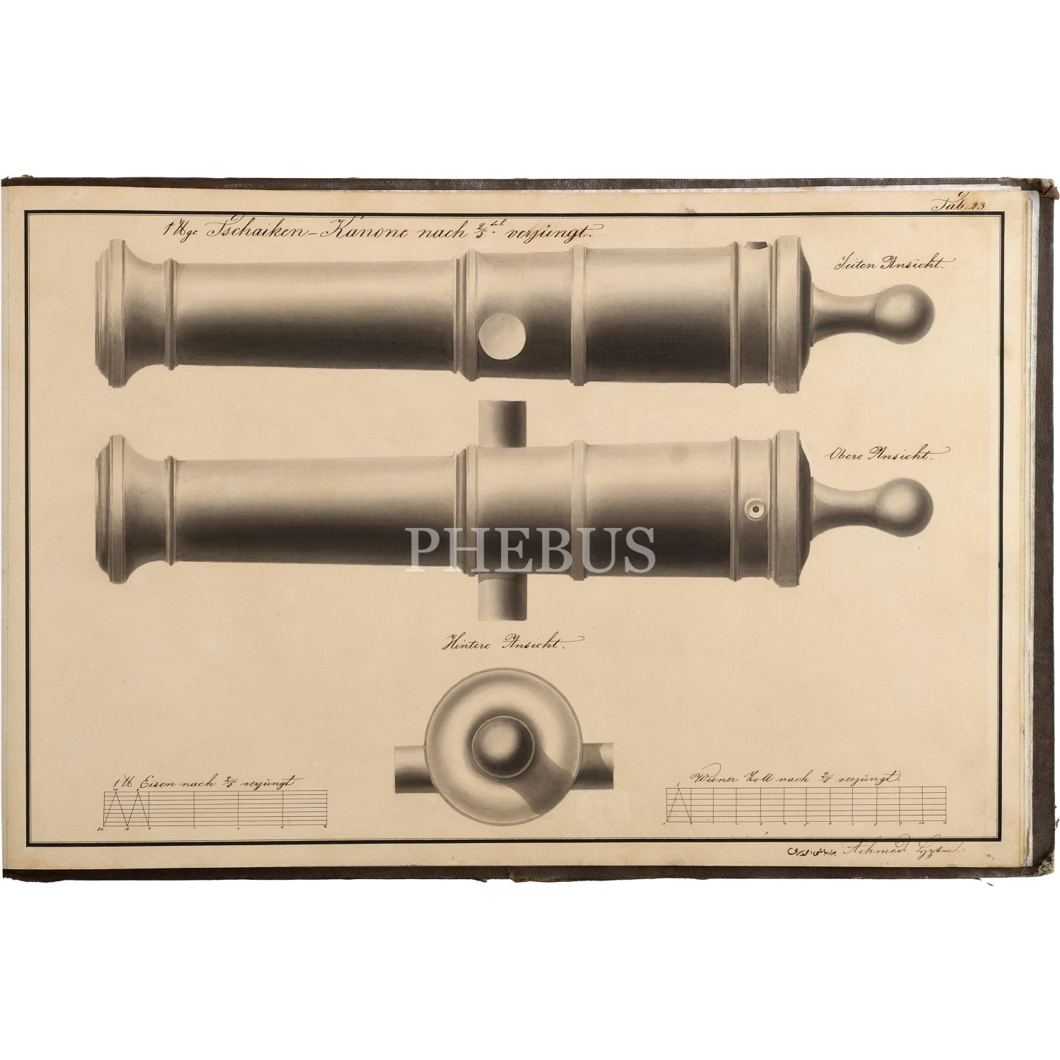 LINIEN-FLÄCHEN-KÖRPER UND GESCHÜTZ- ZEICHNUNGEN (Geometrik Hacim ve Silah Çizimleri) başlığıyla ciltlenmiş, Harbiye Mektebi öğrencileri ve mektep müdürü İbrahim Efendi, Yüzbaşı Hüseyin Efendi, Yüzbaşı Ahmed Sırrı Efendi ve Yüzbaşı Mustafa Efendi´ye ait üç boyutlu teknik ve savaş topu gibi silah üretimi konulu çizimlerden oluşan çizim defteri, 53 sayfa, 48x32 cm...
