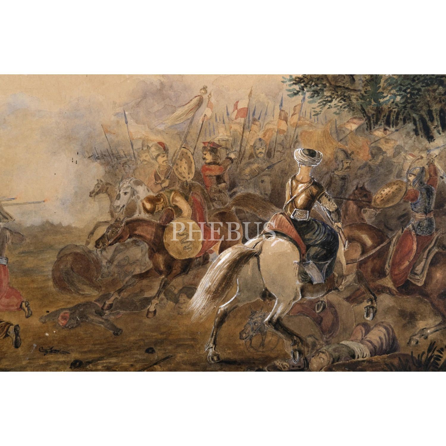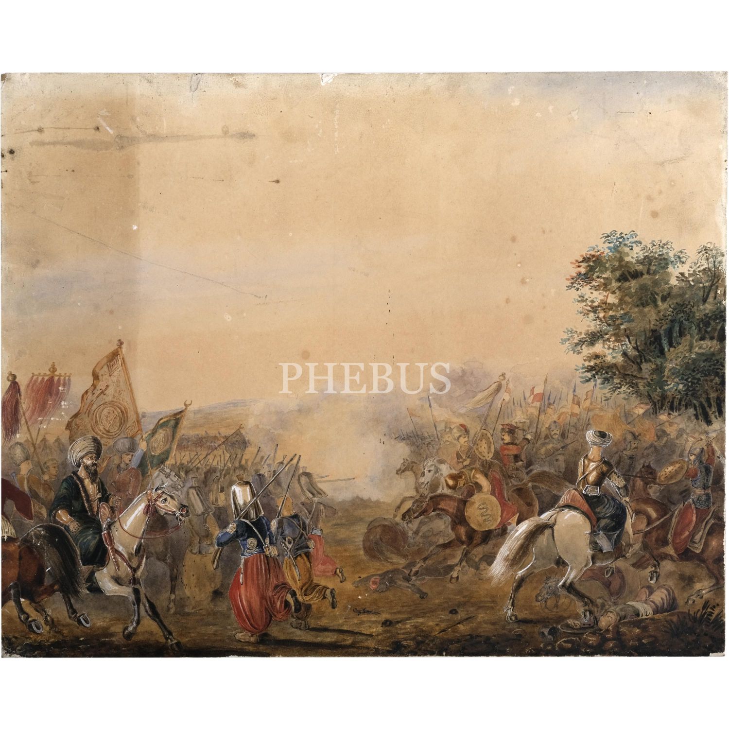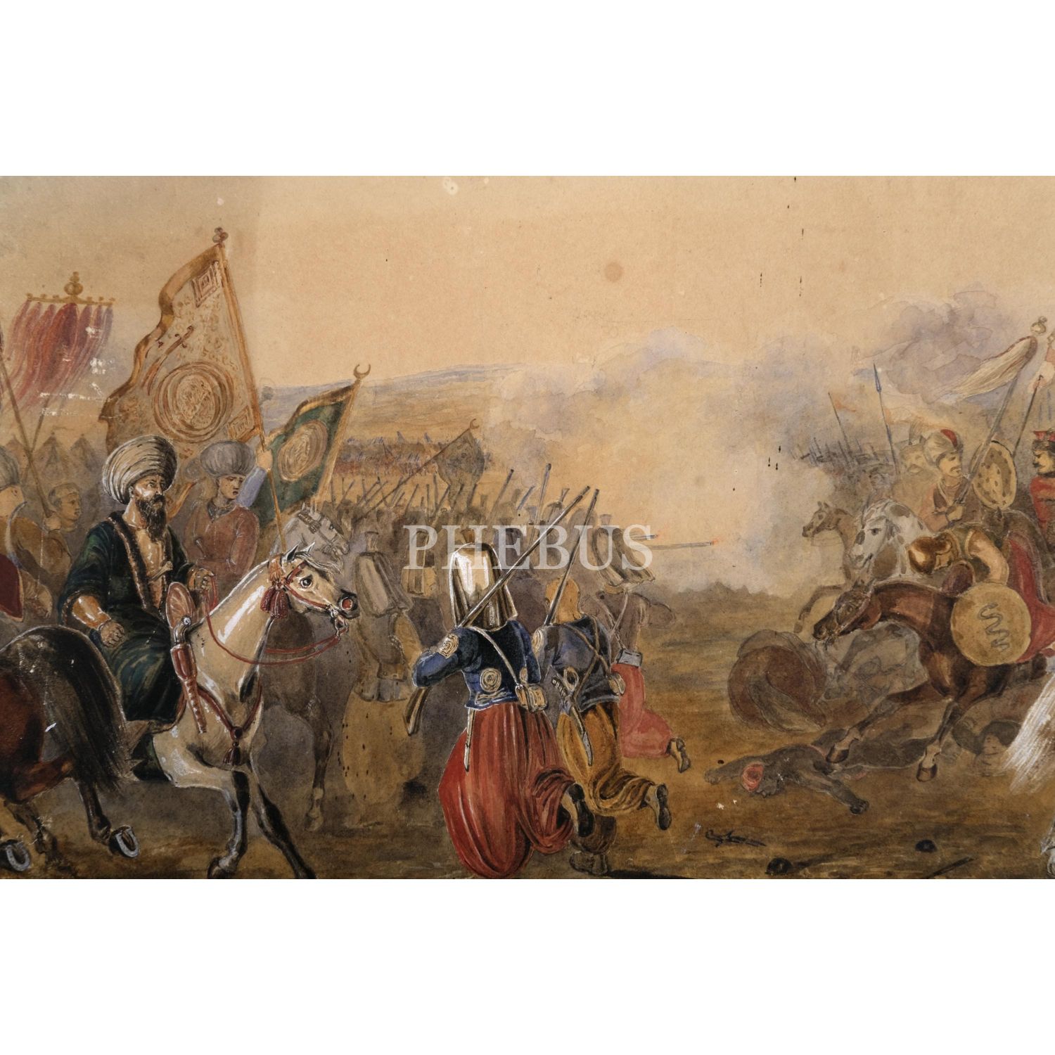 Osmanlı’nın Habsburg ordularına karşı bir muharebesinin betimlendiği karton üzerine guaj boya resim, 46x38 cm...